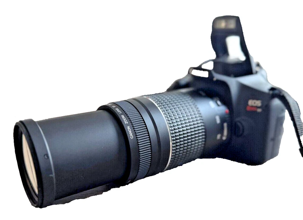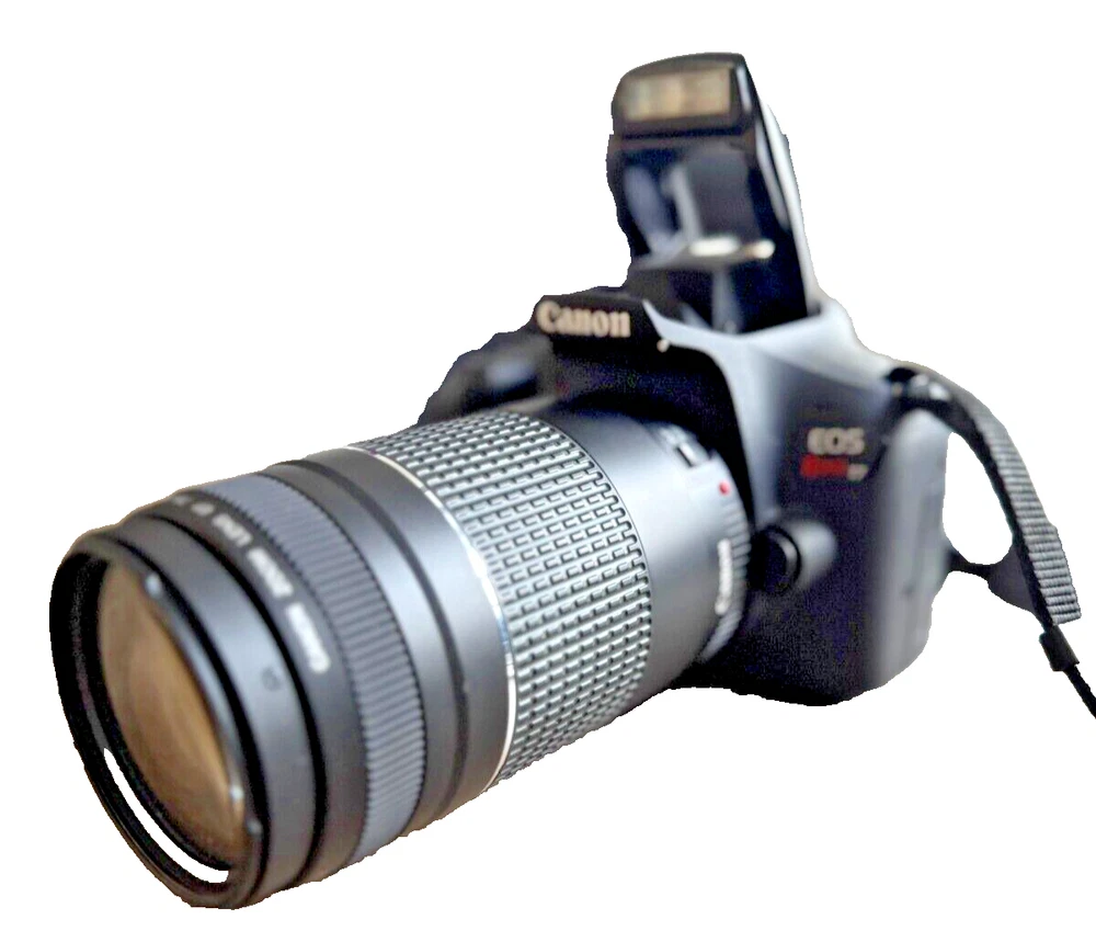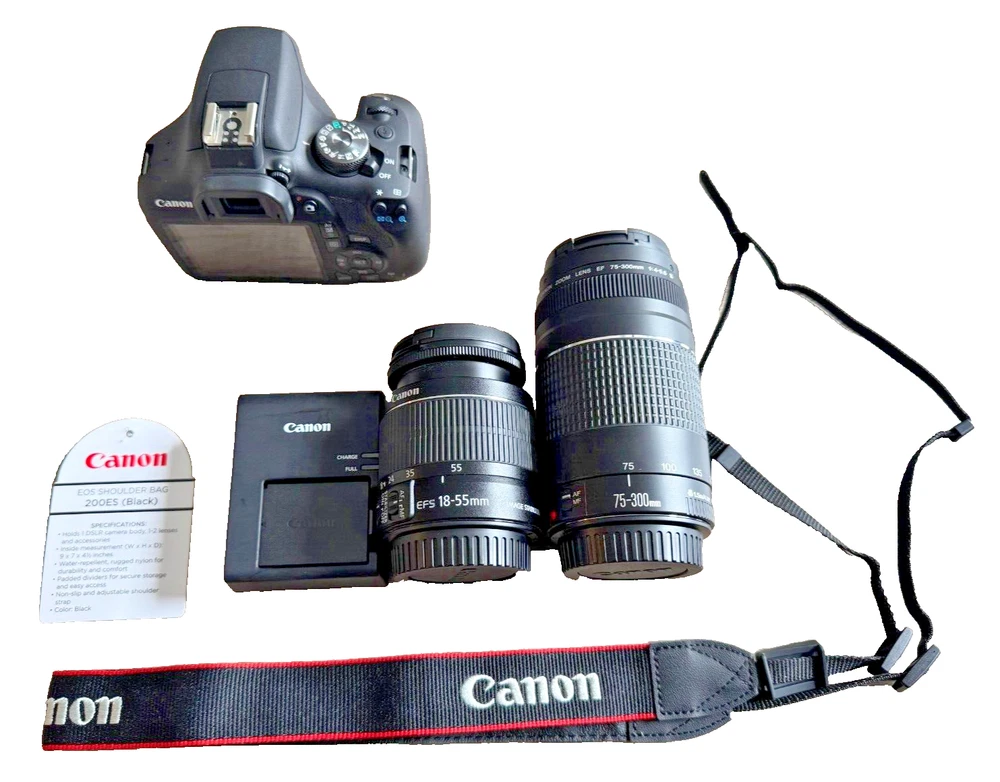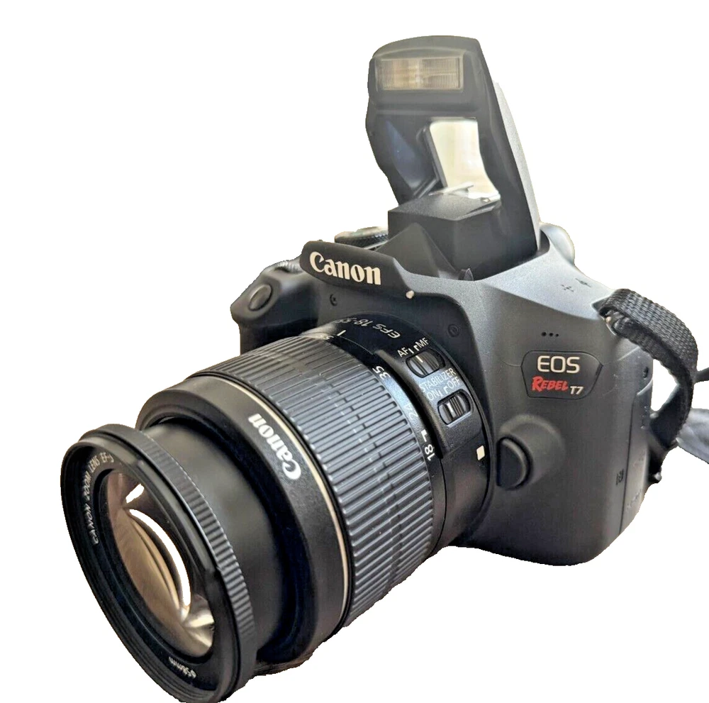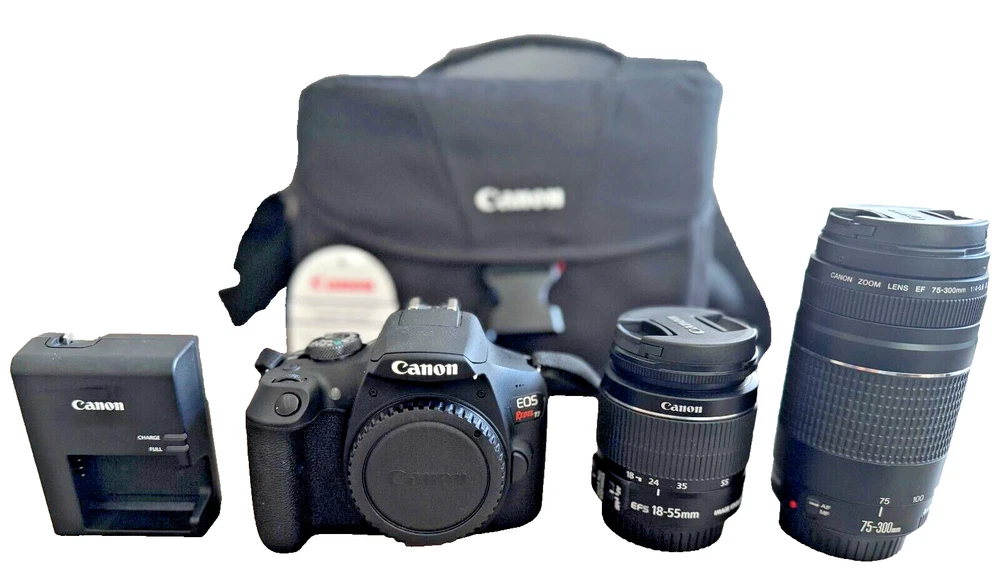 Rarely used Canon EOS Rebel T7 digital camera kit. The camera boasts a 24.1MP maximum resolution and a 3x optical zoom, allowing you to get up close to your subject and take stunning pictures. The camera features a built-in flash, viewfinder, and exposure compensation, making it perfect for both novice and experienced photographers.Additionally, the camera has red-eye reduction, auto-focus, and 1080i HD video recording capabilities. It comes with an 18-55mm and 75-300mm lens, a bag, and accessories such as USB, remote control, and mini-HDMI. The camera is black in color, weighs 15.06 Oz., and runs on lithium-ion batteries. Perfect for anyone who loves photography, this Canon EOS Rebel T7 is a must-have for your collection.