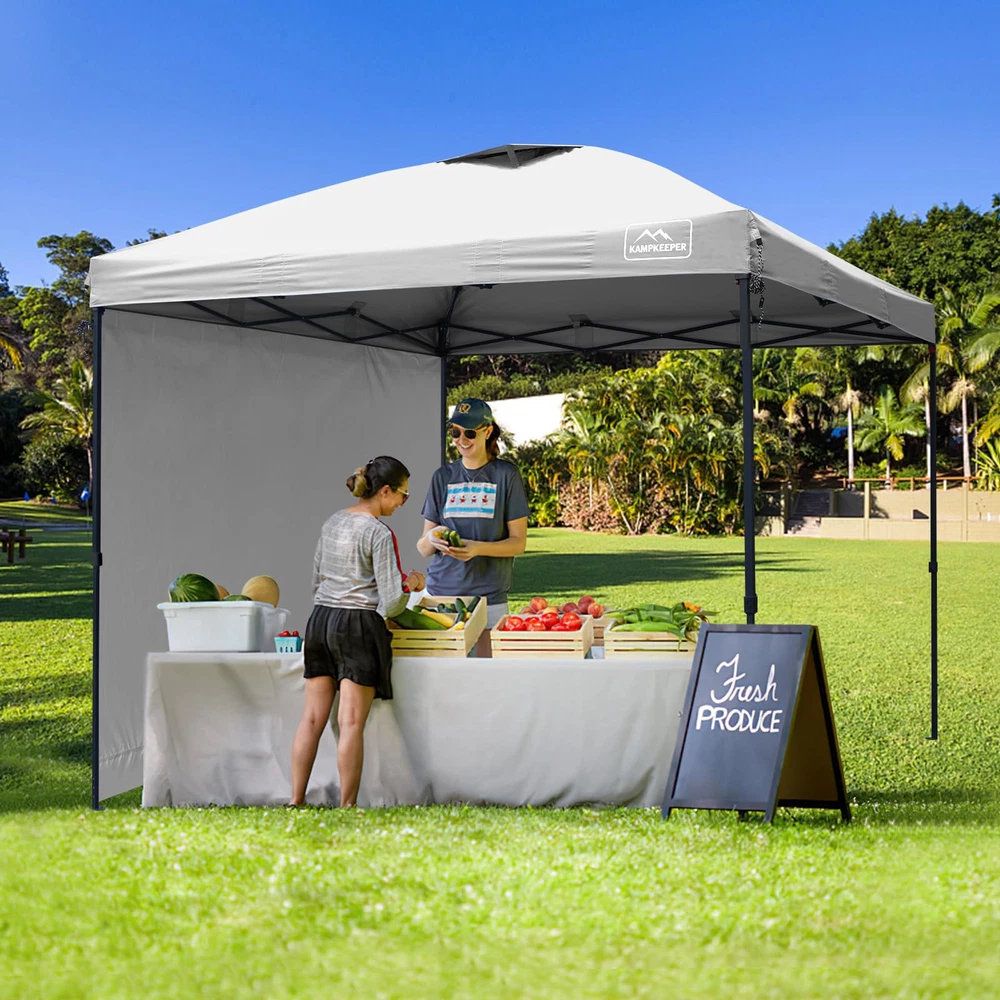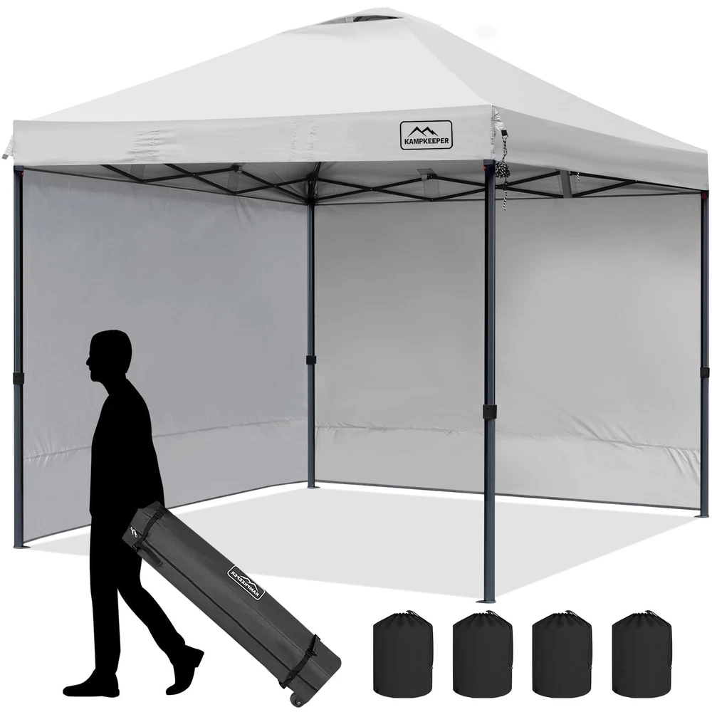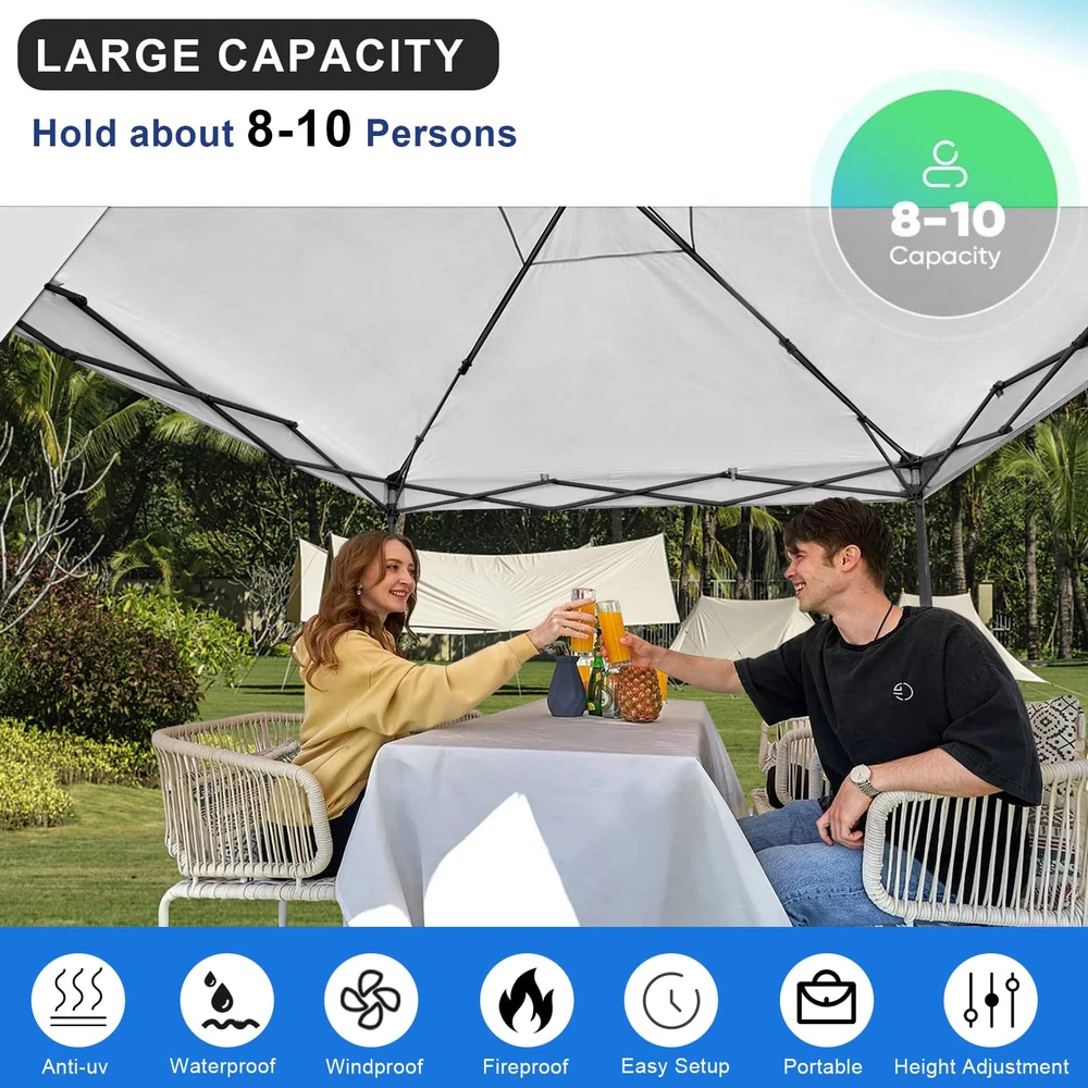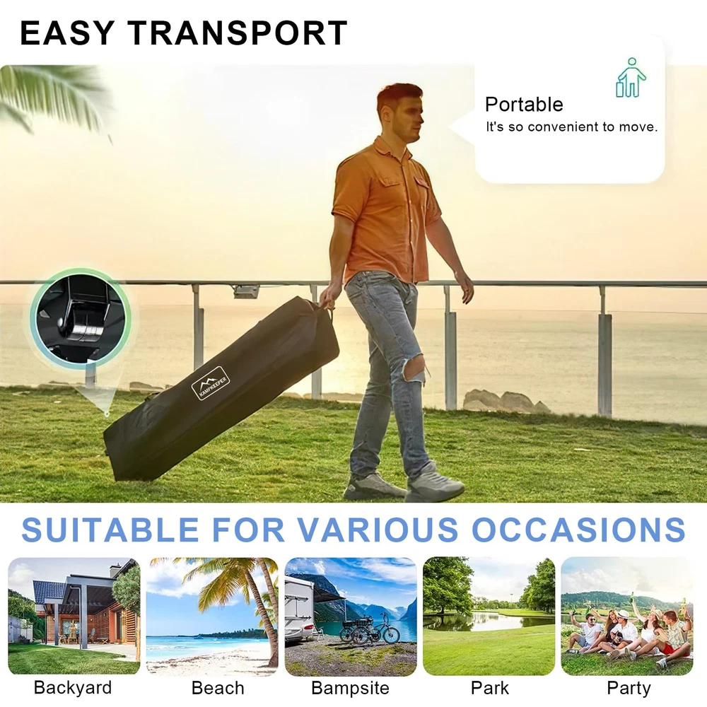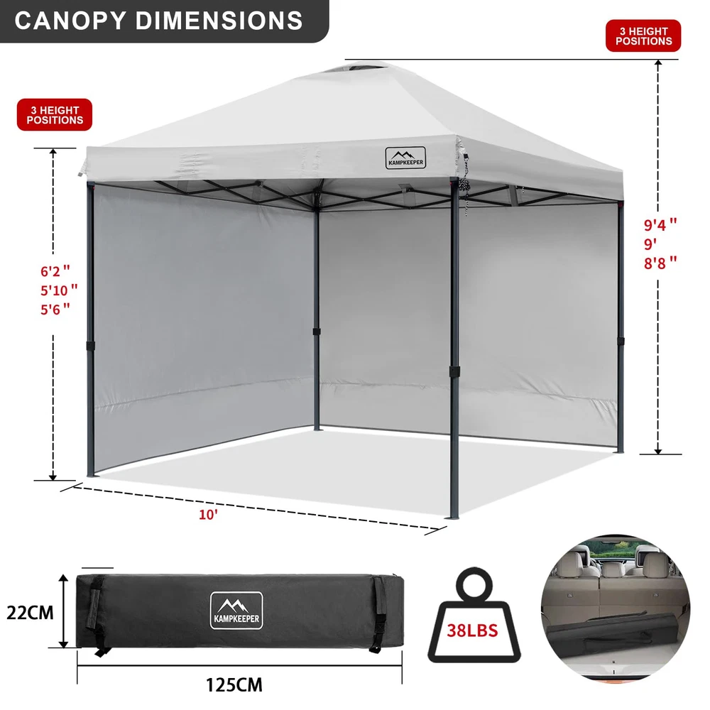 10x10 FT LARGE CAPACITY - Our outdoor 10ft pop up canopy provides 100 square feet of shade for about 10-14 people. 3 adjustable heights up to 9ft from floor to roof. Sturdy and Solid - The canopy tent frame is made of high quality steel and powder coated for rust resistance,High strength forging process with thickened walls, Not easy to break or deform and extra durability to give you better stability. Waterproof and sunshade - Its PU-coated 210D polyester roof and a basis weight of 160g/㎡ provides UPF 50+ UV protection effectively protect you from the sun.The CPAI-84 rated flame resistant fabric is water repellant and includes waterproof sealing tape to protect against water pooling in wet conditions. MULTIPLE USE OCCASIONS - Suitable for business, beach, party, camping, patio, gymnasium, Parking shed, and any other kind of outdoor sports. Can be installed with or without 2 tarp sidewalls according to different occasions, convenient and practical. Package contents - 1 x pop up tent, 2 sidewalls, 4 sandbags, 4 pegs, 4 x ropes, 1 carrying bag and 1 set of assembly instructions. PLEASE NOTE: This Pop UP Gazebo is not intended for use unattended or in inclement weather. makes a promise: In case of damage to accessories during use, please contact us in time, we will make action within 24 hours! NOTICE: The matching canopy roller bags and 4 sandbags may be NAVY BLUE or BLACK in color. Please Noticed!!!!