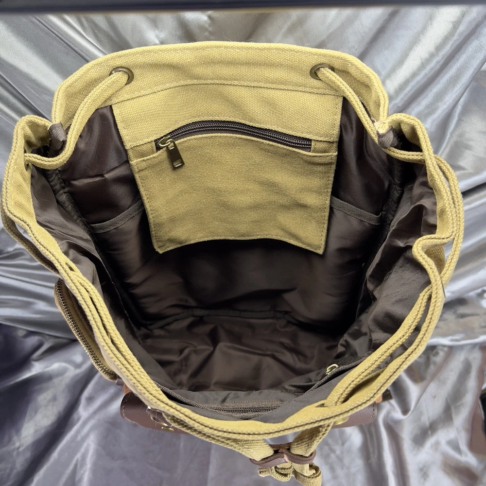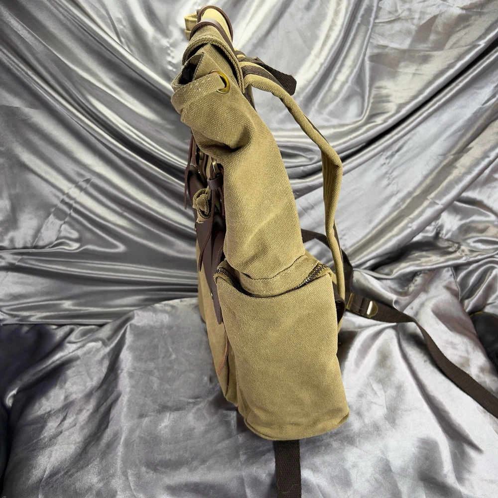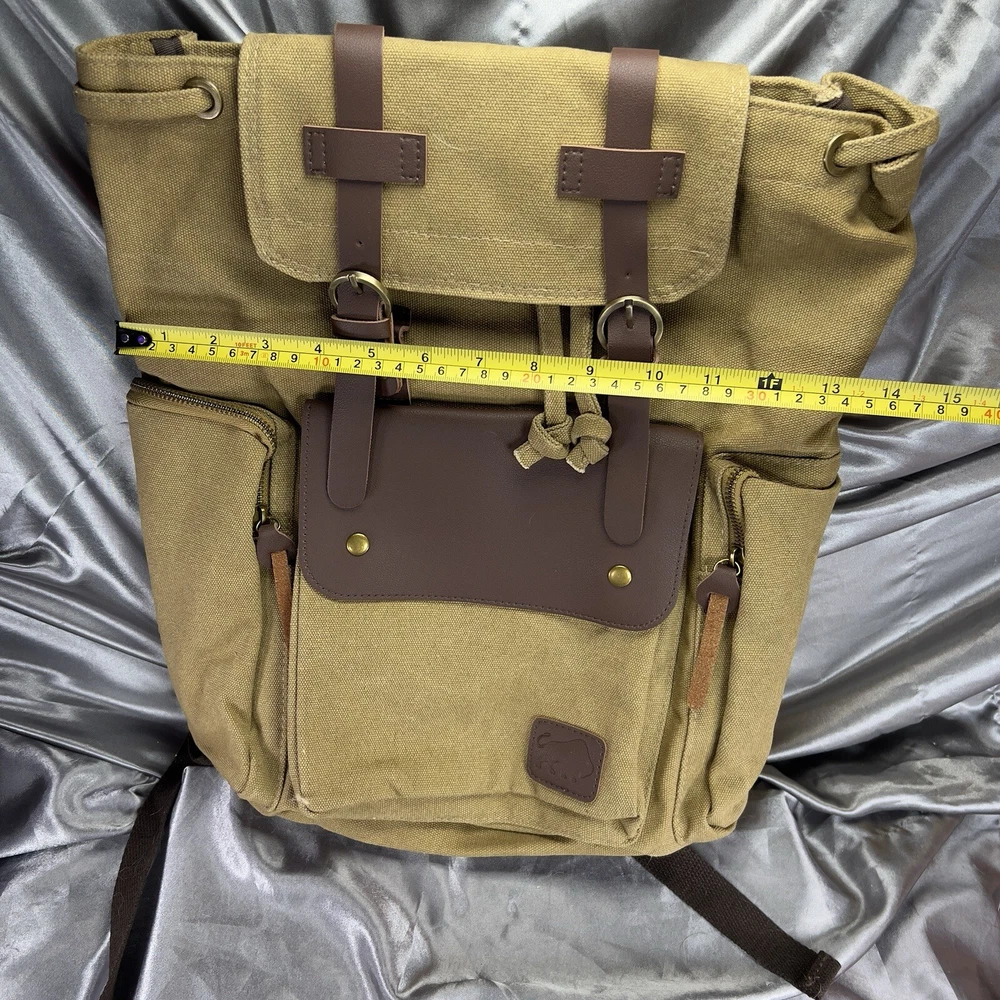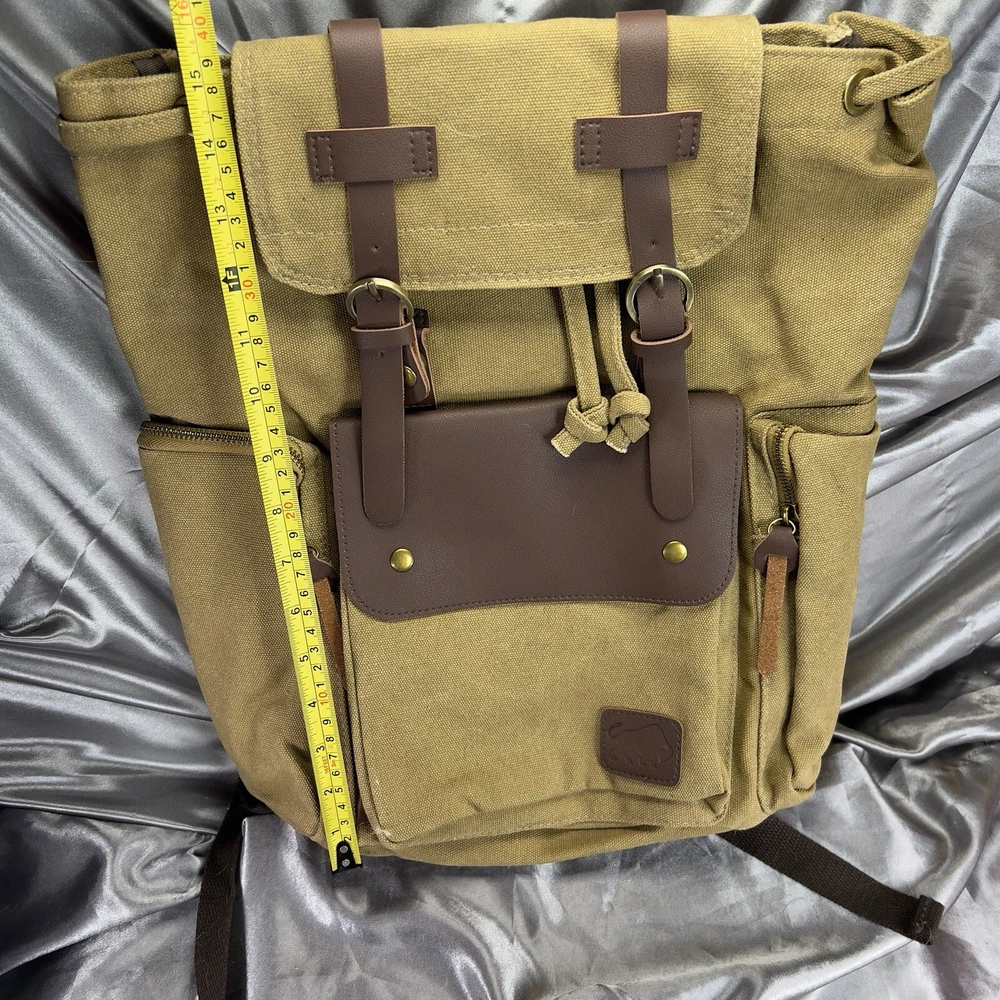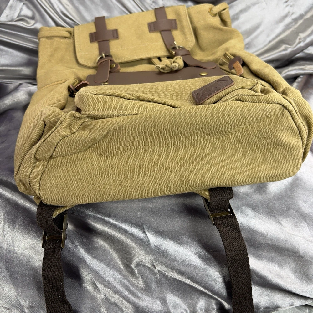 Handle/Strap Material: Leather Size: Large Closure: Buckle, Magnetic Material: Canvas, Leather Department: Men Bag Height: 15 in Style: Backpack Features: Adjustable Strap, Inner Pockets, Inner Dividers, Laptop Sleeve/Protection, Lightweight, Lined, Outer Pockets, Packable, Pockets Color: Tan Brown Beige Pattern: Solid Brand: Book Seller Notes: “New without tags, unused or worn. See photos & video ❤️‍ 🙂” Bag Width: 14 in Theme: Army, Bohemian, Christmas, Classic, College, Dad, Geek, Hippie, Hipster, Holiday, Nature, Outdoor, Preppy, School, Teacher, University, Minimalist, Travel, Vacation, Gifts Occasion: Travel, Casual Fabric Type: Canvas