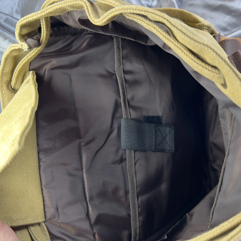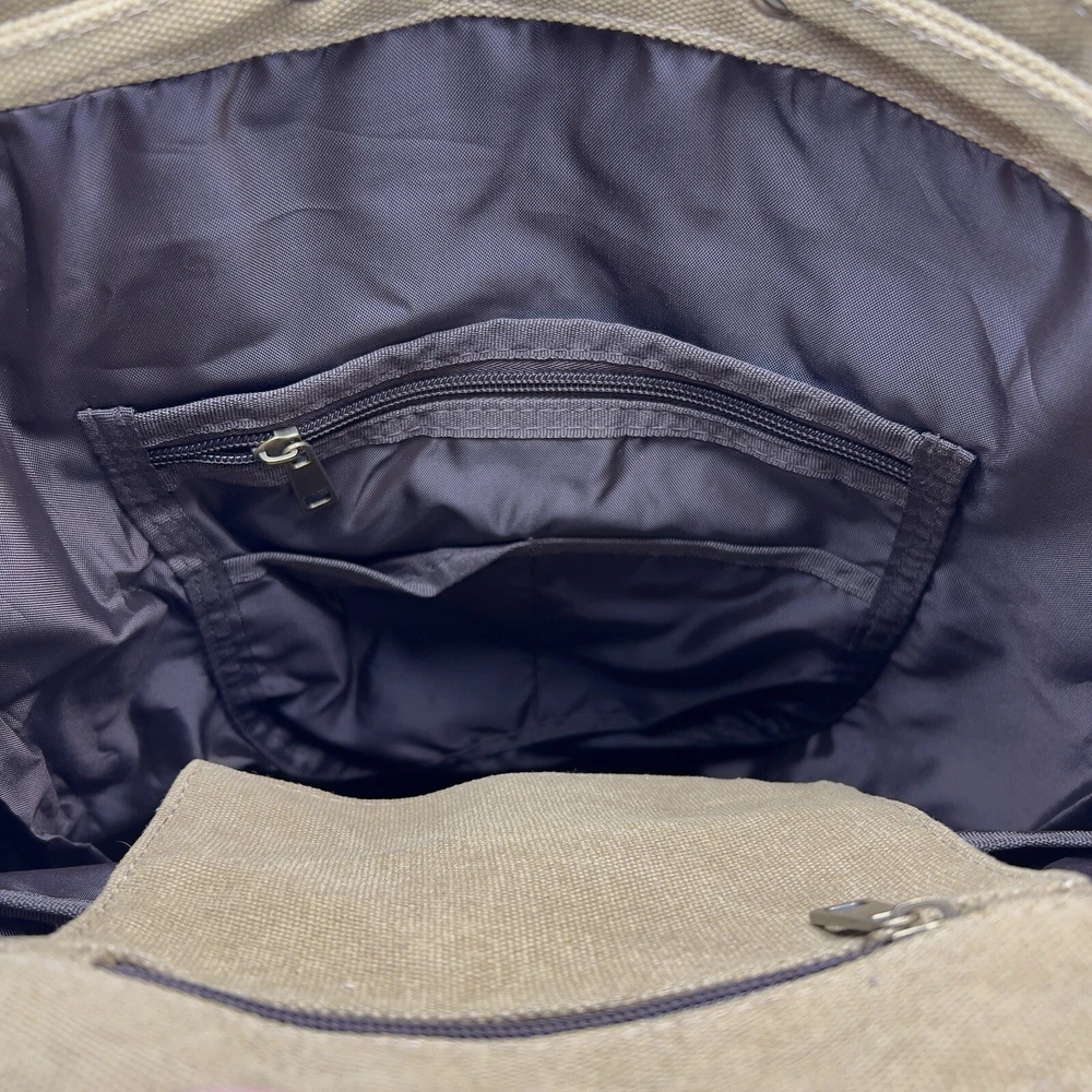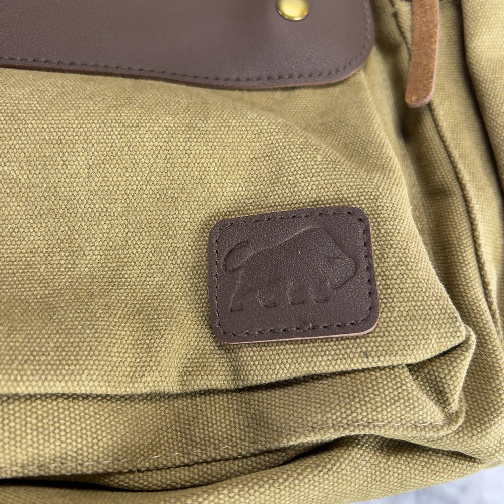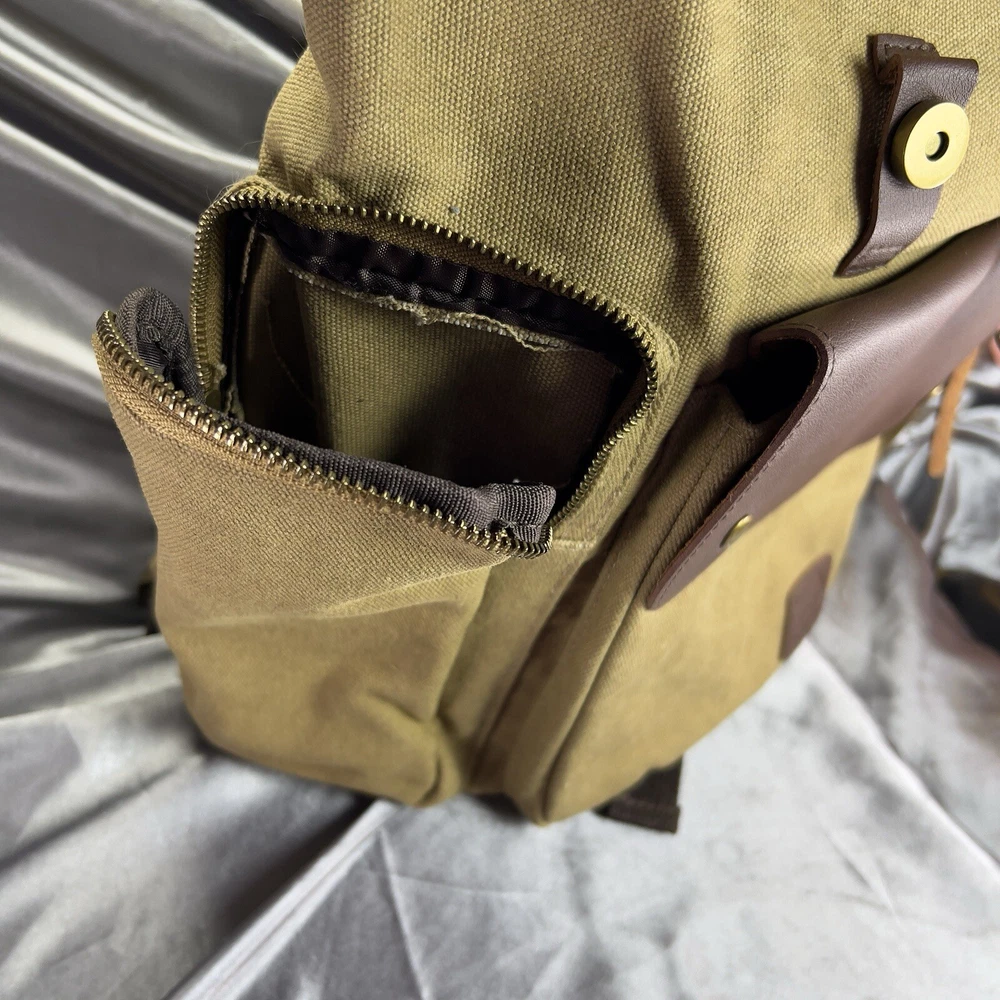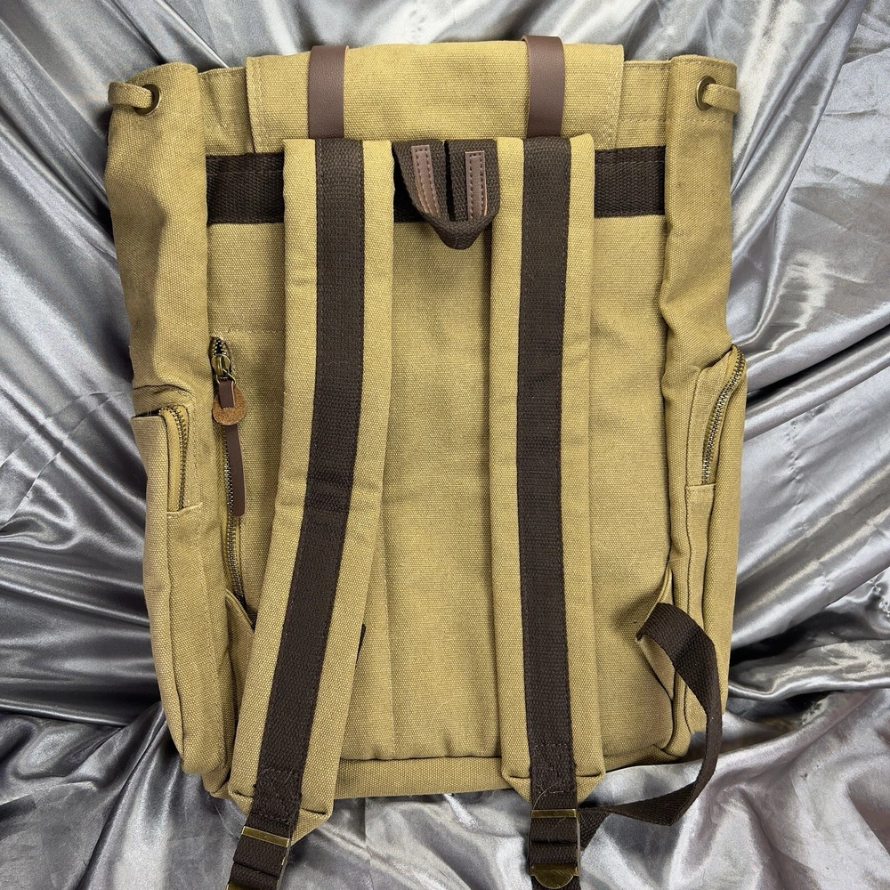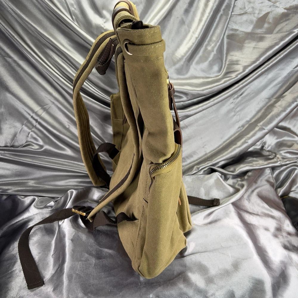 Handle/Strap Material: Leather Size: Large Closure: Buckle, Magnetic Material: Canvas, Leather Department: Men Bag Height: 15 in Style: Backpack Features: Adjustable Strap, Inner Pockets, Inner Dividers, Laptop Sleeve/Protection, Lightweight, Lined, Outer Pockets, Packable, Pockets Color: Tan Brown Beige Pattern: Solid Brand: Book Seller Notes: “New without tags, unused or worn. See photos & video ❤️‍ 🙂” Bag Width: 14 in Theme: Army, Bohemian, Christmas, Classic, College, Dad, Geek, Hippie, Hipster, Holiday, Nature, Outdoor, Preppy, School, Teacher, University, Minimalist, Travel, Vacation, Gifts Occasion: Travel, Casual Fabric Type: Canvas