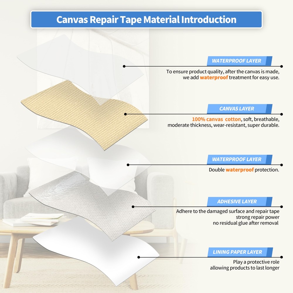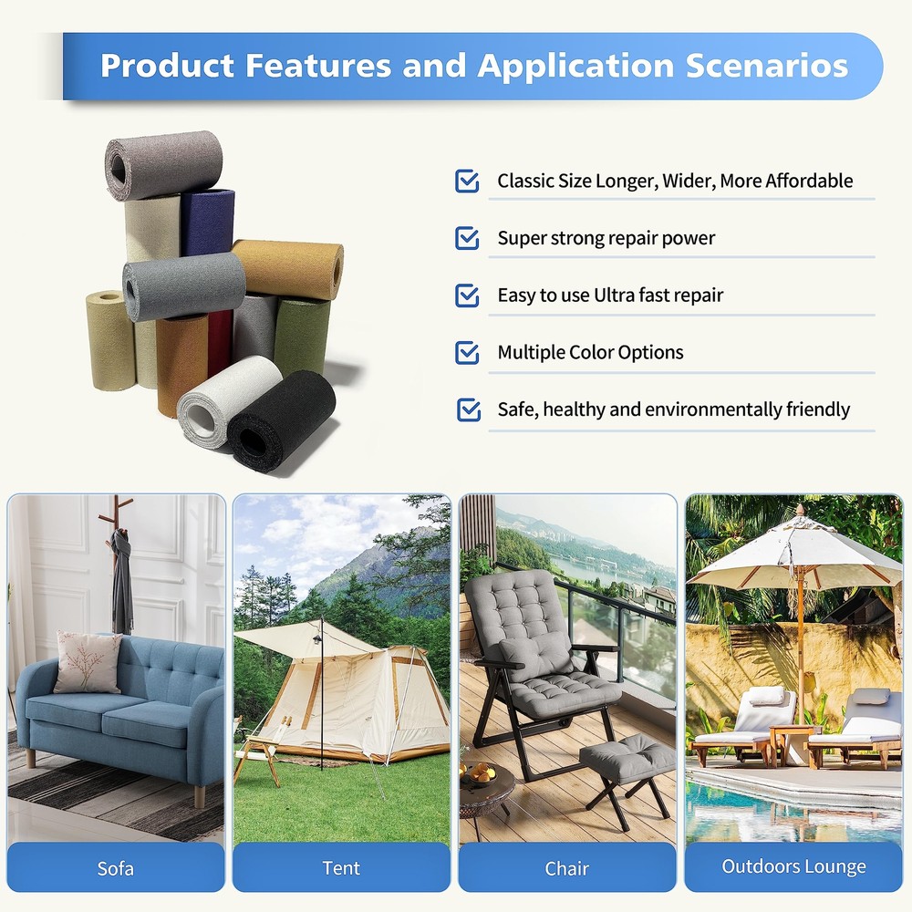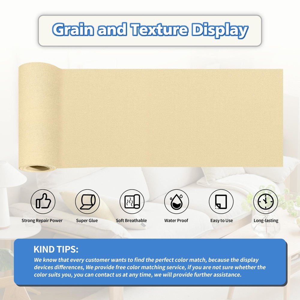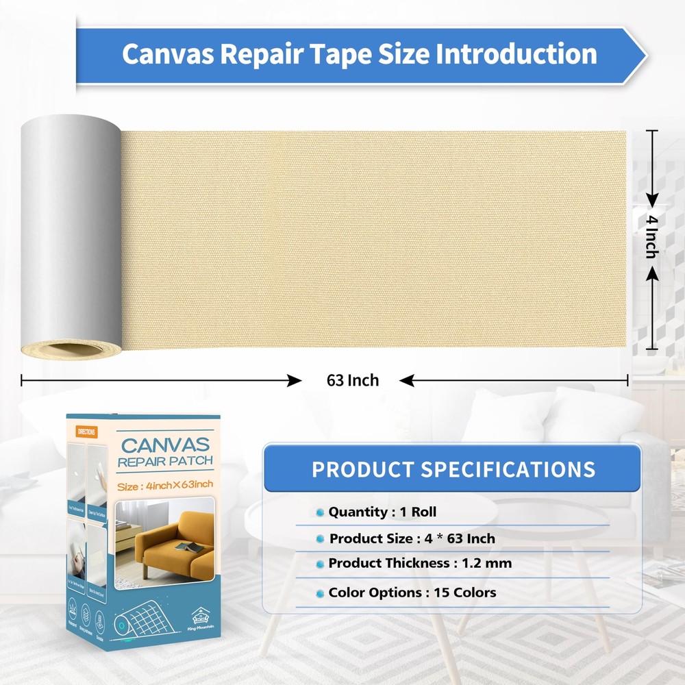 Canvas Repair Tape,Outdoor Gear Patch, 4×63 Inches,Waterproof,Self-Adhesive for Repairing Boat Covers,Sun Shades,Sofas,Tents,Lounge Chairs,Awnings (Beige) Waterproof Cotton Canvas: The self-adhesive canvas outdoor repair tape is made of high-density canvas material that is wear-resistant and scratch-resistant. The fabric surface is coated with a waterproof layer, providing excellent resistance to water penetration, making it suitable for outdoor use. The patch has a thickness of 1.2mm, which is moderate and flexible, allowing it to blend well with outdoor equipment such as umbrellas and tents, and can last for an long period. Professional Repair Adhesive: The backing adhesive is made of fabric-specific adhesive, which is 20% more adhesive than other transparent repair tapes, ensuring stronger adhesion and reducing the chances of detachment. The smooth repair process and longer lifespan of the canvas patch allow for easy repair of damaged outdoor gear by simply peeling and sticking, providing a fast and efficient solution. Wide Applications: The canvas repair patch is suitable for repairing various outdoor gear, such as tents, sunshades, awnings, sails, sofas, and more. It can easily refurbish and repair scratches, holes, cracks, and other damages, eliminating the need to purchase new furniture or outdoor gear. The lightweight packaging allows for easy carrying and storage. Instructions for Use: Ensure cleanliness and dryness of the damaged area, then cut the patch to the appropriate size. Peel off the backing paper and apply the patch to the area that needs repair, completing the process. This quick and convenient method saves a significant amount of repair time and helps you solve your problems effortlessly. Better Customer Service: For every set of canvas repair kits sold, we offer full exchange or if you are unsatisfied with our products for any reason. Due to slight color variations caused by different screens and photo shooting, you may choose the wrong color. We display our full range of color options on the detailed information page to assist you in making a better choice. If you're still unsure, please don't hesitate to contact us for assistance. Shipping We offer FREE shipping on all orders! We ship within Three business days of payment, usually sooner. We use a selection of shipping services such as UPS, FedEx, USPS etc. We only ship to the lower 48 states, no APO/FPO addresses or PO Boxes allowed. Local pickups and combined shipping options are not provided at this time. Return You can return a product for up to 30 days from the date you purchased it. Any product you return must be in the same condition you received it and in the original packaging. Please keep the receipt. Payment We accept payment by any of the following methods: PayPal Please pay as soon as possible after winning an auction, as that will allow us to post your item to you sooner! Feedback Customer satisfaction is very important to us. If you have any problem with your order, please contact us and we will do our best to make you satisfied. Contact Us If you have any queries, please contact us via ebay. We usually respond within 24 hours on weekdays. Please visit our eBay store to check out other items for sale! Thank you for shopping at our store.