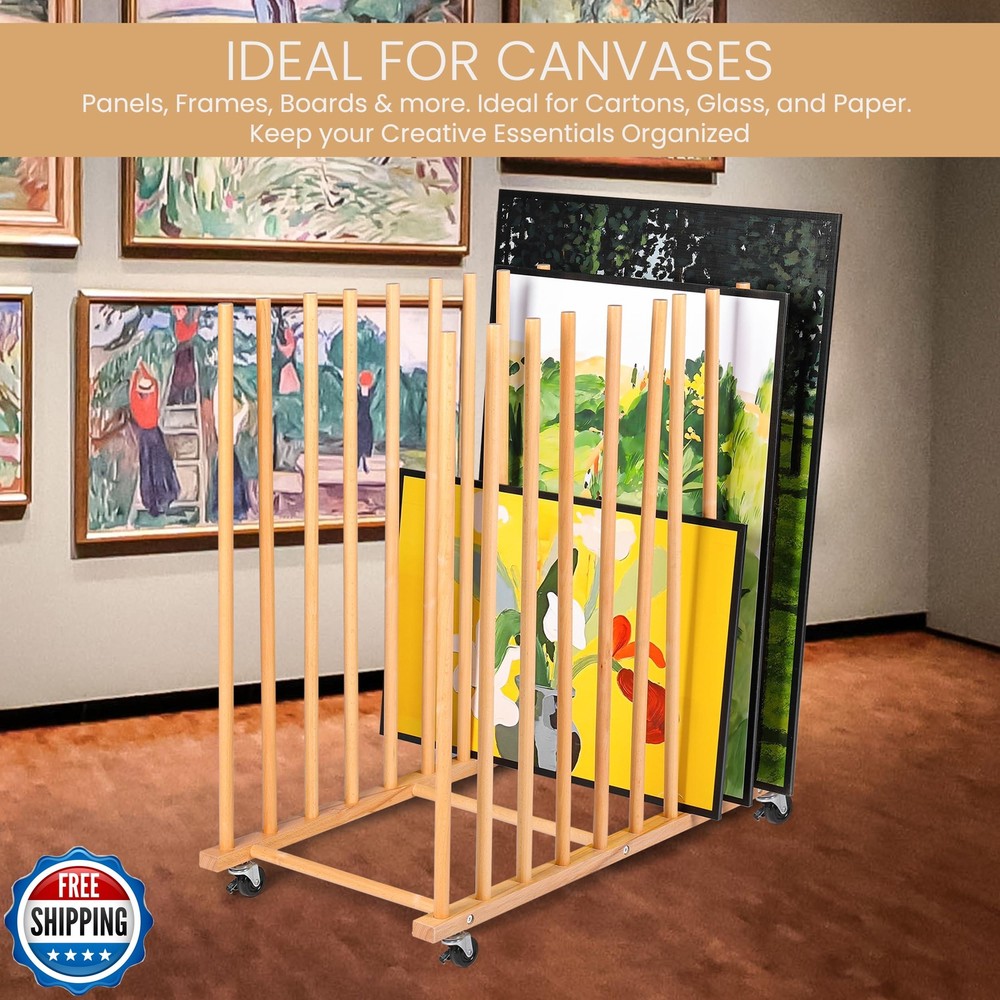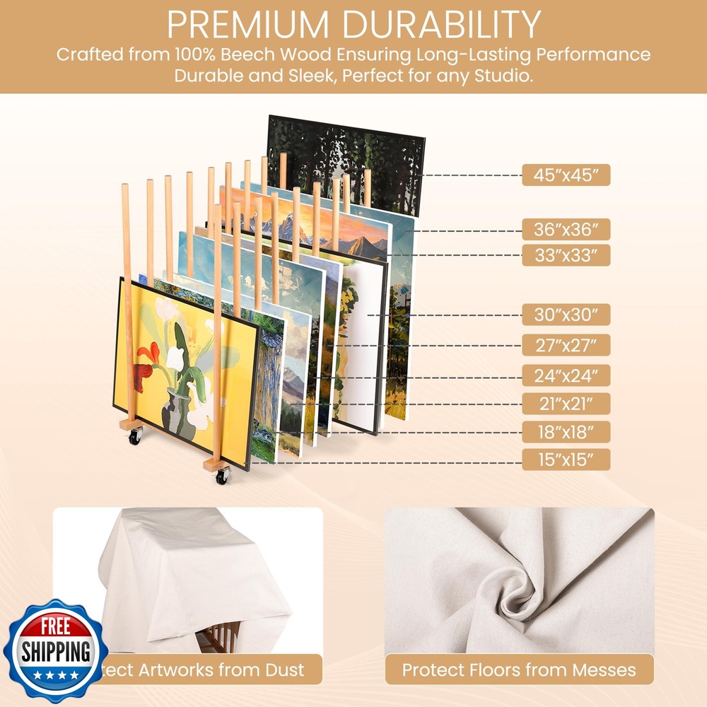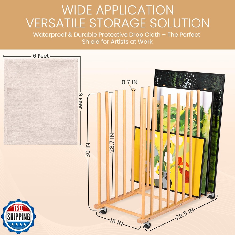 Art Storage Rack with Protective Drop Cloth, Canvas Storage and Drying Rack with Handle and Caster Wheels, Art Canvas Organizer for Paintings, Panels, Boards – Perfect for Art Studios, Artwork Features Protect Your Artwork with Ease - This art storage rack includes a protective drop cloth to keep your paintings safe from dust and damage, ensuring your artwork storage remains secure and in pristine condition for long-term preservation. Maximize Canvas and Artwork Organization - Keep your studio tidy with versatile canvas storage and art canvas storage solutions. This rack can hold canvases up to 75 inches, making it perfect for artists of all levels, from professionals to hobbyists. Durable and Easy-to-Move Design - With lockable caster wheels and a sturdy frame, this artist storage and art canvas storage rack allows you to effortlessly move your canvases while protecting them with a drop cloth, ensuring both convenience and durability. Store Canvases and Art Supplies Safely - This art rack offers secure painting storage for canvases, boards, and other art supplies. The added drop cloth provides extra protection, making this the ideal choice for artwork storage in any studio. Compact and Versatile Art Studio Solution - Perfect for any studio, this space-saving art studio furniture integrates flat files for art storage to safely hold delicate pieces and keep everything organized. The included drop cloth ensures your art stays in top condition. Shipping Free & Fast Shipping: We offer free shipping to most of the USA with a normal delivery time of 3-7 days. However, due to the current situation, additional delivery time (up to 3 weeks) may be required for some items. Alternative Carriers: We may use alternative carriers (e.g., USPS, FedEx, UPS) to ensure your package arrives safely and on time. Due to the use of multiple carriers, we are unable to provide a tracking number automatically. Handling Time: Orders are processed and shipped within 1-2 business days of receiving cleared payment. Shipping Restrictions: Shipping to Alaska, Hawaii, Puerto Rico, Guam, and other US territories may incur shipping charges or delivery restrictions. Please contact us before ordering, or your order can be refunded/cancelled. State Restrictions: Certain items may not be shipped to California due to state regulations. Contact for Tracking Updates: If you require tracking updates or have any concerns about the delivery of your order, please feel free to contact us, and we will be happy to assist you. Return Policy 30-Day Hassle-Free Returns: If you are not completely satisfied with your purchase, you can return the item for free within 30 days of receiving it for a full refund or exchange. Easy Return Process: Contact us, and we will provide you with a prepaid return shipping label and detailed instructions. No Restocking Fee: There are no restocking fees for returns. However, the buyer is responsible for return shipping costs if the return is not due to a seller"s error. Refund Processing: Refunds will be processed within 1 business day of receiving the returned item in its original condition. Feedback Your feedback is extremely important to us. We strive to provide the best products and customer service possible. If you are satisfied with your purchase, please take a moment to leave us a positive review. If you have any concerns or issues with your order, please contact us before leaving negative feedback. We are committed to resolving any problems and ensuring your satisfaction. Contact Us If you have any questions or concerns, please feel free to reach out to our customer support team. You can contact us through the eBay messaging system. We are available Monday to Friday, 9:00 am to 5:00 pm EST, and we will do our best to respond to your inquiry within 24 hours. Thank you for supporting our small family business!