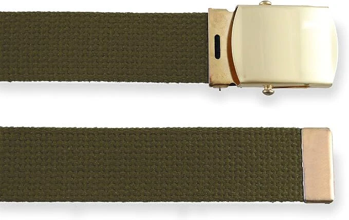 offers a Made in USA with Global Materials version of the classic cotton military belt. Matte brass buckle can be removed so the web can be cut to size. Lightweight and easy to size to fit perfectly. Measures 56" with buckle, fits up to size 50. Great belt for casual, work, camping, outdoor, scouting, military or uniform. Available in multiple solid color options and camo styles. PREMIUM CRAFTSMANSHIP- Made in the USA from Global Materials DURABILITY AT ITS CORE - Engineered with high-quality materials including military grade canvas webbing and a sturdy brass colored buckle, our belt is built to withstand the test of time. Experience long-lasting durability and reliability for all your outdoor escapades. VERSATILE STYLE - Elevate your look effortlessly with our adjustable belt, suitable for men's casual wear, golf outings, or any outdoor pursuit. ALL-DAY COMFORT - Crafted from soft cotton fabric, our belt ensures maximum comfort during golfing, hiking, and all your outdoor endeavors, while still exuding style suitable for everyday wear. THE PERFECT FIT – Each belt measures 56" total length with buckle;1-1/4" wide Fits up to sz. 50. Customize your belt to your exact size with ease. Simply remove the plated brass buckle, trim down to your desired length, and reattach for a personalized fit that ensures comfort and style. ELEVATE YOUR WARDROBE INSTANTLY - Stand out with our stylish and functional belt, designed to enhance your attire with its timeless military-inspired design.