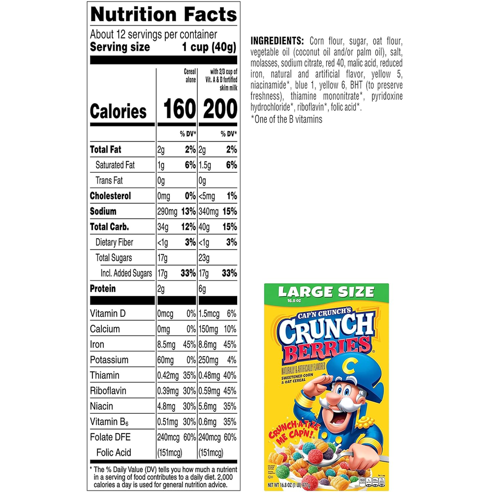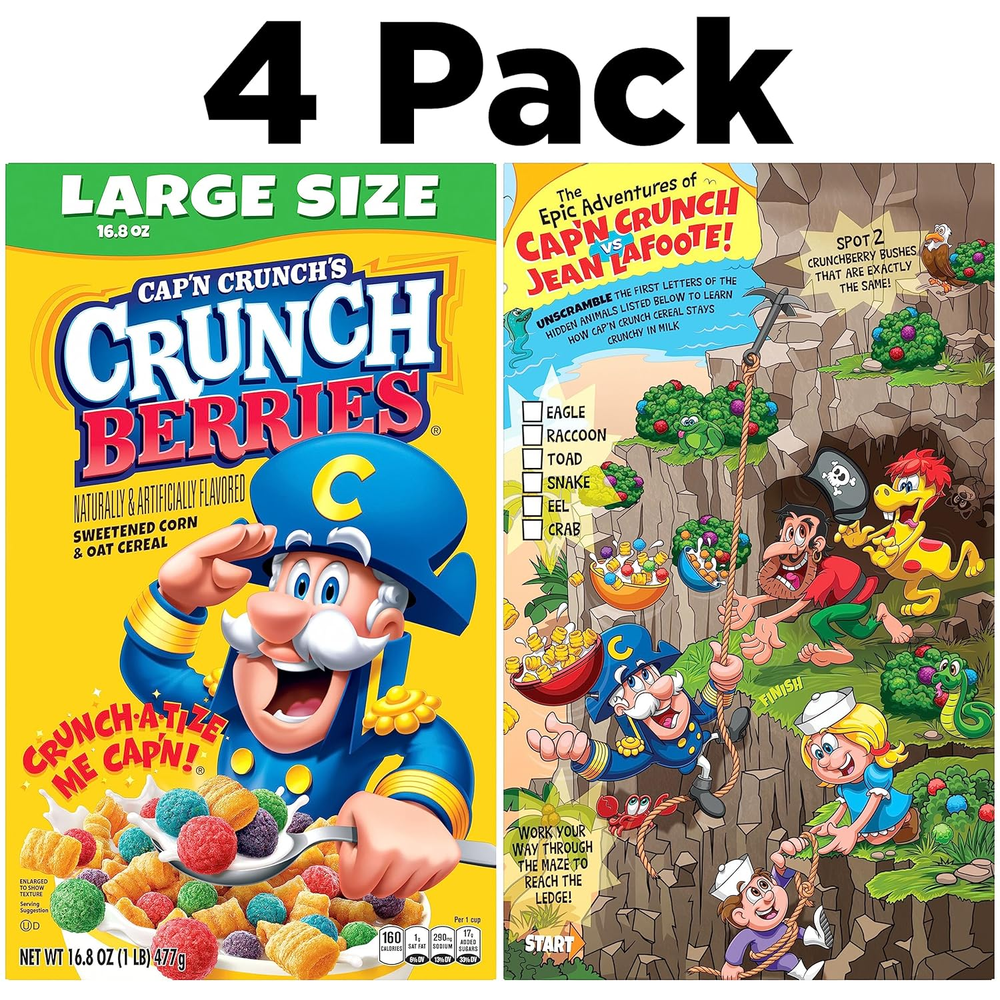 Includes 4 (16.8oz) boxes of Cap'n Crunch cereal, Crunch Berries flavor Rock your taste buds in a berry crunchy way. Cap’n Crunch’s Crunch Berries take the original crunch you love, and add in bursts of colorful berry flavor. Snag a box and go to town…your mouth will love you for it. Rock your taste buds in a berry crunchy way. Cap’n Crunch’s Crunch Berries® take the original crunch you love, and add in bursts of colorful berry flavor. Snag a box and go to town…your mouth will love you for it.