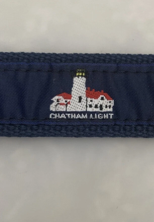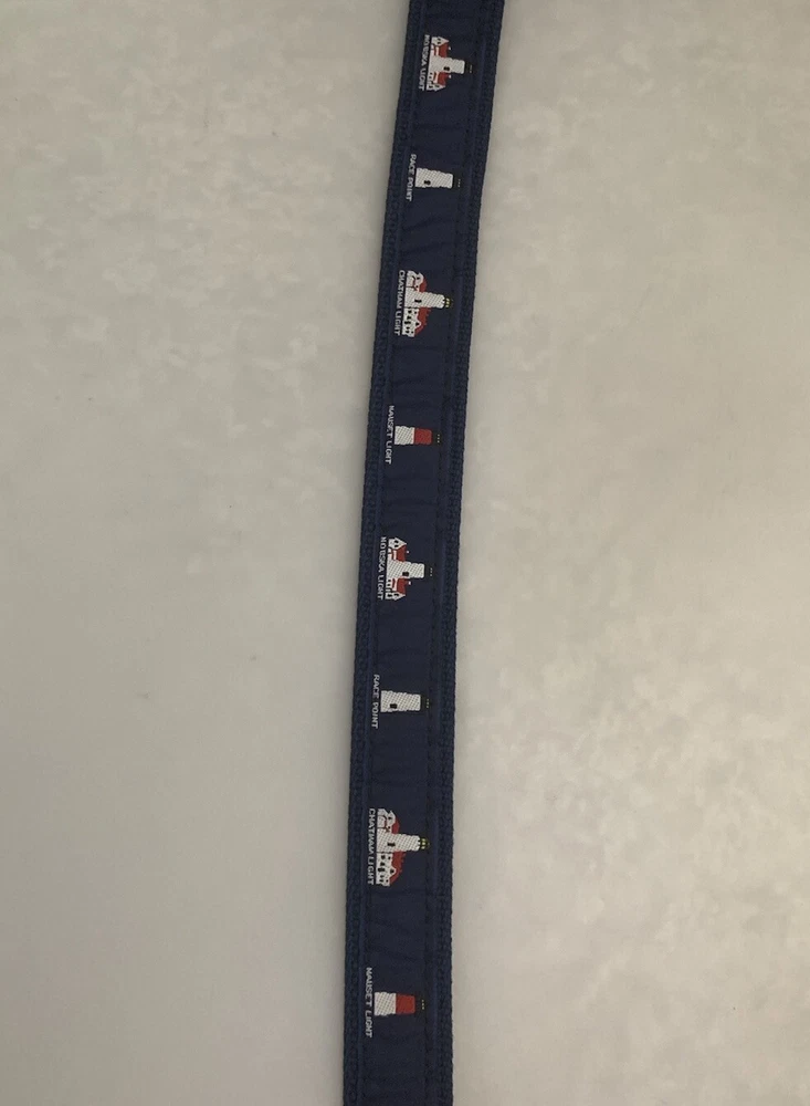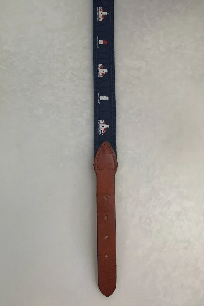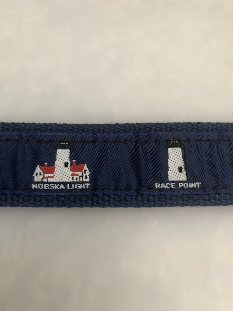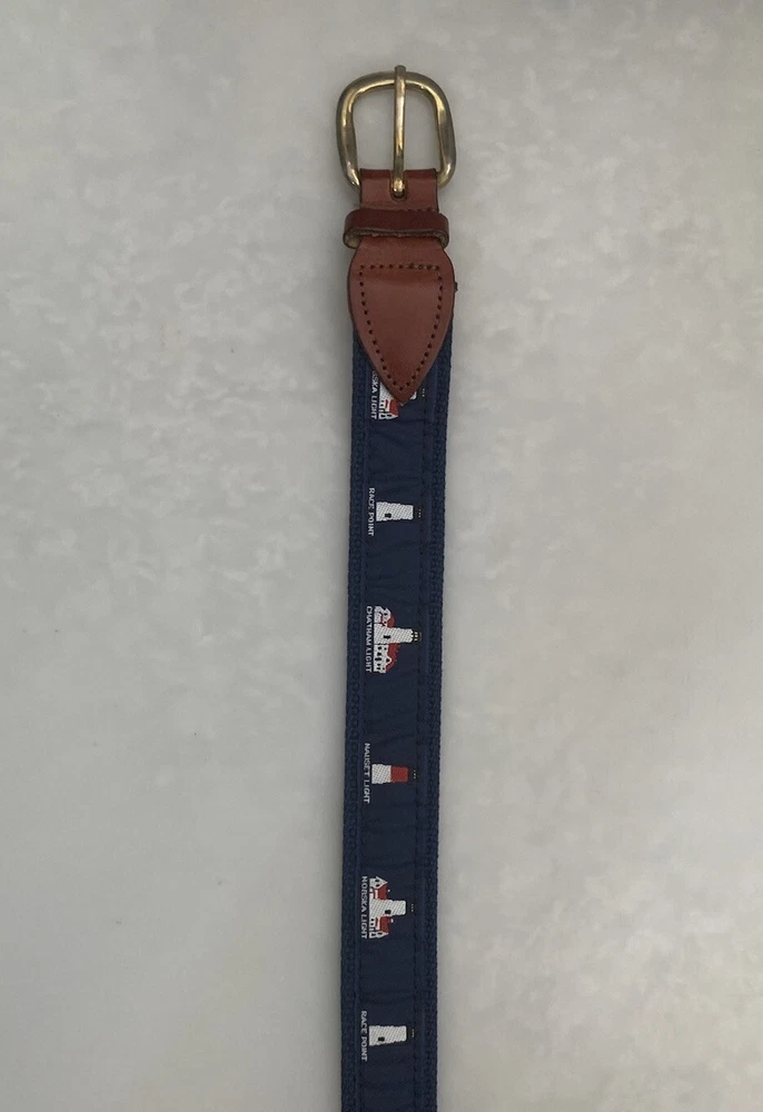 Measures 44” overall. Good condition. This vintage nautical style belt features a blue leather and canvas construction with brass buckle accents. With a size of 40, this Cape Cod Needlepoint Belt showcases a charming lighthouse design in red, perfect for those who appreciate nautical and beach-themed accessories. The belt is versatile, suitable for both casual outings and work attire, making it a stylish addition to any wardrobe for men who enjoy a touch of classic Americana in their accessories.