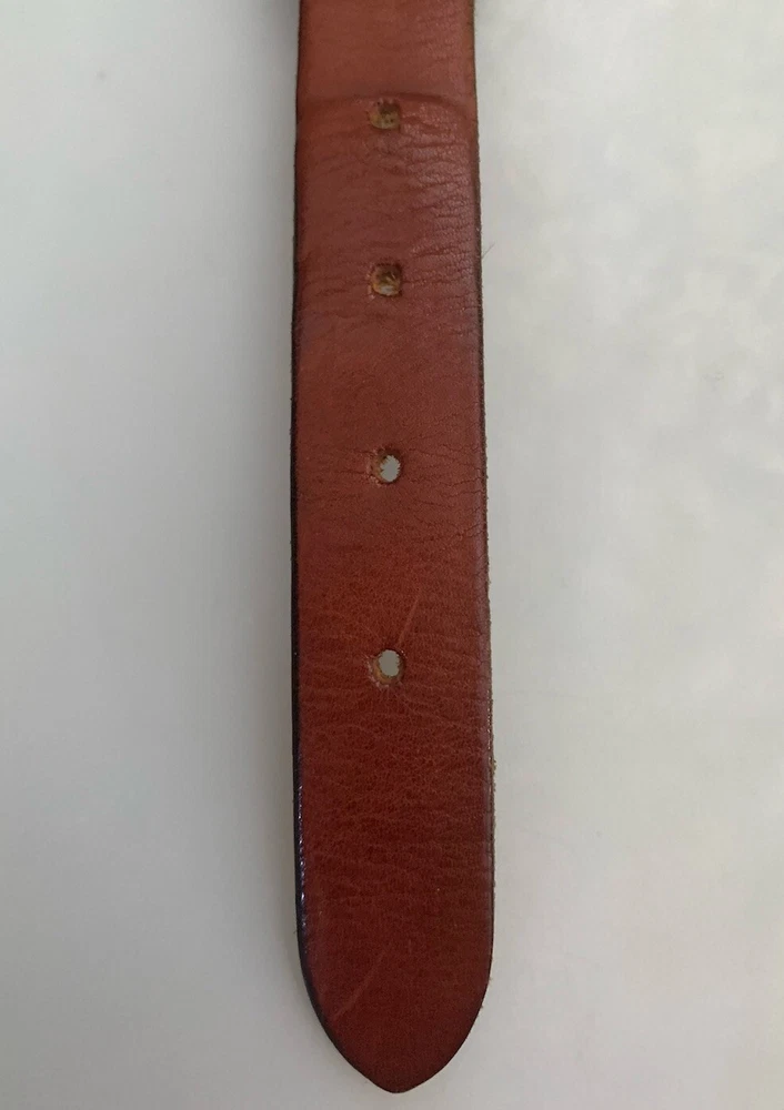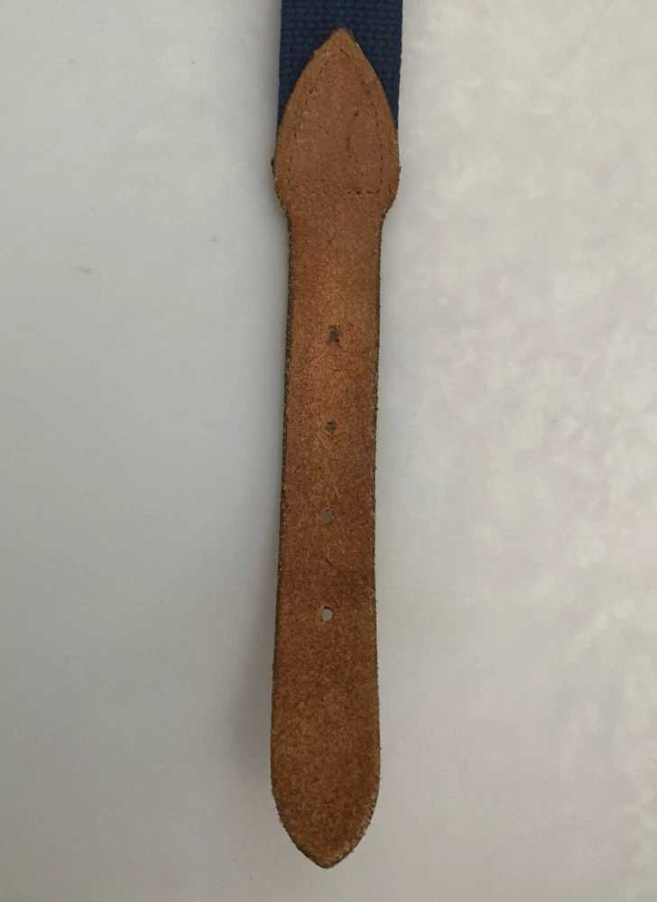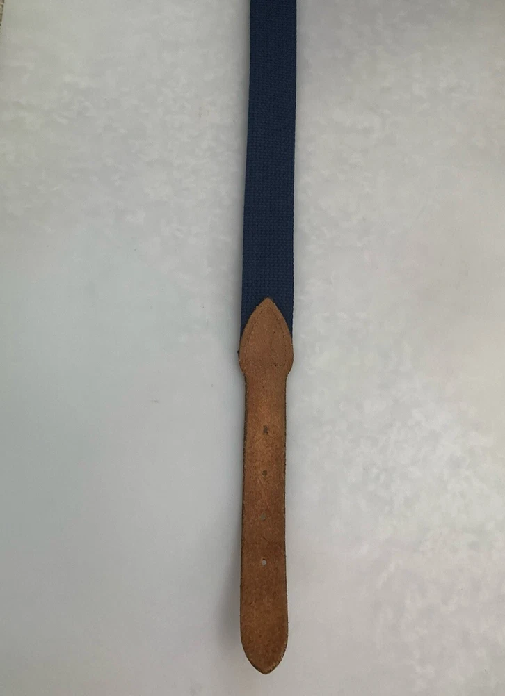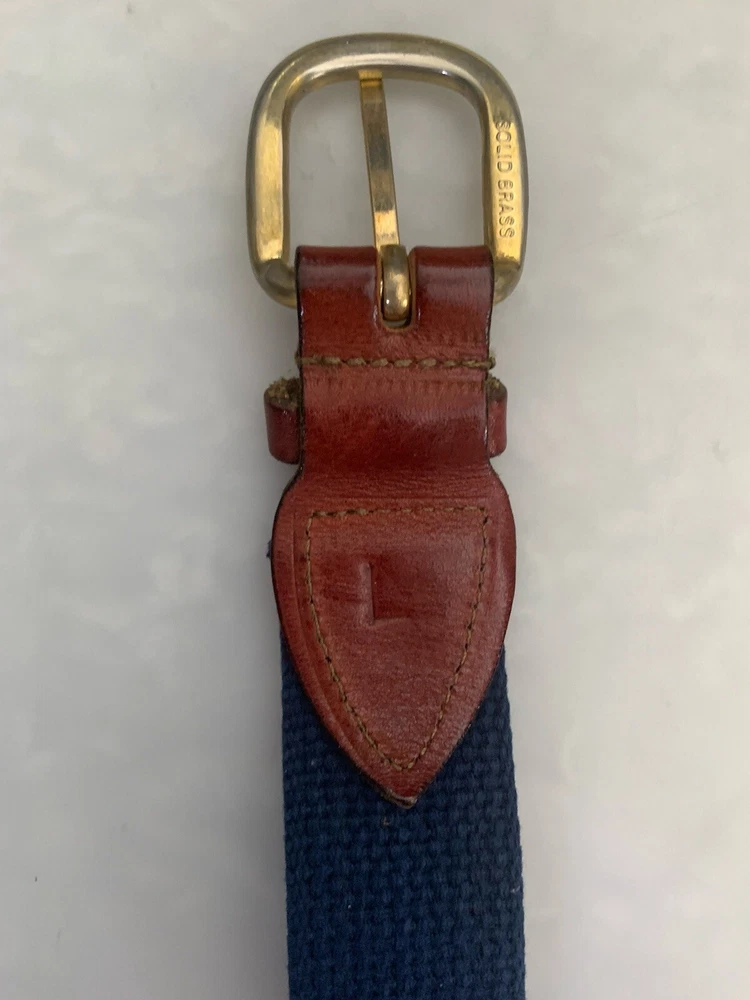 Measures 44” overall. Good condition. This vintage nautical style belt features a blue leather and canvas construction with brass buckle accents. With a size of 40, this Cape Cod Needlepoint Belt showcases a charming lighthouse design in red, perfect for those who appreciate nautical and beach-themed accessories. The belt is versatile, suitable for both casual outings and work attire, making it a stylish addition to any wardrobe for men who enjoy a touch of classic Americana in their accessories.