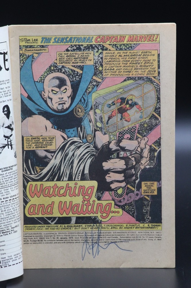 Link to our BEST items!! Link to our ENDING items!! Link to our FAQ page !! Link to our NEWEST items!! Item: Captain Marvel (1968) #36 Watcher Jim Starlin Signed 1st Page No COA Reprints 1st Capt Marvel FN Special Notes: This issue is a First Printing! This issue does not come with a COA, but because of our experience in selling autograph comics, we believe the autograph is authentic. We do not use stock photos! What you see in the pictures is what you will be getting. Publication Date: Jan 1975 (The date in the title refers to the year the title started) Condition: Fine (6.0) off-white to white pages The comic book will be shipped bagged and boarded for protection. SHIPPING: All pricing is based on the weight of the package and your location. Package Weight: 1 lb[s] Package Size: 12x9x1 We charge exact shipping costs per USPS with NO handling charge. You can check our shipping quotes on the USPS website. For the convenience of the winner, we offer shipment via Priority Mail or Media Mail, when shipping to an address inside the USA. For International Winners, we offer Priority Mail International or First-Class International Mail. Please click on the "SHIPMENTS and PAYMENTS" tab above for more details. * FREE Insurance, for items totaling under $100.00, is only available when shipping with USPS Priority to an address within in the USA! All packages will have a tracking number sent to the winner! Shipping & Payment Terms: If you would like to have your item insured, please contact us and we will send you an invoice with the adjusted shipping charges. We will be happy to combine the shipping charge for multiple auction wins . If you win a single item, you do not have to wait for an invoice to make your payment. IF YOU WIN MULTIPLE AUCTIONS, PLEASE WAIT UNTIL WE SEND YOU A COMBINED INVOICE BEFORE PAYING FOR YOUR ITEMS. Please DO NOT pay for items separately. We will ship your items within 2 business days upon receiving your payment. Payment Options: PayPal is the preferred method of payment per eBay's policies. If you do not have a PayPal account, we do accept credit card payments over the phone. Payment MUST be received within 7 business days of the auction ending or your bid will be cancelled and eBay will be contacted. Questions: We will be happy to answer any questions you have about our items before the auction ends. Please ask your questions as early as possible so we have plenty of time to answer them. Return Policy: All returns MUST be approved by Duncanville Bookstore. If there is a problem with your order, please give us a chance to address the issue before you leave negative feedback and/or contact PayPal for a refund. Store Info: Please check our other auctions and our eBay store for more great deals!! Check out our info page for more great ways to get in touch with us. Also, feel free to contact us if you are looking for anything in particular or you are looking to sell your items. We are always buying!! Duncanville Bookstore is open 7 Days a Week 10am-7pm CST!!