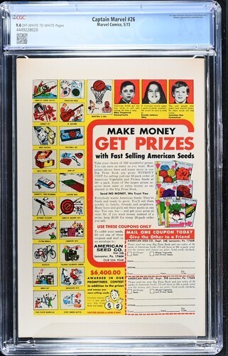 Captain Marvel #26 CGC 9.4. You will receive exactly what is pictured in the listing. Items will be shipped extremely carefully to insure they arrive in excellent condition. All S/H for this auction varies. I do combine items for shipping. Insurance is included with all shipping. For International buyers please note any custom fees charged by your country are your responsibility. I will always try to accommodate any special requests. If there are ever any problems regarding your purchase please contact me prior to putting in claims, leaving negative feedback, or giving out low ratings. I aim for 5 out of 5 stars all the time and will always do my best to fix any issues. I always make sure my customers are happy!!!! I ship fast and secure, just check my feedback. Please feel free to E-mail me with any questions or if you need larger scans. Please check out my other auctions!! Happy Bidding. Good Luck.