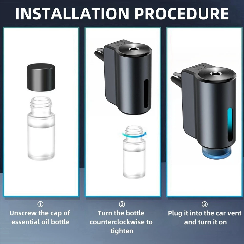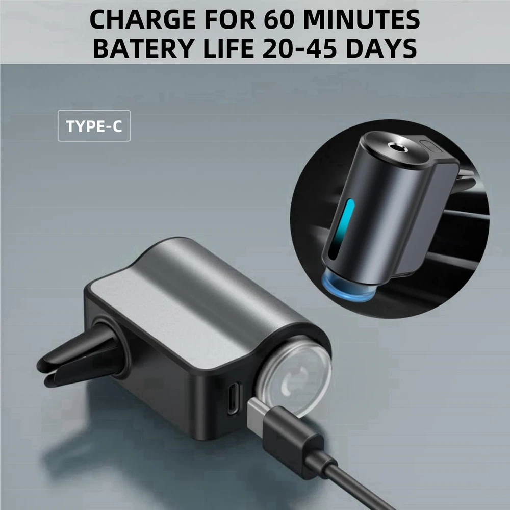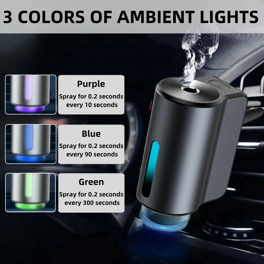 【Car Air Freshener Diffuser】The three-speed adjustable smart car air freshener can be adjusted and turned off freely. The car diffuser air freshener can also be turned on and off intelligently. This intelligent car aroma diffuser can be activated and deactivated, adjusting automatically by detecting the vehicle's running status to maintain a pleasant fragrance in the car. 【Three Spray Modes】The aromatizante para carro offers three modes: purple for a strong fragrance, spraying for 0.2 seconds every 10 seconds; blue for a normal fragrance, spraying for 0.2 seconds every 90 seconds; green for a light fragrance, spraying for 0.2 seconds every 300 seconds. Moreover, the car fresheners long lasting provides freshness. This is a highly intelligent ambientador para carro. 【Safe and Durable】Made of high-quality aluminum alloy material, the surface is sandblasted, making it strong and durable. The car fragrance that comes with this car oil diffusers is made from natural plant essence extracts. This car air freshener spray is safe. 【Easy to Use】This car spray freshener comes with a universal air clamp that can be easily attached to the air conditioning outlet. This difusor de aromas para carro is suitable for most vents, and its compact size makes it easy to place in the desired location for optimal car perfume diffusion. 【Exquisite Gifts】The auto air freshener is not only suitable for car interiors but also for bathrooms, bedrooms, pet rooms, etc. This car scent diffuser is also an excellent gift for your parents, sisters, friends, and brothers on Christmas, Halloween, Valentine's Day, and other holidays. Your family and friends will love this smart air freshener. Product Description