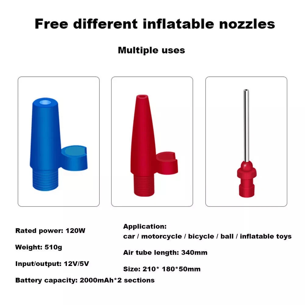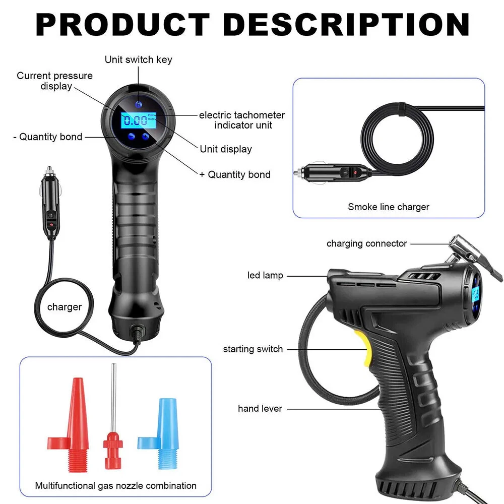 I t e m s pecifics Condition New: A brand-new fEATURE Auto-off, Fast Inflator, portable, Handheld Size 8.5" x 7" (HxW) UPC 731716348086 Working temperature -15-50℃ Power Cord Length 9.2ft Maximum Power 120W Tank Material ABS Manufacturer Part Number Does not apply Cordless NO Set Includes Tire Inflator, Inflatable Nozzle Inflator Tube Length 13 inch EAN Does not apply Maximum Working Pressure 150 Psi Color Black MPN WMGPCT3284 Portability Portable Item Length 7.70 in Brand iMountek Flow Rate Less than 100 L/min Type Piston Compressor Item Height 2 in Voltage 12 V Model WMGPCT3284 Item Width 5 in Item Weight 0.9 lbs About this product Product Identifiers Brand iMountek MPN WMGPCT3284 UPC 0731716348086 Model WMGPCT3284 eBay Product ID (ePID) 19054857630 Product Key Features Flow Rate Less than 100 L/min Maximum Working Pressure 150 Psi Color Black Portability Portable Voltage 12 V Type Piston Compressor Dimensions Item Length 7.70 in Item Height 2 in Item Width 5 in Item Weight 0.9 lbs Item description from the seller Note: This product is wired and must be plugged in for use. Wired use! PLEASE NOT Cordless !! Features: Accurate & Fast Inflation Comes with permanent magnet motor, providing super power and inflating your car ties faster. The air flow rate can reach 35L/min to fully inflate a tire in several minutes. Digital Display & LED Light You can gauge your tire pressure from the display screen and also preset tire pressure to what your tires need. The tire inflator is also equipped with a bright LED light to help you inflate at night. Auto-off Function The type of digital display can automatically shut off when the pre-set pressure has been achieved, no need to worry about the safety of your tire during inflation. Easy to Operate Simply plug DC 12V car cigarette connector into the 12V power outlet in your car and attach the hose to the tire, set the tire pressure value and then press the switch, it will start to inflate. Wide Application Comes with power cord and 3 air nozzles, in addition to tires, you can also use it for daily necessities such as balls, swimming rings, etc. Specification: Cordless :NO Material: ABS Battery :YES, upgrade 2pcs Maximum Power: 120W Maximum Working Pressure: 150 PSI Flow Rate: 40L/min Power Supply: 12V Cigarette Lighter Working Temperature: -15-50℃ Power Cord Length: 9.2 ft Inflator Tube Length: 13 in Product Size:210*180*50mm Package Included: 1 x Tire Inflator 3 x Nozzles 1 x Manual 1 x Charging cable Note: The normal pressure of the inflator is 30-40 PSI to use on cars. It can reach up to Max 150 PSI when there is no pressure such as balloons, basketball. The Suggested preset pressure is about 33.5 PSI for summer, 36.5 PSI for winter. To make it work more effectively, please stop for a while after using 10 minutes.