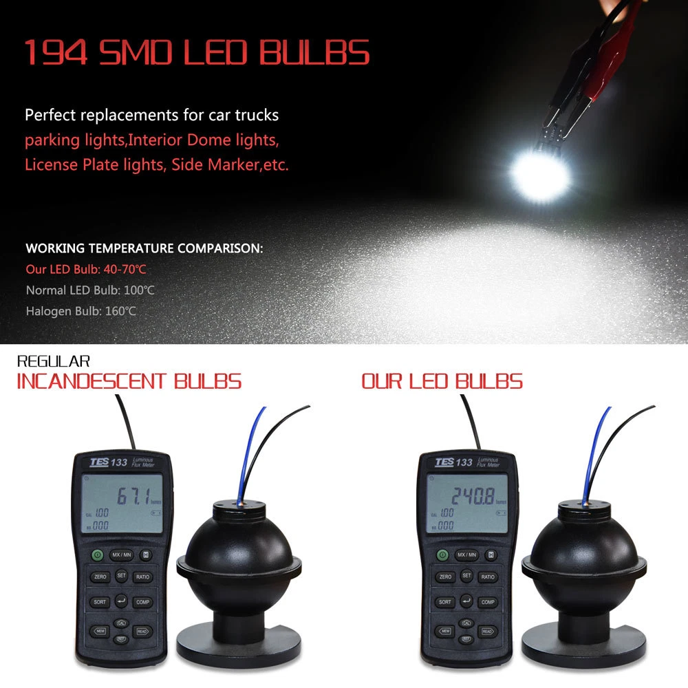 Description This item is included 10pcs 240LM Canbus Error Free T10 wedge 24SMD Xenon WHite LED bulbs specially designed for car truck interior map or dome light, license plate light, side courtesy parking light, etc. Just plug and play. Specification Package: 10pcs T10 led bulbs. LED Type: 24-pieces 3014SMD LEDs per T10 wedge led bulb Color: 6000K Xenon White. Sizes: as our photos. Cross Reference: 147, 152, 158, 159, 161, 168, 184, 192, 193, 194 2825 W5W.Easy installation, plug and play Application: Car truck License Plate Lights, side door courtesy lights, Interior Map Lights or Dome Lights. Note: Check the sizes of bulb housing before order it,ensure the LED bulbs able to fit in. Car Bulb LED Error CANBUS Free SMD Xenon White W5W 194 Side Light Interior 2Set Description This item is included 10pcs 240LM Canbus Error Free T10 wedge 24SMD Xenon WHite LED bulbs specially designed for car truck interior map or dome light, license plate light, side courtesy parking light, etc. Just plug and play. Specification Package: 10pcs T10 led bulbs. LED Type: 24-pieces 3014SMD LEDs per T10 wedge led bulb Color: 6000K Xenon White. Sizes: as our photos. Cross Reference: 147, 152, 158, 159, 161, 168, 184, 192, 193, 194 2825 W5W.Easy installation, plug and play Application: Car truck License Plate Lights, side door courtesy lights, Interior Map Lights or Dome Lights. Note: Check the sizes of bulb housing before order it,ensure the LED bulbs able to fit in. Item Specifics Brand AUXITO Manufacturer Part Number Does Not Apply Placement on Vehicle Front Rear Left Right Manufacturer Warranty 1 Year Light Color White Number of Bulbs 10 Voltage 12V To Fit Interior Light Payment Returns DESCRIPTION PAYMENT SHIPPING RETURN POLICY CONTACT US Shop Category Store Home LED Headlight ◈ H13 LED FogLight ◈ H10 / 9145 / 9140 LED Reverse Light ◈ T15/921/W16W LED Side Marker Light Car Parts & Accessories Tail Light assemblies Other Hot Item Picture New List Item For 08 09-14 Dodge Challenger White LED Rear Side Marker Driver Passenger Pair USD 18.99 New Mass Air Flow Sensor 22680-1MG0A for Infiniti Q50 Q70 M35h QX60 3.5L 2012-16 USD 32.29 For Yamaha V Star 650 XVS650 XVS650A 2X 950 LED Blinker Brake Turn Signals Light USD 18.99 For 2010 11 12 13-2014 Subaru Legacy Outback View Rear Backup Back Up Camera USA USD 37.04 60" White LED Bar Truck Bed Cargo Lights Work Strips Lamp For Chey Ford Dodge US USD 32.29 Help & Info Payment Policy Shipping Policy Return Policy FAQ About Us Car Bulb LED Error CANBUS Free SMD Xenon White W5W 194 Side Light Interior 2Set Description This item is included 10pcs 240LM Canbus Error Free T10 wedge 24SMD Xenon WHite LED bulbs specially designed for car truck interior map or dome light, license plate light, side courtesy parking light, etc. Just plug and play. Specification Package: 10pcs T10 led bulbs. LED Type: 24-pieces 3014SMD LEDs per T10 wedge led bulb Color: 6000K Xenon White. Sizes: as our photos. Cross Reference: 147, 152, 158, 159, 161, 168, 184, 192, 193, 194 2825 W5W.Easy installation, plug and play Application: Car truck License Plate Lights, side door courtesy lights, Interior Map Lights or Dome Lights. Note: Check the sizes of bulb housing before order it,ensure the LED bulbs able to fit in. Payment Returns All rights reserved. On Nov 20, 2024 at 09:02:07 PST, seller added the following information: