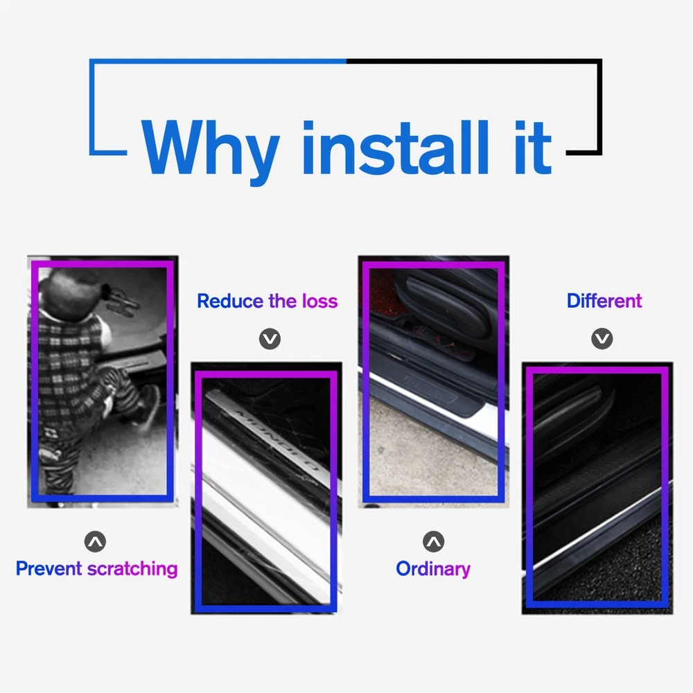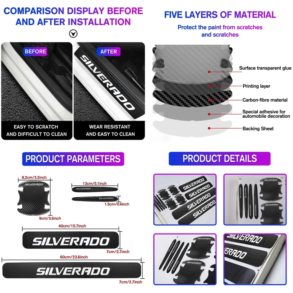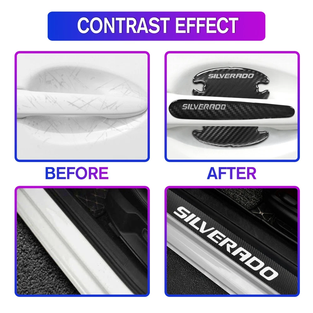 Door Sill Scuff Cover Stickers Made of high quality Carbon Fiber Textured Faux Leather, Anti Scratch and abrasion resistant, durable and effective in protecting car door sills. Easy Installation: P lease wipe the car door sill clean before installing, to ensure that there is no oil and dust first, then remove the protective paper on the back of the sticker, gently stick on the door sill above to ensure that no air bubbles are generated. Simple Maintenance: When the car door sill protector reflective sticker is stained with dirt or oil, simply wipe it with a damp rag and it will look like new with a gentle wipe. Door Cup Stickers & Door Handle Stickers Material: Carbon Fiber Texture Vinyl Stickers + Epoxy Resin Self adhesive , won’t fall of easily, will keep your door cups looking like new, without changing the appearance in any weather. No more scratches to the door handle cups Easy to Install: Clean car door handle cup and let it dry, then tear off the protector film from adhesive backing, stick film onto the cup and adjust the perfect position. Package Included : 4PCS Door Sill Scuff Cover Stickers (2 Front + 2 Rear) 4PCS Door Cup Stickers 4PCS Door Handle Stickers
