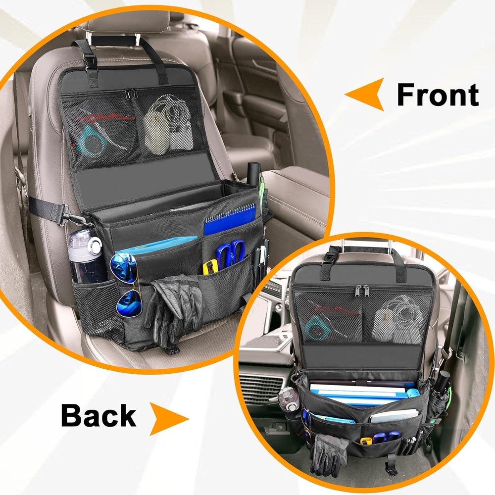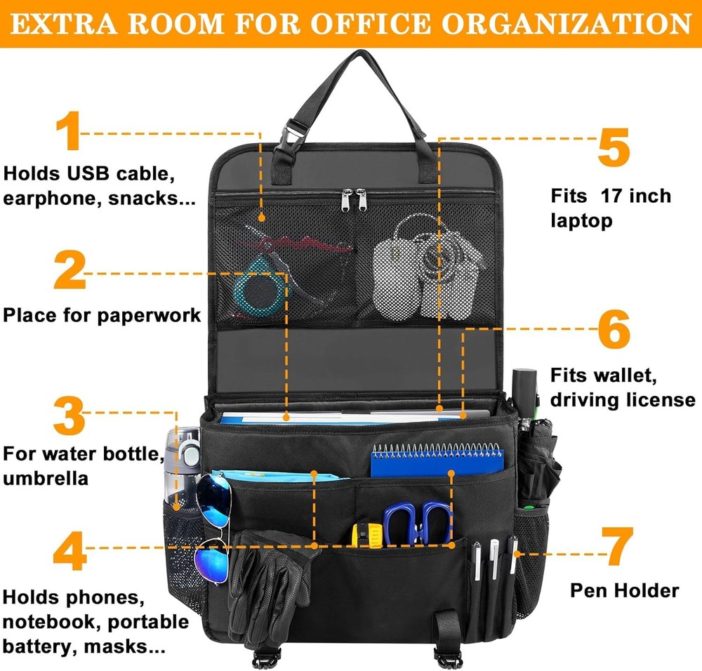 About this item Lot Of Car Seat Organizer And Storage: The car front seat organizer features a laptop compartment, a main pocket, four front pockets, two zipper mesh pockets, two bottle pockets, and three pen holders, providing extra room for work materials and keeping essential items close at hand. Even while driving, everything is within arm's reach. This organizer keeps your laptop and files neatly arranged in one place, eliminating paper and documents from sliding around in your vehicle. Ideal Organizer For Driver: The seat organizer not only offers powerful storage to keep your vehicle clean and tidy, but its cover design effectively protects your privacy and security. It’s perfect for those who frequently travel, including professionals and commuters. Easy To Install And Carry: This organizer is easy to install. Just fasten the buckles on the head of the car seat and around the seat, ensuring everything is within easy reach. The adjustable strap secures the organizer on the front seat or allows it to be carried on the shoulder. Once you arrive at your destination, you can quickly unlock the buckle and remove it from the vehicle. Easy To Swing To Back: Concerned that the backseat organizer will occupy your passenger seat? This organizer operates effectively in front of and behind any vehicle seat, easily swinging to the back when a passenger needs to sit down, resolving any space issues. It features heavy-duty buckles and double reinforced stitching for durability. Universal For All Cars: Suitable for all cars, SUVs, vans, and trucks, this organizer is an ideal solution for those who take short or long trips for business, making it effortless to transfer between work and various locations. Package Dimensions: 16.45"D x 11.85"W x 2.52"H