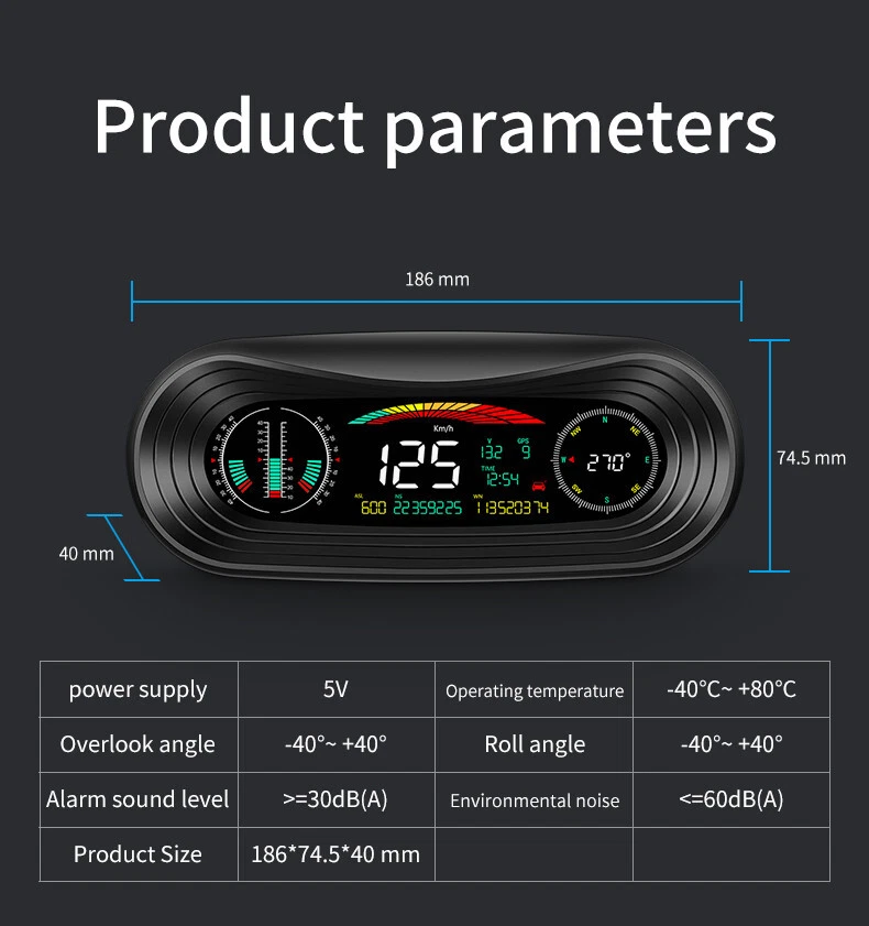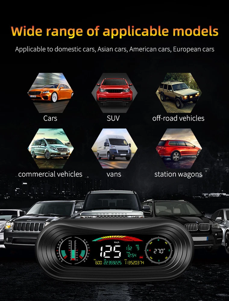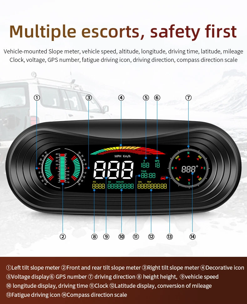 Product Description Car Compass HUD Head-Up Display Smart GPS Slope Meter Speedometer Overspeed Warning Gauge Digital Multi-Function Alarm Tool Add our listing to Watchlist Or Add to Cart , you will get more discount Main feature 1. Left tilt Slope meter 2. Front and rear Slope meter 3. Right Slope meter 4. Decorative icons 5. Voltage display 6. GPS number: flashing means searching for satellites, GPS light stops flashing and displays the number of satellites after the satellites are found 7.Driving direction: Driving direction indication:W=West, N=North, S=South, E=East when the vehicle speed >5KM / H (NW: Northwest NE: Northeast SW: Southwest SE: Southeast) 8. Altitude 9. Speed 10. Longitude display,driving time 11. The clock defaults to the UTC 8, and the time in the UTC 8 is displayed after the satellite signal is searched (adjust the local time zone according to the location) 12. Latitude display,mileage display 13. Fatigue driving icon, flashing reminder after accumulated driving for >4 hours 14. Compass direction scale Package included 1 x GPS Slope Meter 1 x Manual 1 x Suction cup holder 1 x Car Charger +USB cable Payment Returns Contact Us Shipping We accept payment by PayPal only ! Payment should be completed within 5 days after buyer places the order,or else an unpaid case will be opened in order to cancel the transaction. If you can not pay in time, please contact us. e-check from PayPal will only be processed once the payment clears. All of the items will be shipped to buyer's EBAY address,please confirm your address on Ebay before you buy.Your order will be usually shipped out the same or next business days once the payment is made and cleared. 30-day Warranty with Exchange for defective, malfunctioned, incorrect or parts-missing items. Please notify us and return the item with all parts and accessories packed and marked "FOR EXCHANGE" within 14 days of receipt. If defective, malfunctioned or parts-missing items are no longer available, a refund may be issued. All returning postage costs will be the responsibility of the buyers under all circumstances. If you encounter any problems about anything, please feel free to contact us and we will do our best to assist you solve the issue. If you are not satisfied in anyway, please feel free to let us know and give us a second chance to correct it before you decide to leave any neutral or negative feedback. Please contact us through eBay link if you have any questions. We will reply you within 24- 48 hours. Please check you spam mail if no response for 48 hours. All items will be checked before packing. All items are new and of high quality. Item will be shipped within 1 business days upon receipt of payment, excluding weekends and public holidays. If to USA,we will ship your order by USPS,it will take about 8-12 working days to you,and you can track it on line. If to other country,we will ship your order by China Post or Singapore Registered Air Mail,it will take about 14-21 working days to you,you aslo can track it on line. Delivery time is about 14-28 business days and it may take up to 8 weeks . Payment We accept payment by PayPal only ! Payment should be completed within 7 days after buyer places the order,or else an unpaid case will be opened in order to cancel the transaction. If you can not pay in time, please contact us. eCHECK from PayPal will only be processed once the payment clears. All of the items will be shipped to buyer's EBAY address,please confirm your address on Ebay before you buy.Your order will be usually shipped out the same or next business days once the payment is made and cleared. Returns 30-day Warranty with Exchange for defective, malfunctioned, incorrect or parts-missing items. Please notify us and return the item with all parts and accessories packed and marked "FOR EXCHANGE" within 14 days of receipt. If defective, malfunctioned or parts-missing items are no longer available, a refund may be issued. All returning postage costs will be the responsibility of the buyers under all circumstances. Contact Us If you encounter any problems about anything, please feel free to contact us and we will do our best to assist you solve the issue. If you are not satisfied in anyway, please feel free to let us know and give us a second chance to correct it before you decide to leave any neutral or negative feedback. Please contact us through eBay link if you have any questions. We will reply you within 24- 48 hours. Please check you spam mail if no response for 48 hours. Shipping All items will be checked before packing. All items are new and of high quality. Item will be shipped within 1 business days upon receipt of payment, excluding weekends and public holidays. If to USA,we will ship your order by USPS,it will take about 7-10 working days to you,and you can track it on line. If to other country,we will ship your order by China Post or Singapore Registered Air Mail,it will take about 14-21 working days to you,you aslo can track it on line. Delivery time is about 14-28 business days and it may take up to 8 weeks . Welcome to our Store ~