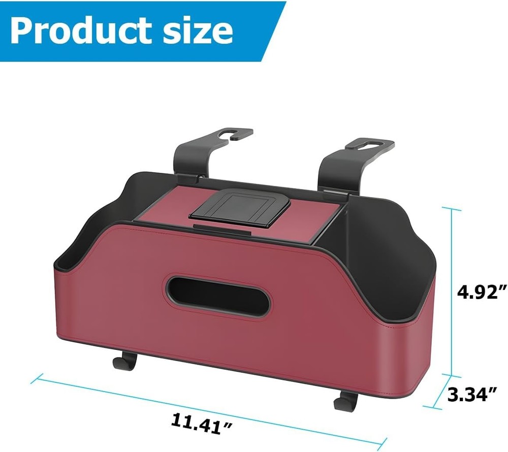 About this item 【High Quality Material】: Our products are made of microfiber leather and ABS material. The microfiber leather provides a good touch and appearance texture, as well as some abrasion and scratch resistance. The ABS material ensures the durability, water resistance, and stability of the organizer. This combination improves the overall quality and service life of the organizer while providing users with a more comfortable and convenient experience. 【Practical Function】: Our product can store a variety of small objects, such as cell phones, wallets, keys, cups, snacks, and more, which can avoid clutter caused by the placement of these items in the car, thus making the car more neat and orderly. Additionally, by placing frequently used items in the seat back organizer, passengers can easily access them at any time without having to rummage around in the car, improving the convenience of traveling. 【Wide Application】: The product measures 3.35 x 11.42 x 4.92 inches, and its universal Package Dimensions is designed to fit most vehicles, including cars, SUVs, and trucks. It has 2 cup holders and a tissue box to hang cups, bottles, snacks, toys, wipes, tissues, umbrellas, and more. It also features a phone holder, so you can enjoy a movie or play a game on the go. 【Easy to Install】: The product uses direct snap mounting, which is very easy to install. You don't need to disassemble the headrest or use other tools, you can assemble it by hand. First, snap the long hooks onto the edge of the storage box. Next, push the hooks inward slowly to adjust to the proper headrest spacing. Finally, hang it directly on the headrest bar. Its overall design is sleek and does not hurt your hands or car seats. 【Bottom Hooks】: The product has 2 fixed hooks on the bottom, allowing you to hang handbags, cargo bags, umbrellas, garbage bags, and other items underneath. These items will no longer need to be scattered on the seats or floor, which helps keep the interior of the car neat and tidy. It is a must-have for families with kids and passengers, helping you keep your car organized while providing convenience and entertainment, making road trips more enjoyable and comfortable. Package Dimensions: 3.35 x 11.42 x 4.92 inches.