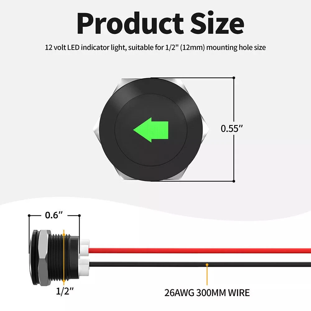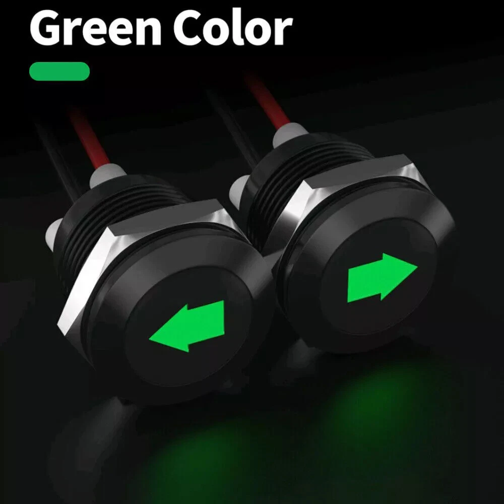 Car Indicator Dash Light Turn Signal Light LED Single Arrow 2Pcs Green 12V Metal Description: 100% Brand New and high quality. About this item Product name: black oxide LED metal signal indicator (GREEN) Product specifications: lamp voltage: 12VDC; rated voltage: 300V; wire gauge: 26AWG Product size: cable length: 8 inches/20 mm; installation cutting hole: 12mm (1/2") Bulb type: LED; LED color: green These LED indicators are suitable for cars, trucks, ships, etc. Package includes: 2pcs signal indicator Notice: 1. Please allow 2-3% error due to manual measurement. Please make sure you do not mind before you bid. 2. The colors may have different as the difference display, please understand.