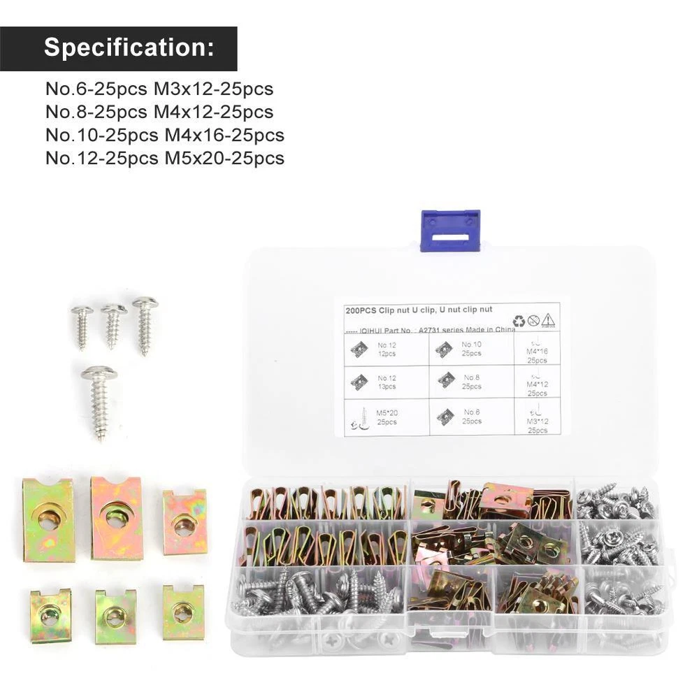 Condition: 100% Brand New Item Type: U-Clips Material: 65 Manganese Steel + 304 Stainless Steel Color: As picture shown Specification: No.6-25pcs M3x12-25pcs No.8-25pcs M4x12-25pcs No.10-25pcs M4x16-25pcs No.12-25pcs M5x20-25pcs Application: Suitable for motorcycles, automobiles, etc.