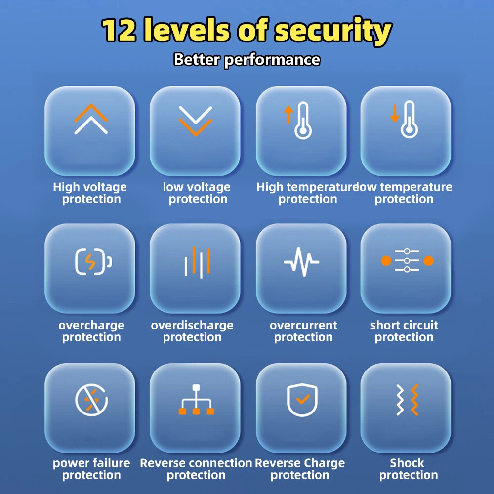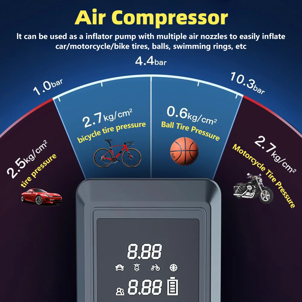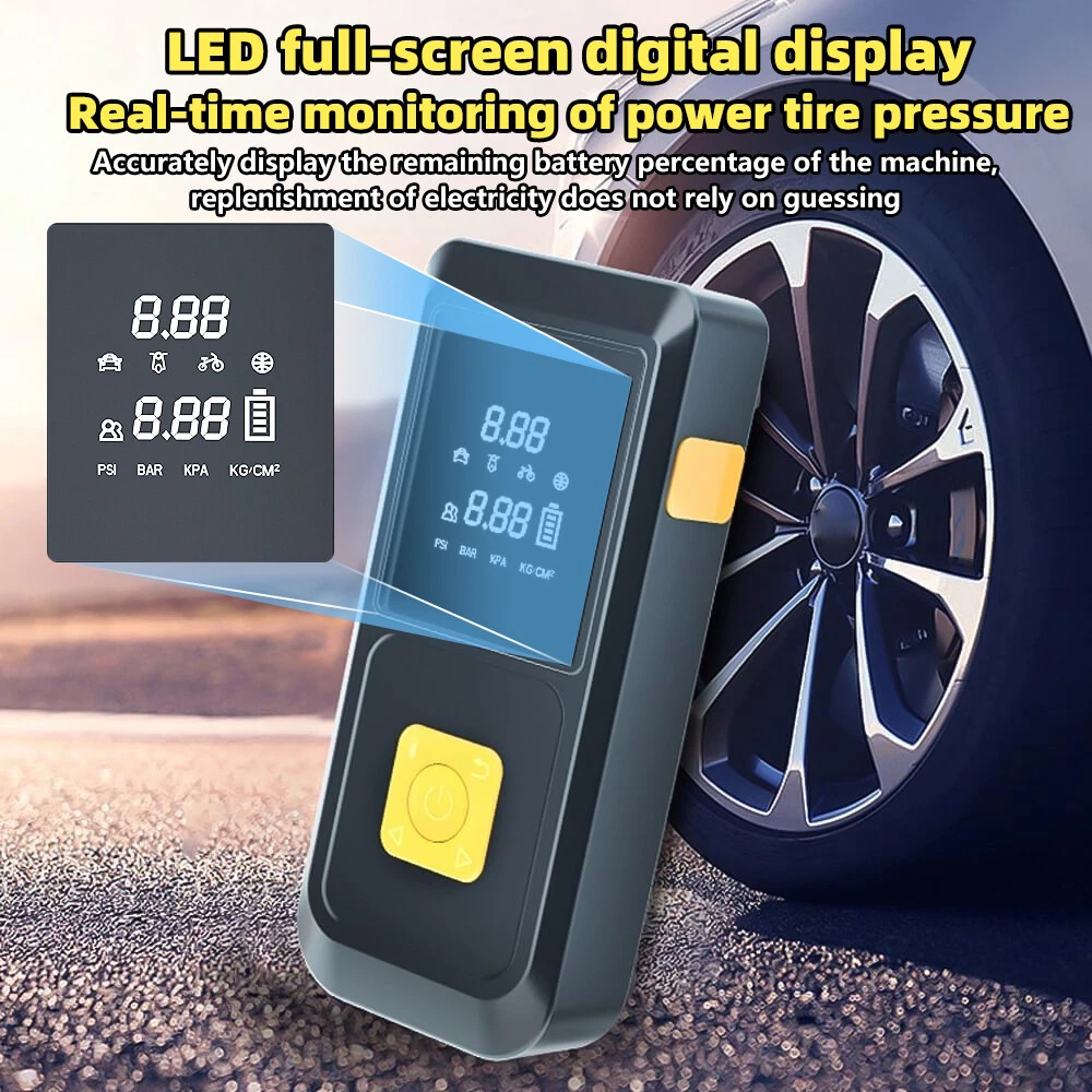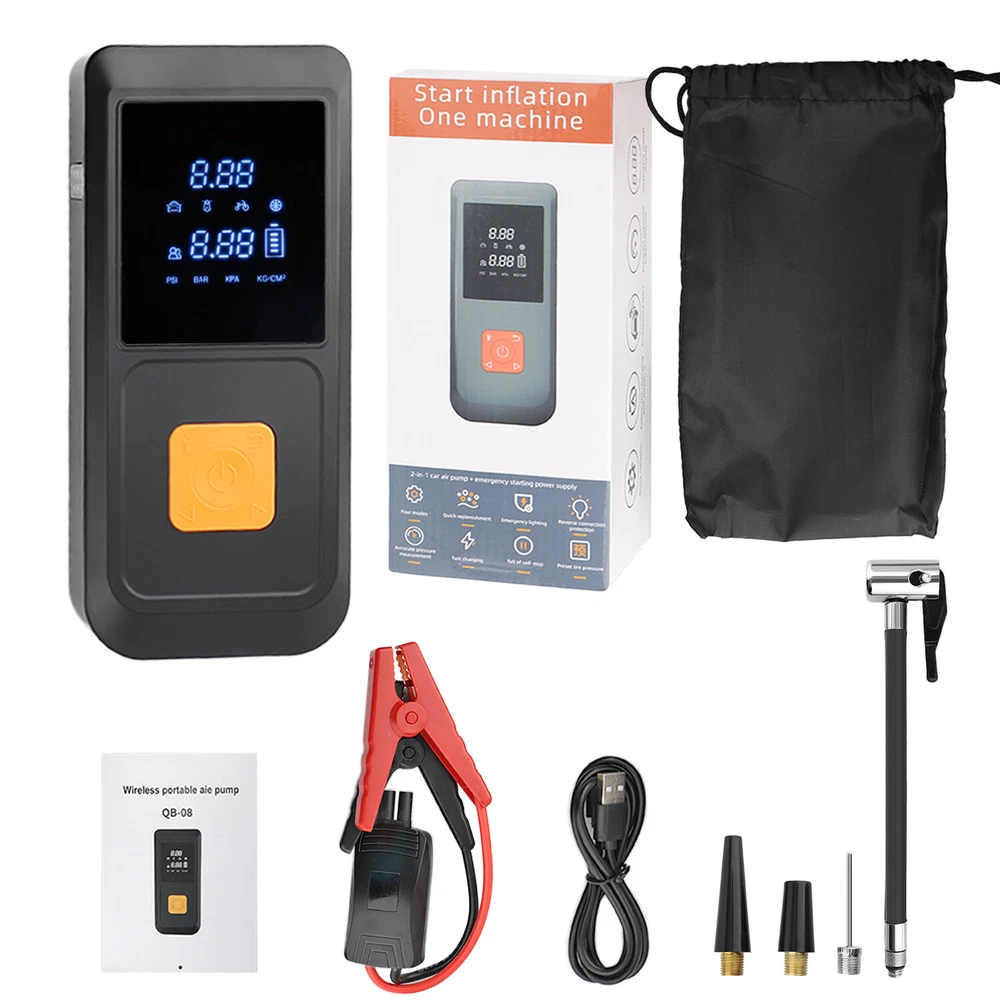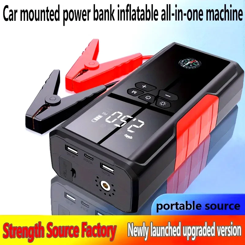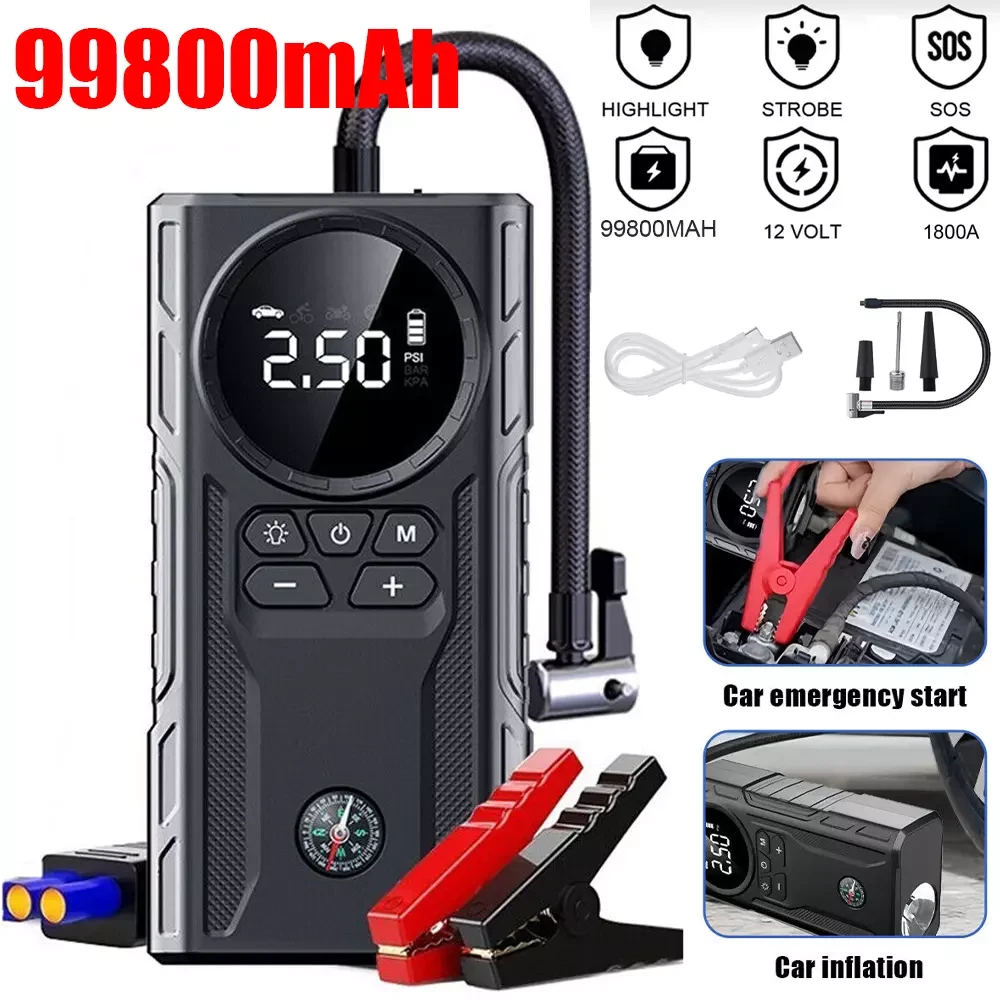 Car Jump Starter Jumper Power Bank 99800mAh Battery LCD Display Tire inflator US Item Description 32000mAh Jump Starter&Air Compressor Specifications: Capacity: 32000 mAh Charging Time: 4 hours Interface Type: 2USB Input Voltage: 5V Adapted Model: 12V Protection Type: Intelligent Protection Working Temperature:-40 ~ 80. Cycle Times: 3000 times Overall Dimensions: 22*17*6cm Starting Current: 1000A. Peak Current: 2000A Additional Functions: Mobile Phone Charging, Lighting, Battery Clip. Output Voltage: 12V Display Mode: Digital Display Suitable Car Series: 12V, ≤6.0L gasoline and ≤2.0L diesel vehicle. Product advantages: Large peak current can start 12V gasoline and diesel vehicles. The product has 5V/2.1A*2, 12V-16.8V=3A output port, which can be used for charging mobile phones, MP3/MP4, PSP, cameras and other electronic products. Automobile tire pump, and other 12V equipment for power supply. LED light (lighting, flashing, emergency help) The main components of the product are high-end imported chips, which have strong stability and strong startup. Equipped with intelligent battery clip, it is safer to use. The product adopts imported material shell, which increases the safety performance. Power supply has passed CE, quality inspection report and MSDS. Package includes: 1 x Car Jump Starter 1 x USB Charge Cable 1 x Battery Clip 3 x Gas Nozzle 1 x US Plug 1 x Phone Charging Cable 1 x Storage Box 1 x User Manual A-99800mAh Jump Starter&Air Compressor Features: 8-IN-1 JUMP STARTER: Not only is it a car jump starter, it can also be used as a pump, portable battery pack, emergency LED light with 3 modes (flashlight, SOS, strobe) and power bank to charge mobile phones, tablets and other USB devices. hard press power button 3 seconds to turn on. HIGH POWER BOOSTER: The car battery charger with a 1600A peak current, can start the 12V vehicles up to 10L Gas or 8.5L Diesel engines. The powerful battery booster works even in extreme temperatures. Suitable for car, truck, motorcycle, boat, RV or tractor and so on. INFLATION FUNCTION: The car battery jump starter is equipped with tire inflation and 3 types nozzles, supporting 3 optional units (PSI, BAR, KPA), which can inflate various tires and balls. In addition, there are smart screen and tire pressure detection function. EMERGENCY LED LIGHT: The jump starter battery pack features 3 LED light modes. First of all, it can be used as a flashlight, which is very bright and lasts long time. Secondly, when you need rescue for survival, turn on SOS and strobe mode. Ideal for camping and long drives. PROTABLE POWER BANK: The car battery starter capacity is very large and can charge for phone, laptop, camera and all USB digital devices. Apart from that, charging is very fast and it is very convenient to use, just long press the power button and plug in the USB data cable. SAFETY PROTECTION: The upgraded jumper cable adds a smart chip, so you don't have to worry about connecting the wrong positive and negative poles of the car battery, or short circuits and sparks. It is very safe and can be connected to any car below 12V. WHAT YOU WILL GET: You will get 1 X jump starter with air compressor, 1 X smart jumper cable, 1 X type-c cable, 1 X carrying bag, 1 X pump tube, 3 X air nozzle(note:pump tube and air nozzle in the top side storage area of the jump starter), 1 X user manual. If you have any after-sales questions about jump starter, please feel free to contact us B-99800mAh Jump Starter&Air Compressor Feat ures : 1. Emergency Power Supply & Air Pump Integration: This device combines an emergency power supply with an air pump, allowing for instant power recovery and rapid tire inflation during emergencies. 2. Four-in-One Functionality: Equipped with four major functions - tire inflation, vehicle starting, digital charging, and emergency lighting - providing comprehensive support for various roadside situations. 3. Smart Anti-reverse Battery Clamp: Featuring a smart anti-reverse battery clamp with 12 layers of safety protection, ensuring safe and secure operation during use. 4. Real-time Monitoring & Intelligent Display: The device offers real-time monitoring and intelligent digital display, providing clear and accurate tire pressure status at a glance, with an error value of ≤0.05Bar. 5. Cold Weather Resilience: Capable of starting without pressure in temperatures as low as -20°C, making it resistant to freezing and ideal for use in cold weather conditions. 6. Emergency Lighting: Offers three lighting modes for emergency illumination, providing added safety and visibility during roadside emergencies. 7. Simple Operation: Easy-to-follow operation steps - connect, clamp, ignite, and remove - ensuring hassle-free usage for users of all levels. Specifica tions : - Charging Input Voltage: 5V - Working Voltage: 14.8V - Maximum Power Consumption: 60W - Maximum Current: <6A - Start-up Current: <300A - Maximum Inflation Flow Rate: 25L/min - Battery Capacity: 99800mAh - Suitable Displacement: Gasoline vehicles up to 5.0L, diesel vehicles up to 4.0L - LED Brightness: 20LM - Maximum Inflation Pressure: 150PSI - Measurement Accuracy: ±1.5PSI - Pressure Units: PSI, KPA, KG/c㎡ - External Hose Length: 100MM±10MM - Operating Temperature: -30℃~60℃ - Product Dimensions: 20*8.75*4.3cm Package Contents: 1 x Main Unit 1 x Battery Clamp 1 x Air Hose 1 x Accessory Pack 1 x Charging Cable 1 x Cloth Bag 1 x User Manual C-99800mAh Jump Starter&Air Compressor Features: 1. Emergency Power Supply & Air Pump Integration: This device combines an emergency power supply with an air pump, allowing for instant power recovery and rapid tire inflation during emergencies. 2. Four-in-One Functionality: Equipped with four major functions - tire inflation, vehicle starting, digital charging, and emergency lighting - providing comprehensive support for various roadside situations. 3. Real-time Monitoring & Intelligent Display: The device offers real-time monitoring and intelligent digit