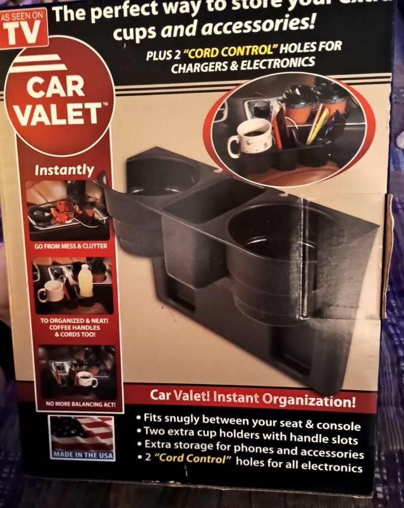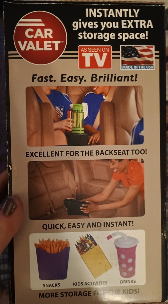 The Car Valet is a black plastic insert designed to organize your car with ease. This durable car valet can be easily installed between the seat and console of your vehicle. With its easy installation and compact design, this car valet is perfect for keeping your car neat and tidy while on the go. Designed in the United States, this one-piece storage solution is a convenient addition to any car or truck for keeping small items like keys, phone, and change in one place.