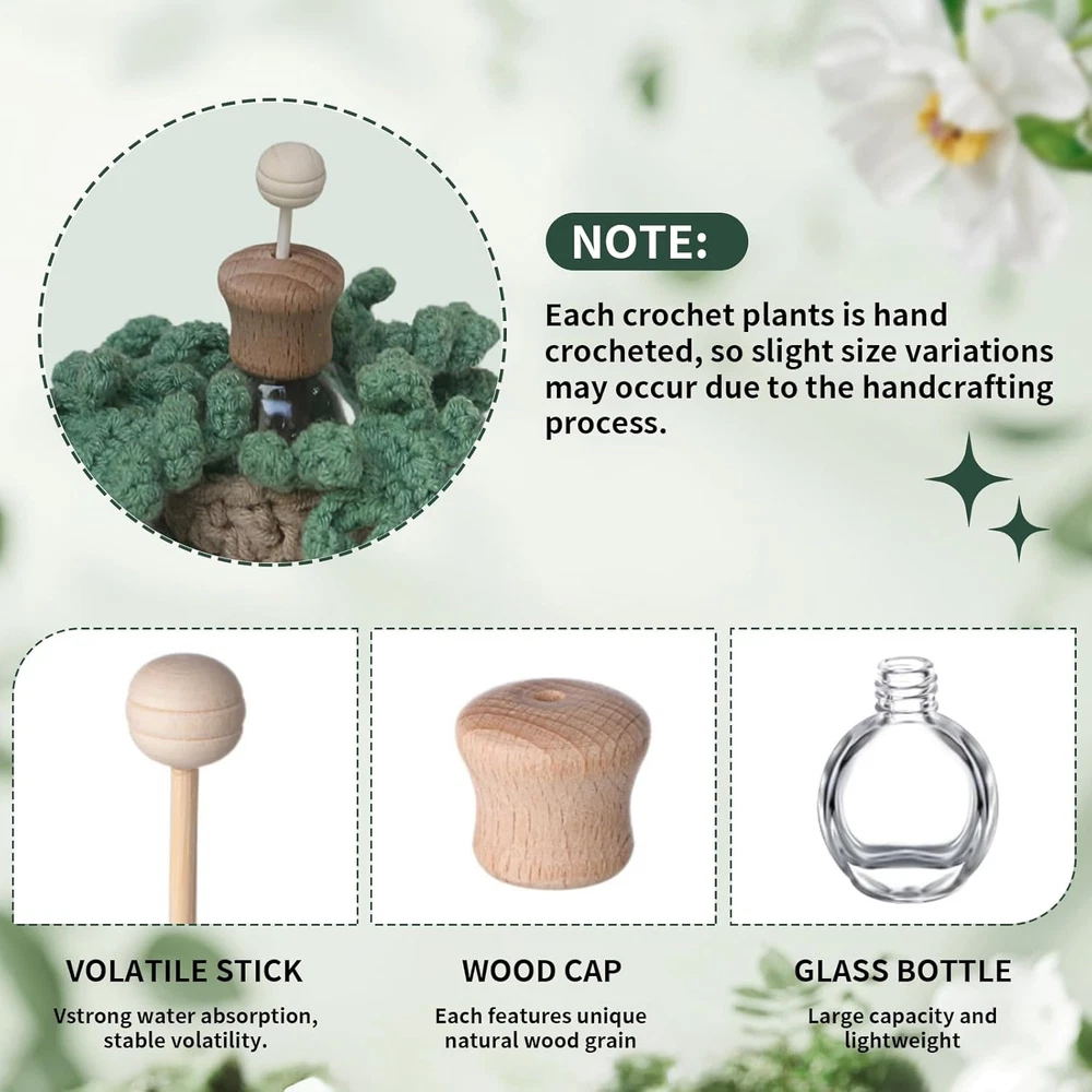 Store New Arrivals Add to Favorite View Feedback Contact Car Ornaments Refillable Crochet Car Air Freshener 12Ml Diffuser Bottle with Cute Potted Plant Car Mirror Decor Hanging, Car Accessories Air Hanging Fragrance Oil Diffuser Description Item model number 761729026961 Unit Count 1.0 Count Number of Items 1 Item Form Pod Package Dimensions 3.1 x 3.1 x 2 inches; 1.92 ounces Charming Crochet Plants: This car mirror hanging accessories combines adorable plants with a fragrance bottle,showcasing a unique aesthetic that infuse your car with life and vitality, creating a warm and relaxing ambiance Meticulously Handcrafted: Each crochet car accessories is lovingly handcrafted from high-quality cotton yarn.No glue is used, the choice of eco-friendly materials ensures durability and safety Easy to Use: Creating your essential oil car freshener is simple and enjoyable. Just remove the cap, add your favorite fragrance or essential oil, secure the bottle, insert the diffuser stick, place it in the bag, and hang it on your rearview mirror Versatile and Reusable: The elastic opening can be easily adjusted and replaced. Whether you are adding perfume, essential oils, or aromatic items such as coffee beans, it is both a decorative and functional car charm and will not obstruct your view A Heartfelt Unique Gift: This air freshener pendant with boho plant is beautifully packaged, resembling a warm blessing perfect for any occasion. It conveys love and good wishes to friends and family, creating a special emotional connection for everyone who receives it Product Description It is not only a decorative item, but also a unique scent in your car. You can choose the scent you like, so that it accompanies you through every wonderful moment of your journey. Using Crochet Car Air Diffuser Only Requires Three Steps 1.UNTIE THE KNOT.Then take out the bottle. 2.Add your favourite essential oils to the bottle, Then insert the volatile stick 3.Put the bottle in then secure the bottle with a knot NOTE: Each crochet plants is hand crocheted, so slight size variations may occur due to the handcrafting process. VOLATILE STICK Vstrong water absorption, stable volatility WOOD CAP Each features unique natural wood grain GLASS BOTTLE Large capacity and lightweight Exclusne Art for Driving In the crochet plant basket,whether you add perfume, essential oils, or aromatic items such as coffee beans, it is a both decorative and functional Hanging Crochet. It can also be used as a car mirror decoration without interfering with driving. Cute Potted Plants Car Mirror Hanging Jewelry with Wide Application Crochet car air freshener can also be decorated in your living room, bedroom, office, closet to fill your environment with unique fragrance Crochet for love This pendant comes in a paper box, making it an ideal present for any occasion. It can be given as a push for hard work, to convey warm wishes to loved ones, or to express deep affection to a beloved. ABOUT US We offer the best prices around on high quality products. Our E-store includes media such as books, movies, music and games while offering electronics, toys, sporting apparel, clothing, tools, general home, garden items and more. SHIPPING We are always working hard to ensure your package arrives as soon as possible. Please understand that some factors like weather, high postal traffic, and the performance of shipping companies are outside of our control. We offer free shipping to the lower 48 states and ship within 2 business days of payment, usually sooner. We do not accept P.O. Boxes. Please provide a physical address. For shipping outside of the continental USA, we only use eBay's Global Shipping Program.The item is shipped to KY and then sent to the rest of the world. International customers are responsible for all duties and taxes. Continue to check out in order to calculate costs for shipping the item to your country. Messages regarding eBay's Global Shipping Program MUST be directed at eBay EXCLUSIVELY. RETURNS We offer a 30-Day Return Policy on items which you are not completely satisfied with. You have the option for a full-refund or an exchange of the item. No returns are available on items shipped outside of the USA. PAYMENT We accept PayPal. CONTACT US This page content is yet to come Please ad us to your favorite seller and visit again later Thank You CUSTOMER SATISFACTION We try our very best to make sure every customer is completely satisfied. If there's a problem, message us! We're happy to help. WE ACCEPT Copyright © 2021 AutoDS. | All Rights Reserved