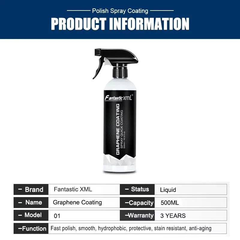 Description: Capacity: 500ML Weight: about 630g USAGE: Cleans off dirt and stains on the surface of your car and dry it with a towel. Directly spray the cleaner on the desired area. Use a towel or to wipe evenly until the surface is bright and smooth. Enjoy the stunning shiny gloss finish! Specifications: 【Nano Coating Technology】Forming a coating layer, bright as new, forming a coating layer after coating to restore the paint to the factory state. 【Hydrophobic & Stainproof 】Dust, dirt and other stains are easy to adhere to the paint surface, making the paint surface dirty, with a lotus leaf effect after coating, improving the self-cleaning and hydrophobicity of the paint surface. 【Improve hardness, reduce scratches】Form a protective layer after coating, reduce or avoid scratches caused by external forces, and reduce damage to paint. 【High temperature resistance】Can effectively resist the oxidative discoloration problem caused by high temperature after coating, make the paint brighter. 【Easy to Use】Simple two-step application; simply spray & swipe to glossy surfaces that look like glass. Package Included: 1x 500ML Nano coating spray