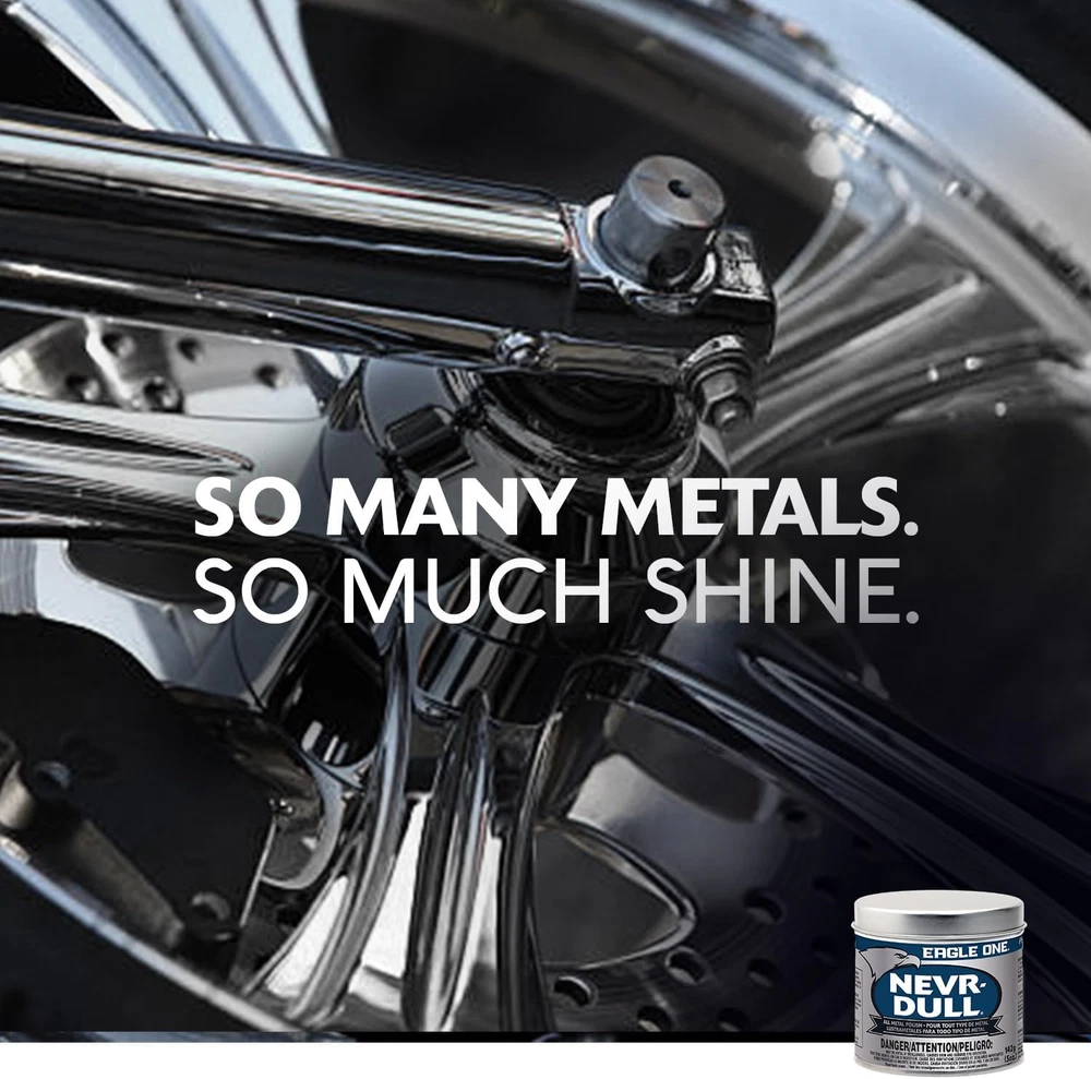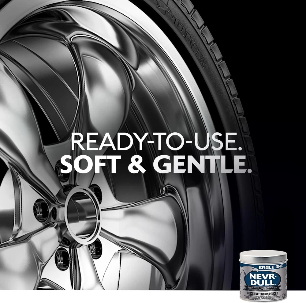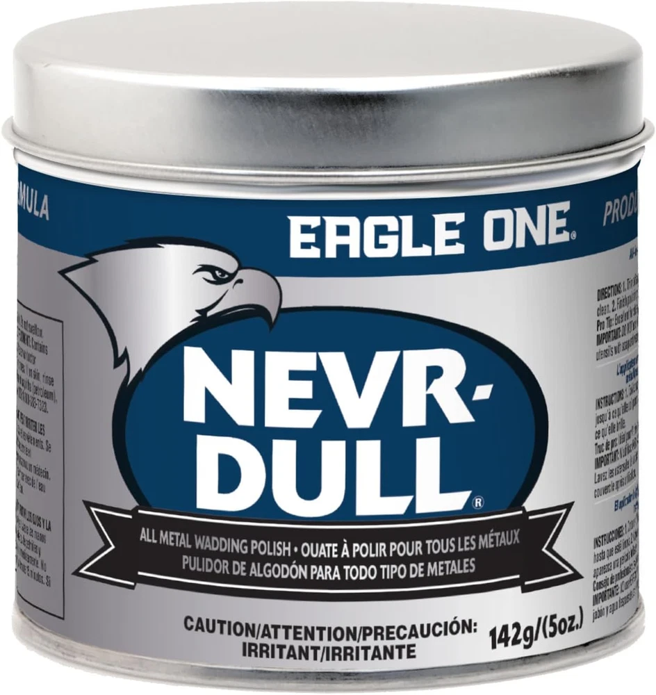 One 5 oz can of Eagle One Nevr-Dull All Metal Wadding Polish All metal polish gives surfaces an impressive shine with minimal mess Auto polish that removes rust, corrosion and tar without leaving deposits behind Cleans and protects metal surfaces to restore them to a sparkling finish Chrome polish for cars that's also an ideal RV, motorcycle and boat polish Try using this aluminum polish on silverware, fishing gear, and other metal surfaces inside and outside the home Maintains the appearance of any metal surface Remove rust and tar with little mess and easy application Non-abrasive for a gentle, yet detailed clean and polish Eagle One Nevr-Dull All Metal Wadding Polish gives surfaces an impressive shine. The mildly abrasive cotton paste texture protects metal surfaces and removes rust, corrosion and tar without scratching surfaces or leaving deposits. This rubbing compound polishes to perfection, giving steel, aluminum and chrome surfaces on your motorcycle or car a sleek shine. Although it's a great addition to your auto care products, Eagle One Nevr-Dull is more than an automotive polish. Try using this steel polish on tools, silverware, fishing gear, steel sinks and metal trim. Just a little goes a long way.