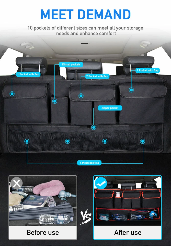 Product Description Car Trunk Organizer Large Capacity Storage Bag Backseat Stowing And Tidying Car Accessories Oxford Cloth Black/Red Line Add our listing to Watchlist Or Add to Cart , you will get more discount Description: Condition: Brand New Material: 600D Oxford Cloth Size: 107cmx52cm(42"x20.5") Color: Black&Red Features: 1. Keeps your car organized and clean 2.Perfectly designed to fit most vehicles 3. Can be fixed to the back of the seat, convenient to use 4.Large capacity, can store your magazines, CD, tissue box . Notice: 1.The pictures are for reference only. The actual product shall prevail.Your satisfaction is our utmost concern. 2.Please contact us to better resolve any issue before leaving any neutral or negative feedback.Thanks a lot! Package: 1pcs Payment Returns Contact Us Shipping We accept payment by PayPal only ! Payment should be completed within 5 days after buyer places the order,or else an unpaid case will be opened in order to cancel the transaction. If you can not pay in time, please contact us. e-check from PayPal will only be processed once the payment clears. All of the items will be shipped to buyer's EBAY address,please confirm your address on Ebay before you buy.Your order will be usually shipped out the same or next business days once the payment is made and cleared. 30-day Warranty with Exchange for defective, malfunctioned, incorrect or parts-missing items. Please notify us and return the item with all parts and accessories packed and marked "FOR EXCHANGE" within 14 days of receipt. If defective, malfunctioned or parts-missing items are no longer available, a refund may be issued. All returning postage costs will be the responsibility of the buyers under all circumstances. If you encounter any problems about anything, please feel free to contact us and we will do our best to assist you solve the issue. If you are not satisfied in anyway, please feel free to let us know and give us a second chance to correct it before you decide to leave any neutral or negative feedback. Please contact us through eBay link if you have any questions. We will reply you within 24- 48 hours. Please check you spam mail if no response for 48 hours. All items will be checked before packing. All items are new and of high quality. Item will be shipped within 1 business days upon receipt of payment, excluding weekends and public holidays. If to USA,we will ship your order by USPS,it will take about 8-12 working days to you,and you can track it on line. If to other country,we will ship your order by China Post or Singapore Registered Air Mail,it will take about 14-21 working days to you,you aslo can track it on line. Delivery time is about 14-28 business days and it may take up to 8 weeks . Payment We accept payment by PayPal only ! Payment should be completed within 7 days after buyer places the order,or else an unpaid case will be opened in order to cancel the transaction. If you can not pay in time, please contact us. eCHECK from PayPal will only be processed once the payment clears. All of the items will be shipped to buyer's EBAY address,please confirm your address on Ebay before you buy.Your order will be usually shipped out the same or next business days once the payment is made and cleared. Returns 30-day Warranty with Exchange for defective, malfunctioned, incorrect or parts-missing items. Please notify us and return the item with all parts and accessories packed and marked "FOR EXCHANGE" within 14 days of receipt. If defective, malfunctioned or parts-missing items are no longer available, a refund may be issued. All returning postage costs will be the responsibility of the buyers under all circumstances. Contact Us If you encounter any problems about anything, please feel free to contact us and we will do our best to assist you solve the issue. If you are not satisfied in anyway, please feel free to let us know and give us a second chance to correct it before you decide to leave any neutral or negative feedback. Please contact us through eBay link if you have any questions. We will reply you within 24- 48 hours. Please check you spam mail if no response for 48 hours. Shipping All items will be checked before packing. All items are new and of high quality. Item will be shipped within 1 business days upon receipt of payment, excluding weekends and public holidays. If to USA,we will ship your order by USPS,it will take about 7-10 working days to you,and you can track it on line. If to other country,we will ship your order by China Post or Singapore Registered Air Mail,it will take about 14-21 working days to you,you aslo can track it on line. Delivery time is about 14-28 business days and it may take up to 8 weeks . Welcome to our Store ~