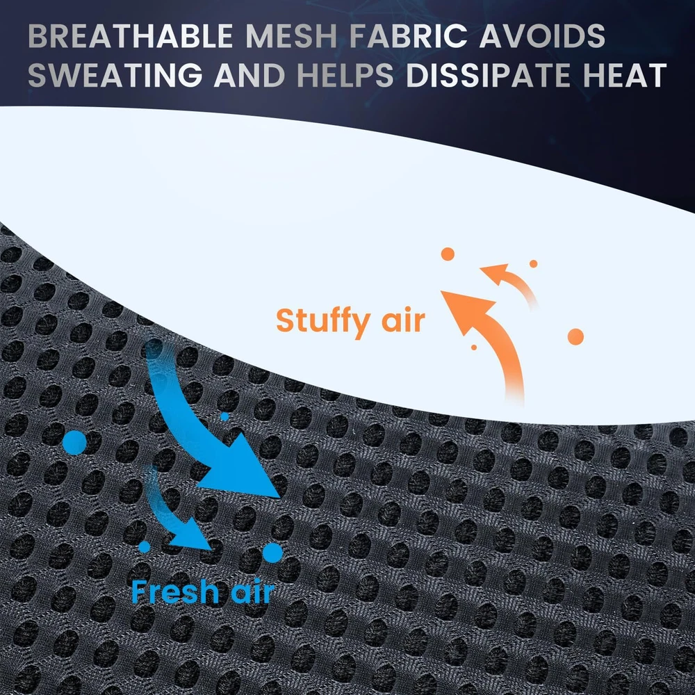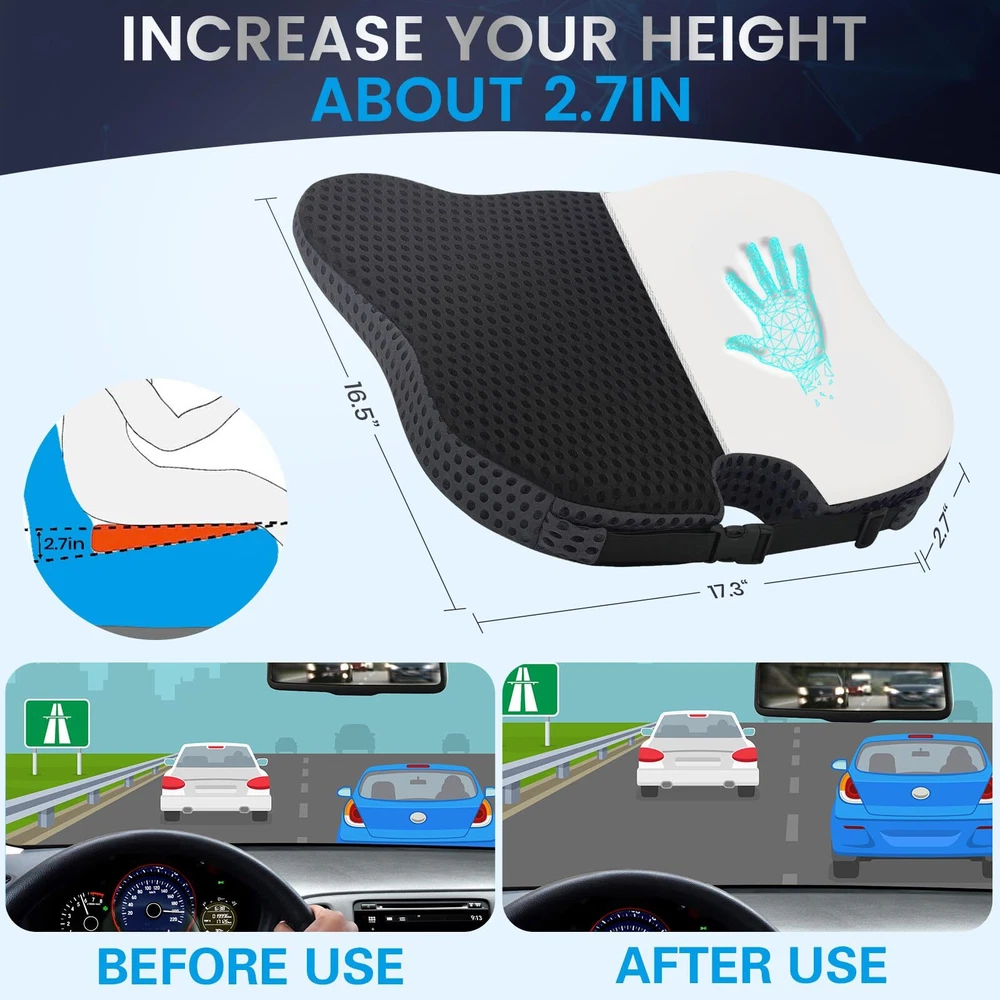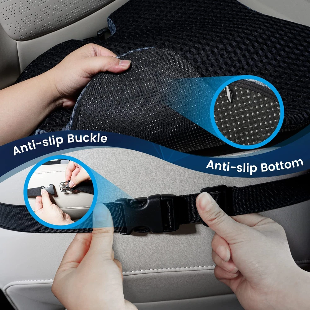✔️UPGRADED ERGONOMICS AND DESIGN: Long-term driving is prone to back or leg pain, our cushion's unique ergonomics and orthopedic design help relieve sciatica, pelvis, cheekbones or tailbone pain when driving; effectively reduce leg pain, fatigue and numbness, making your driving more comfortable. ✔️ERGONOMIC DESIGN: Long-term driving is prone to back pain, our cushion's unique ergonomics and orthopedic design help relieve sciatica, pelvis, cheekbones or tailbone pain; effectively reduce leg pain, fatigue and numbness, making Driving is more comfortable. To relieve the pressure on the tail, sciatica and prolonged sitting posture. ✔️BREATHABLE MESH FABRIC SURFACE: With high-quality breathable mesh fabric material as surface of the seat cushion. It will be no smell anymore even use in the summer days. Just can perfectly give you good experience in whichever season, and you can easily remove the fabric cover to do a wash and clean. ✔️Non-Slip BOTTOM DESIGN: Non-slip bottom design with silicone gel surface, it can be firmly fixed on the seat without sliding, plus there is a retractable buckle design fixed firmly with the seat to keep the mat stable and not slip when driving. ✔️ MAKE EVERY CHAIR COMFORTABLE : This orthopedic seat cushion nicely fits in most of the chairs. Take it with you in your car, truck,plane, train, office, or anywhere you have to seat for a long time. The handle on the sides allows for convenient carrying. Great for travelers, office going individuals and pregnant women. ✔️Amazing Gift : A amazing birthday or Christmas gift for family, friends and pregnant women. Relieve sciatica, arthritis, lower back, buttocks, spine, post-operative injuries or pregnancy pain relief.
