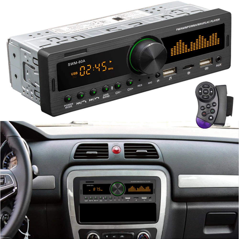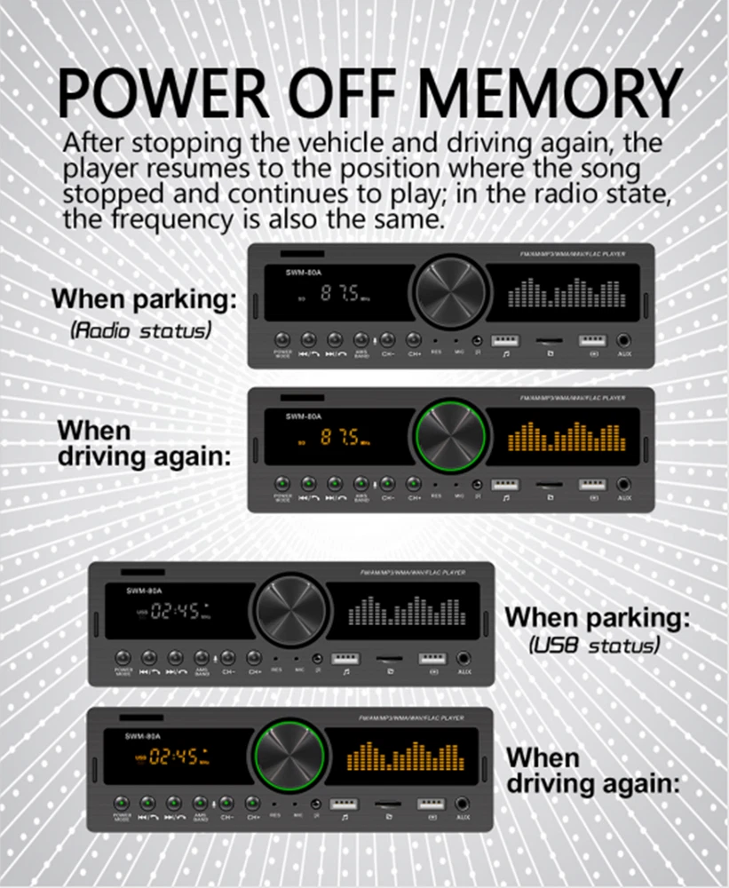 Product Description Car Stereo MP3 Player Bluetooth AUX USB TF FM Radio Audio In-dash Handsfree MIc Features: Model: SWM-80A Voltage: 12V Type: Car MP3 Software solution: SWT6D801 Screen model: LED digital tube + frequency screen Screen size: LED digital tube + frequency screen Panel size: 188*58mm Panel lighting: colorful lighting Gift box size: 208*84*125mm Host depth: 60mm Single machine: 398g Mobile phone connection: mobile phone APP connection Radio band: FM/AM Radio chip: ZT0811 Power: 60W Working temperature: -10~60 degrees Bluetooth model: version 5.0 Power amplifier chip: TDA7388 Radio frequency: FM 87.5~108MHz/A522~1620KHZ TF card slot: TF small card Remote control: card remote control USB interface and version: 2 USB ports, one charging, one USB2.0 reading Reset button: Yes Buttons: physical buttons RCA terminal introduction: 4 RCA outputs (red/white lotus jack) Front aux audio input: Yes Supported audio format: MP3/WMA/WAV/FLAC Complete machine list: Main unit + power cord + remote control + manual + disassembly key basic skills 1. Radio (FM/AM) 2. Card reader, U disk (audio) 3.AUX function 4. Bluetooth function 5. RCA audio output can be connected to subwoofer 6. Mobile APP connection 7. Locate and find car function 8. Mobile phone voice assistant (voice control) 9. Audio source copy function 10. Colorful lights Note: Please allow 1-3mm differs due to manual measurement. Due to the different display and different light, the picture may not show the actual color of the item. Thanks for your understanding. Payment Returns Contact Us Shipping We accept payment by PayPal only ! Payment should be completed within 5 days after buyer places the order,or else an unpaid case will be opened in order to cancel the transaction. If you can not pay in time, please contact us. e-check from PayPal will only be processed once the payment clears. All of the items will be shipped to buyer's EBAY address,please confirm your address on Ebay before you buy.Your order will be usually shipped out the same or next business days once the payment is made and cleared. 30-day Warranty with Exchange for defective, malfunctioned, incorrect or parts-missing items. Please notify us and return the item with all parts and accessories packed and marked "FOR EXCHANGE" within 14 days of receipt. If defective, malfunctioned or parts-missing items are no longer available, a refund may be issued. All returning postage costs will be the responsibility of the buyers under all circumstances. If you encounter any problems about anything, please feel free to contact us and we will do our best to assist you solve the issue. If you are not satisfied in anyway, please feel free to let us know and give us a second chance to correct it before you decide to leave any neutral or negative feedback. Please contact us through eBay link if you have any questions. We will reply you within 24- 48 hours. Please check you spam mail if no response for 48 hours. All items will be checked before packing. All items are new and of high quality. Item will be shipped within 1 business days upon receipt of payment, excluding weekends and public holidays. If to USA,we will ship your order by USPS,it will take about 8-12 working days to you,and you can track it on line. If to other country,we will ship your order by China Post or Singapore Registered Air Mail,it will take about 14-21 working days to you,you aslo can track it on line. Delivery time is about 14-28 business days and it may take up to 8 weeks . Payment We accept payment by PayPal only ! Payment should be completed within 7 days after buyer places the order,or else an unpaid case will be opened in order to cancel the transaction. If you can not pay in time, please contact us. eCHECK from PayPal will only be processed once the payment clears. All of the items will be shipped to buyer's EBAY address,please confirm your address on Ebay before you buy.Your order will be usually shipped out the same or next business days once the payment is made and cleared. Returns 30-day Warranty with Exchange for defective, malfunctioned, incorrect or parts-missing items. Please notify us and return the item with all parts and accessories packed and marked "FOR EXCHANGE" within 14 days of receipt. If defective, malfunctioned or parts-missing items are no longer available, a refund may be issued. All returning postage costs will be the responsibility of the buyers under all circumstances. Contact Us If you encounter any problems about anything, please feel free to contact us and we will do our best to assist you solve the issue. If you are not satisfied in anyway, please feel free to let us know and give us a second chance to correct it before you decide to leave any neutral or negative feedback. Please contact us through eBay link if you have any questions. We will reply you within 24- 48 hours. Please check you spam mail if no response for 48 hours. Shipping All items will be checked before packing. All items are new and of high quality. Item will be shipped within 1 business days upon receipt of payment, excluding weekends and public holidays. If to USA,we will ship your order by USPS,it will take about 7-10 working days to you,and you can track it on line. If to other country,we will ship your order by China Post or Singapore Registered Air Mail,it will take about 14-21 working days to you,you aslo can track it on line. Delivery time is about 14-28 business days and it may take up to 8 weeks . Welcome to our Store ~