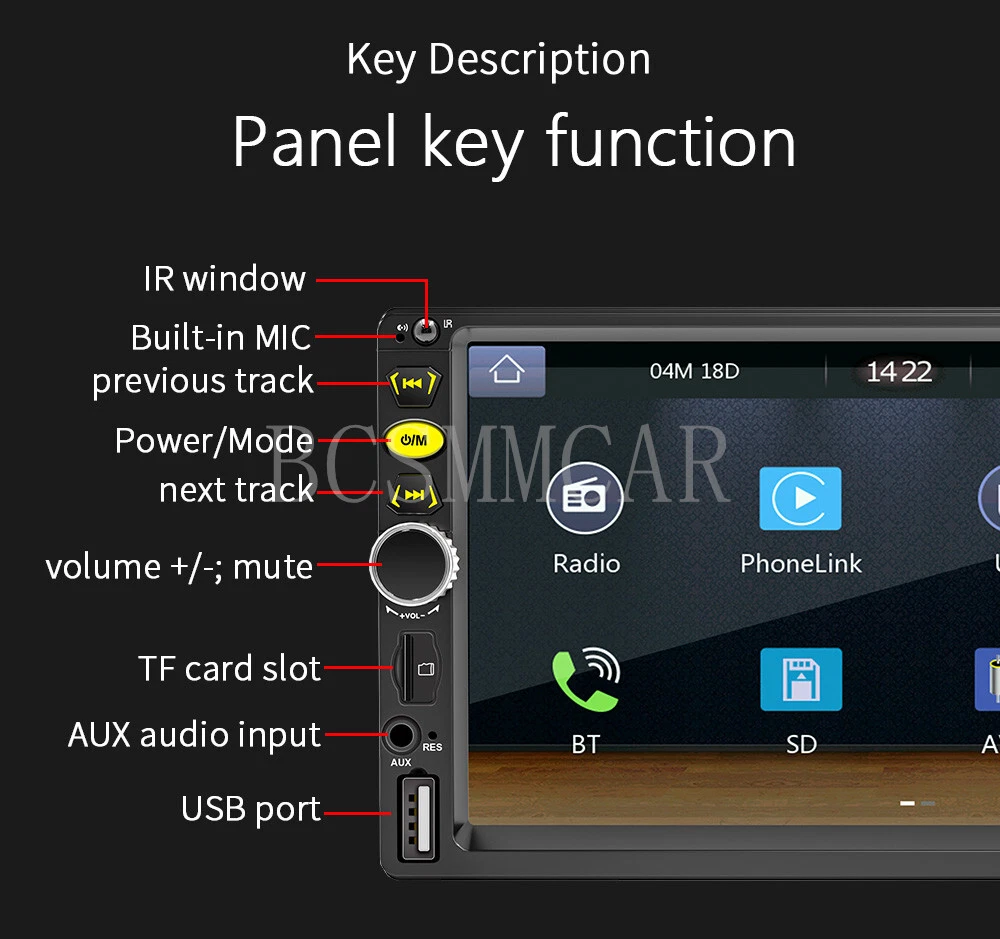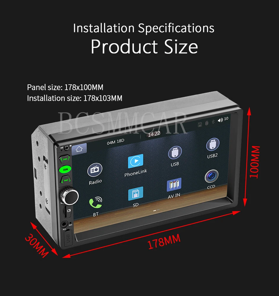Product View Detail 7" 2DIN For Apple Carplay Car Stereo Radio Bluetooth Touch screen SD USB AUX-IN FM Video MP5 Player With 4LED Rear Camera Kit Note:Not is universal , Please check with your car panel's size !!! Supports CarPlay function on Apple phones and Android Auto function on Android phones, allowing you to navigate, make calls, send and receive messages, and listen to your favorite songs. All of this is integrated into the central control display screen inside the car. Bluetooth 5.1 version compared to the previous generation: 1. More stable signal; 2. Most mobile phones can automatically pair; 3. Lower power consumption and more environmentally friendly. Product Introduction: Type: Car MP5 Radio frequency: FM 87.5-108.0MHz AM522-1620KHz (AM display blocked on website) Output power: 60Wx4 Working voltage: 12~14.4V Working temperature: -10~60 ℃ Bluetooth version: 5.1 (default name: Car BT) Display resolution: 800x480 Screen size: 7 inches Installation size: 178x103MM Total number of boxes: 20 units Single unit weight: 0.682KG Net weight of the whole box: 13.64KG Audio format: MP3/AAC/APE/OGG/M4A/RA/WAV Video format: H263/H264/H265/DIVX HD/AVI/FLV/MKV/MPEG/MP4/WMV9/VC/ASF/TS/QT Image format: JPEG/PNG/BMP/GIF/TIFF Language parameters: English/Chinese/French/German/Italian/Japanese/Portuguese/Russian/Spanish Accessories: 1. Host 2. Manual 3. Power cord 4. Remote control 5.4LED Rear Camera Shipping Policy Payment Method Returns Policy Shipping Policy Payment Method Returns Policy Copyright © 2017 DataCaciques Home Payment Shipping About us Contact us BCSMMCAR Store Categories Store Categories Other Product View Detail 7" 2DIN For Apple Carplay Car Stereo Radio Bluetooth Touch screen SD USB AUX-IN FM Video MP5 Player With 4LED Rear Camera Kit Note:Not is universal , Please check with your car panel's size !!! Supports CarPlay function on Apple phones and Android Auto function on Android phones, allowing you to navigate, make calls, send and receive messages, and listen to your favorite songs. All of this is integrated into the central control display screen inside the car. Bluetooth 5.1 version compared to the previous generation: 1. More stable signal; 2. Most mobile phones can automatically pair; 3. Lower power consumption and more environmentally friendly. Product Introduction: Type: Car MP5 Radio frequency: FM 87.5-108.0MHz AM522-1620KHz (AM display blocked on website) Output power: 60Wx4 Working voltage: 12~14.4V Working temperature: -10~60 ℃ Bluetooth version: 5.1 (default name: Car BT) Display resolution: 800x480 Screen size: 7 inches Installation size: 178x103MM Total number of boxes: 20 units Single unit weight: 0.682KG Net weight of the whole box: 13.64KG Audio format: MP3/AAC/APE/OGG/M4A/RA/WAV Video format: H263/H264/H265/DIVX HD/AVI/FLV/MKV/MPEG/MP4/WMV9/VC/ASF/TS/QT Image format: JPEG/PNG/BMP/GIF/TIFF Language parameters: English/Chinese/French/German/Italian/Japanese/Portuguese/Russian/Spanish Accessories: 1. Host 2. Manual 3. Power cord 4. Remote control 5.4LED Rear Camera Shipping Policy Payment Method Returns Policy Contact US Shipping Policy All items will be checked before packing. All items are new and of high quality. Item will be shipped within 1 business days upon receipt of payment, excluding weekends and public holidays. If to USA,we will ship your order by USPS,it will take about 8-12 working days to you,and you can track it on line. If to other country,we will ship your order by China Post or Singapore Registered Air Mail,it will take about 14-21 working days to you,you aslo can track it on line. Delivery time is about 14-28 business days and it may take up to 8 weeks . Payment Method We accept payment by PayPal only ! Payment should be completed within 5 days after buyer places the order,or else an unpaid case will be opened in order to cancel the transaction. If you can not pay in time, please contact us. e-check from PayPal will only be processed once the payment clears. All of the items will be shipped to buyer's EBAY address,please confirm your address on Ebay before you buy.Your order will be usually shipped out the same or next business days once the payment is made and cleared. Returns Policy 30-day Warranty with Exchange for defective, malfunctioned, incorrect or parts-missing items. Please notify us and return the item with all parts and accessories packed and marked "FOR EXCHANGE" within 14 days of receipt. If defective, malfunctioned or parts-missing items are no longer available, a refund may be issued. All returning postage costs will be the responsibility of the buyers under all circumstances. Contact US If you encounter any problems about anything, please feel free to contact us and we will do our best to assist you solve the issue. If you are not satisfied in anyway, please feel free to let us know and give us a second chance to correct it before you decide to leave any neutral or negative feedback. Please contact us through eBay link if you have any questions. We will reply you within 24- 48 hours. Please check you spam mail if no response for 48 hours. Home Payment Shipping About us Contact us