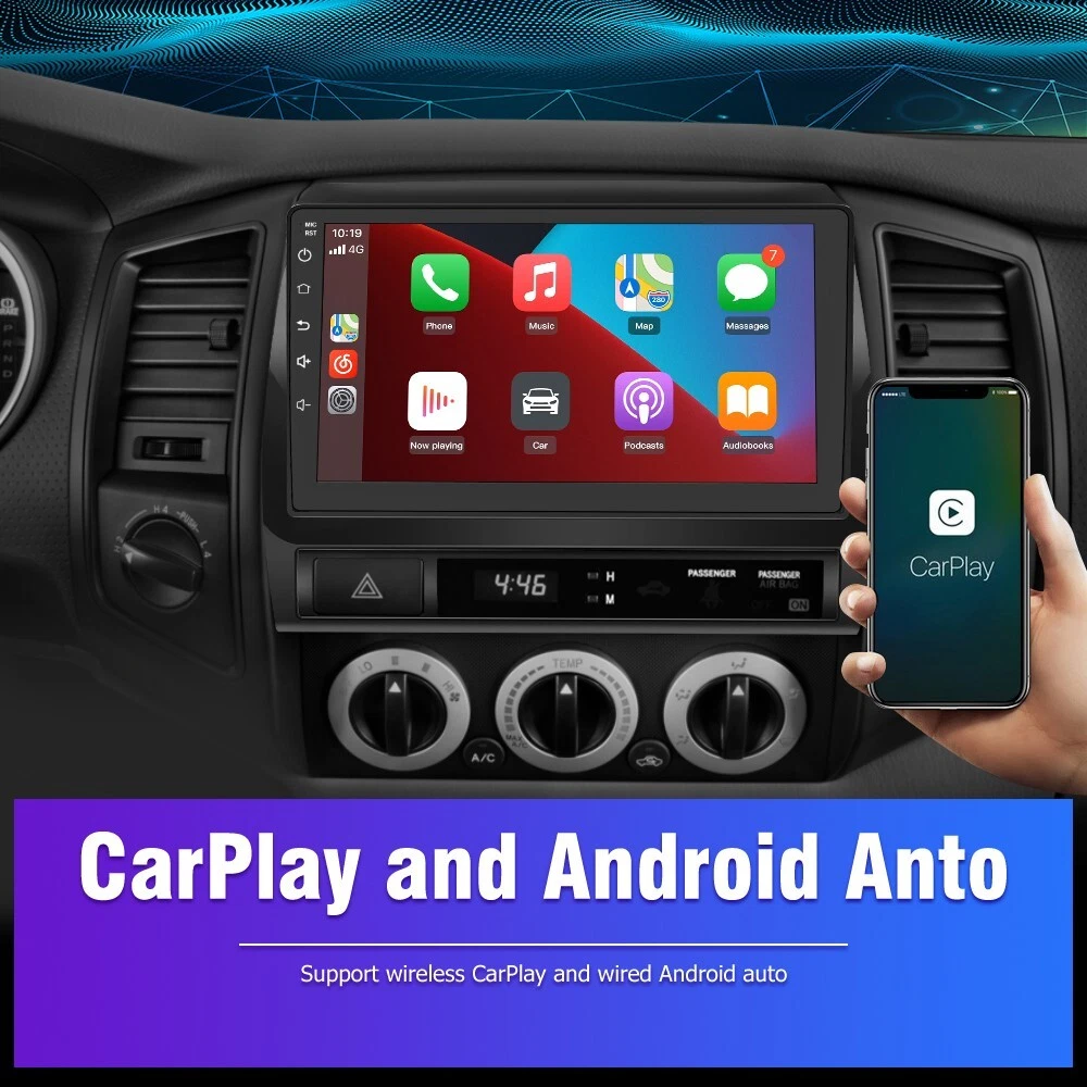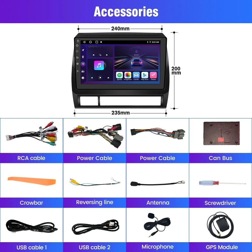 【Applicable Car Models】 Compatible with Toyota Tacoma 2005 2006 2007 2008 2009 2010 2011 2012 2013 2014 2015. 9" HD 1280P touchscreen. 2GB (RAM) + 32GB (ROM) of memory. 【GPS Navigation & WiFi】 Built in GPS module. Supprt Online and Offline map app. After connected to WiFi, you can use GPS Navigation at anywhere. 【Wireless Carplay & Android Auto】 Compatible with IOS and Android system, connected by USB/WIFI/BT. Wireless and wired connect your phone to the carplay tacoma radio. You can get directions, make calls, send and receive messages, and enjoy music after connection. 【Plug and Play 】 Reatined factory Steering Wheel Control and Factory Backup Camera. The harness come with two different connector to fit factory back up camera. 【Radio with Bluetooth and RDS】 Built-in microphone, support answer/ make calls by hands-free. High quality digital stereo (RDS) FM tuner, can search radio stations automatically/semi-automatically and accurately. You can control the volume of each speaker before and after and it has stereo EQ: jazz, rock, pop, classic, etc. Technical Details Applicable models:For Toyota Tacoma 2005 2006 2007 2008 2009 2010 2011 2012 2013 2014 2015 System:Android 12 RAM & ROM:2 GB RAM 32GB ROM Screen size:9" IPS Touch Screen; 1280*720 Audio format:MP3, AAC, FLAC, APE etc Photo format:JPG, JPEG, GIF, PNG etc Video format:MPEG, AVI, ASF, MP4, DAT, VOB, OGM etc Wifi (Dual Brand):2.4Ghz & 5Ghz Carplay/Android Auto:Compatible with Wireless carplay/Android Auto Wireless and Wired Carplay/Android Auto Wireless connection:support connect Carplay or Android Auto by WIFI/BT Wired connection:support connect Carplay or Android Auto by Original USB cable. Note: Android users need to pre-install "Android Auto" APP in your phone How to Use Wireless CarPlay/Android Auto via zlink5 application? 1.Pair BT with radio and iPhone 2.Turn on the Zlink5, and Wait for connection If the wireless connection is failed, please open the hotspot on the car stereo and connect your phone to it, then open Zlink5 again. Bluetooth calls/music Once your phone is connected to car radio, you can sync the phonebook or music to the radio. If your car can use the steering wheel controls function, you can use the steering wheel directly to answer calls or adjust the volume and etc. (Note: If you want to make and receive calls by radio, after connecting to Bluetooth successfully, please select “Allow reading phonebook” and select the Bluetooth radio name call speaker on your mobile.) Steering Wheel Controls you can use the steering wheel controls function, directly answer the call or play the next song through the steering wheel buttons and etc, it will bring more safety to your driving. For some cars with steering wheel buttons, you need select the can type : Facting Setting-->CarType Setting-->SimpleSoft-Toyota-TOYOTA_XP01(2015 Camry) 1.FM stations and DSP sound effects 1.Frequency range: 18-Station presets. For up to date music, news, sport 2.It has DSP function, you can control the volume of each speaker in the front and rear, and it has a stereo equalizer: jazz, rock, pop, classical, etc.Also you can connect subwoofers, speakers, etc. via the RCA interfaces. GPS navigation It has pre-loaded North american map and you can plan your route directly by postal code / address / POI. You can choose 2D/3D maps while driving. 3D maps allow you to better identify buildings without having to worry about complex routes.