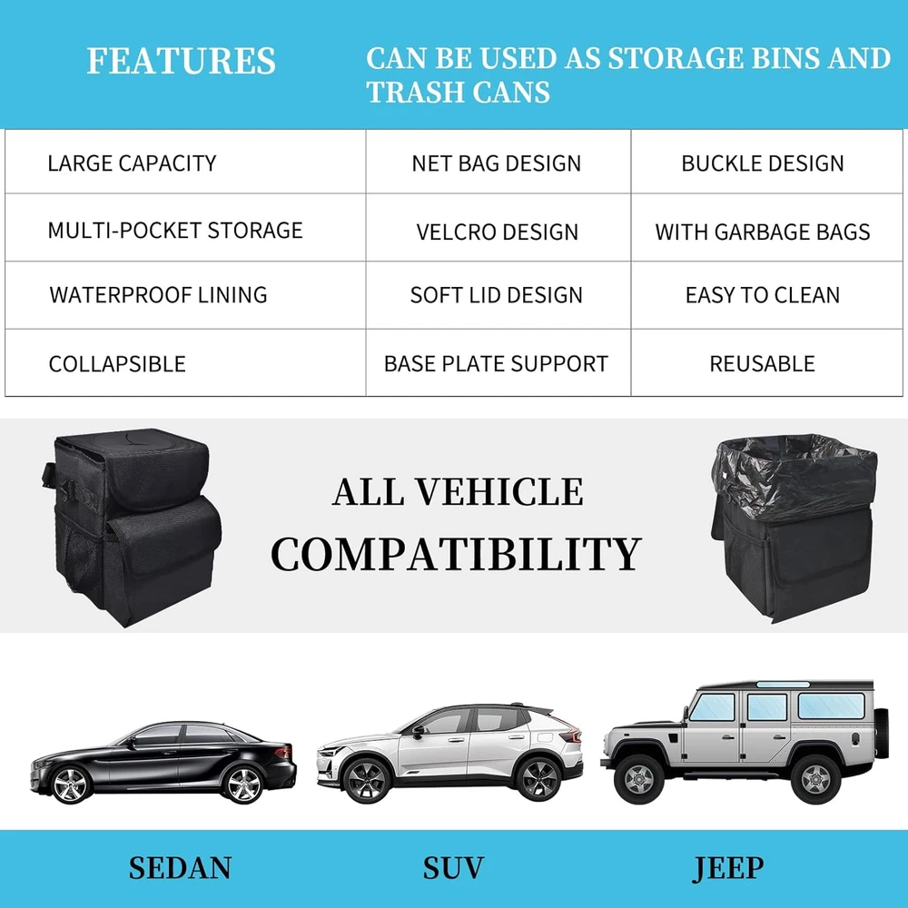 Store New Arrivals Add to Favorite View Feedback Contact Car Trash Can with 50 Trash Bags, Car Interior Accessories, Suitable for Car, Home Office Trash Can, Waterproof Car Trash Can, Foldable Car Trash Can, Storage Multi-Purpose Trash Can Description Item model number A8080 Room Type Car Capacity 6550 Milliliters Color black Special Feature With lid, foldable, large capacity, waterproof. Product Dimensions 0.48 x 0.9 x 1.05 inches; 2.47 ounces Material Polyester Country of Origin China Shape Square Opening Mechanism Open-Top Recommended Uses For Product Car, home, office, picnic camping, storage. Finish Type textile Car trash can and garbage bags combination: This car trash can is equipped with 50 garbage bags, which can be used as soon as you receive it,You can use it anywhere in the car, home, or office area, It can store paper towels, bottles, peels, umbrellas, snacks and other items。 car garbage can: In order not to take up space in your car, we designed this trash can to be foldable, making it easier and more enjoyable for you to use.The inside is made of EVA waterproof cloth, which is waterproof, leak-proof and easy to clean. You can also pour water in without getting soaked。 The car trash bin has adjustable straps so you can secure it nicely between the front seats of your car. It has a flap pocket on the front, a mesh bag on the left and a cloth bag on the right for multifunctional storage of your items,We added a fixed plate to the bottom of the car trash can。 car interior accessories collapsible size: The small one is 7.48 inches long, 5.9 inches wide, and 9.05 inches high,Large capacity storage,You can also use it when camping or picnicking。 car interior accessories We are professional。 Product Description We use waterproof EVA material for the lining of this car trash can. You can pour water directly into it and it will not get soaked, making it easy to clean. The Car interior accessories comes with 50 garbage bags and a fixing plate to fix the bottom of the lining. You can use it after you receive it. car trash bin for car Suitable for cars, outdoor picnics, home storage, offices, you can also develop more use functions. ABOUT US We offer the best prices around on high quality products. Our E-store includes media such as books, movies, music and games while offering electronics, toys, sporting apparel, clothing, tools, general home, garden items and more. SHIPPING We are always working hard to ensure your package arrives as soon as possible. Please understand that some factors like weather, high postal traffic, and the performance of shipping companies are outside of our control. We offer free shipping to the lower 48 states and ship within 2 business days of payment, usually sooner. We do not accept P.O. Boxes. Please provide a physical address. For shipping outside of the continental USA, we only use eBay's Global Shipping Program.The item is shipped to KY and then sent to the rest of the world. International customers are responsible for all duties and taxes. Continue to check out in order to calculate costs for shipping the item to your country. Messages regarding eBay's Global Shipping Program MUST be directed at eBay EXCLUSIVELY. RETURNS We offer a 30-Day Return Policy on items which you are not completely satisfied with. You have the option for a full-refund or an exchange of the item. No returns are available on items shipped outside of the USA. PAYMENT We accept PayPal. CONTACT US This page content is yet to come Please ad us to your favorite seller and visit again later Thank You CUSTOMER SATISFACTION We try our very best to make sure every customer is completely satisfied. If there's a problem, message us! We're happy to help. WE ACCEPT Copyright © 2021 AutoDS. | All Rights Reserved