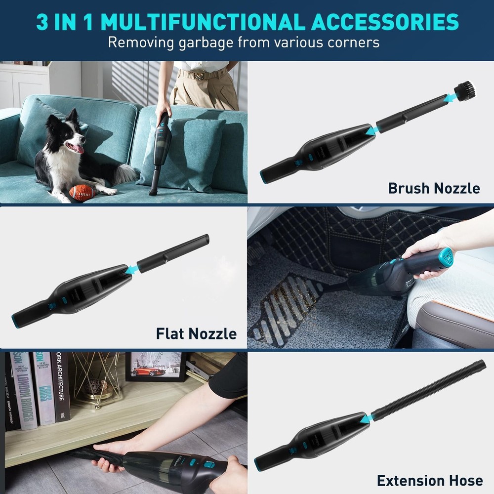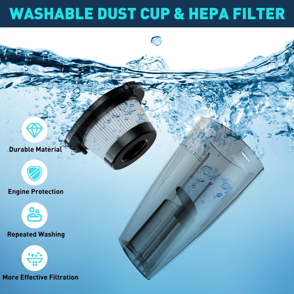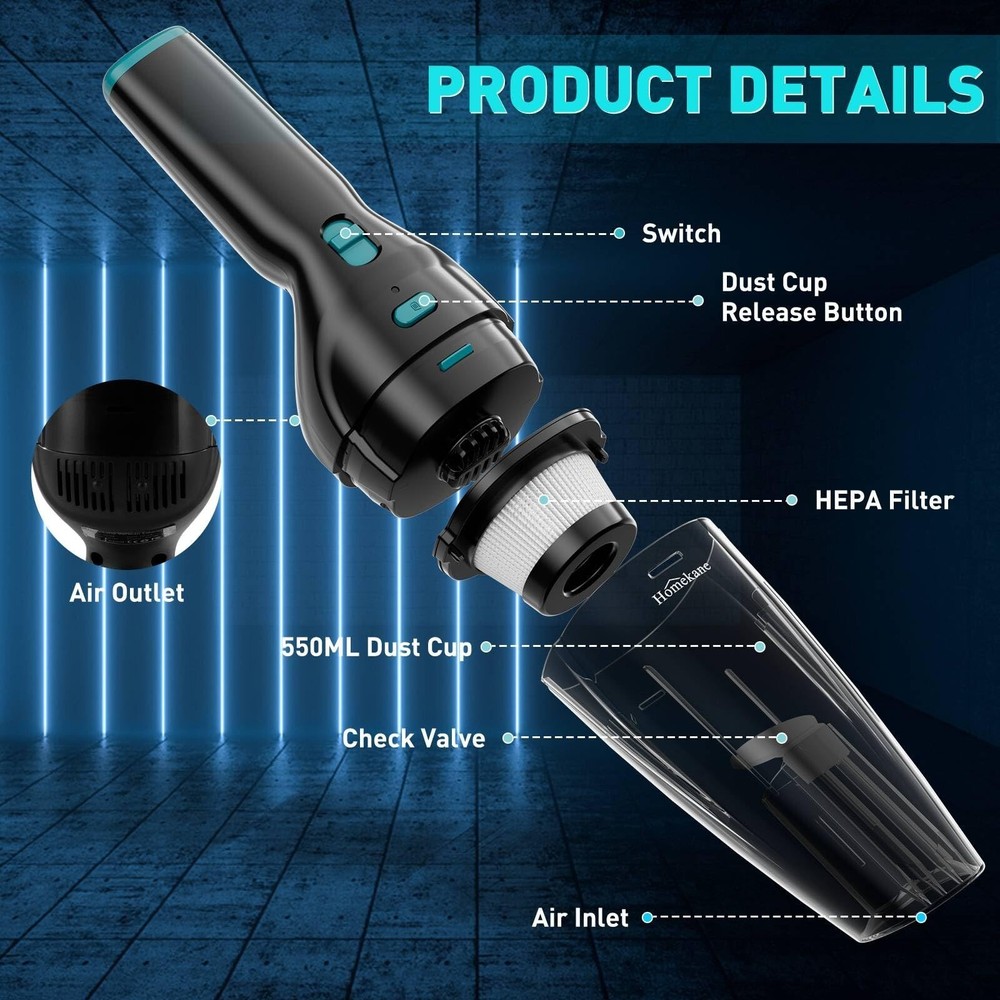 Car Vacuum Cleaner, Handheld Vacuum Cordless Rechargeable 9500Pa Powerful Suction, Portable & Lightweight, Fast Charge, Long Runtime for Home and Car Cleaning Product Details Style: 95W Brand: HOMEKANE MPN: GV08 UPC: Does not apply EAN: Does not apply Brand: HOMEKANE Special Feature: Portable, Lightweight, Washable Filter Filter Type: HEPA Filter Included Components: Dusting Brush Is Cordless?: Yes Brand: HOMEKANE Special Feature: Portable, Lightweight, Washable Filter Filter Type: HEPA Filter Included Components: Dusting Brush Is Cordless?: Yes Capacity: 0.55 Liters Wattage: 150 watts Charging Time: 3 Hours Recommended Uses For Product: Carpet, Hard Floor Form Factor: Handheld Color: Black 4 Model Name: Handheld Vacuum GV08-4 Product Dimensions: 13.39"L x 3.15"W x 3.54"H Battery Description: Lithium-Ion Noise Level: 69 dB Manufacturer: Shenzhen Hongkai lndustrial Co., Ltd Number of Items: 1 Controller Type: Push Button Motor Horsepower: 0.1955 horsepower Control Method: Touch Style: 95W Portable: Yes Indoor/Outdoor Usage: Indoor Item Weight: 1.2 pounds Country of Origin: China Item model number: GV08 Batteries required: No Battery type: Lithium-Ion Our cordless handheld vacuum boasts a strong 9500Pa suction for easy handling of household tasks. With noise levels below 69dB, it's perfect for daily use. It adopts the latest fast charging technology and upgraded 3x2000mAh rechargeable batteries. Keep fast charging and long runtime. The 550ml dust cup reduces cleaning time, and the washable HEPA filter blocks particles, maintaining strong suction. Weighing just 560g, it's easy for all ages to use. Cordless design enhances portability, letting you clean anywhere hassle-free. Various attachments meet different cleaning needs. From gaps and carpets to hard-to-reach places, it covers it all.