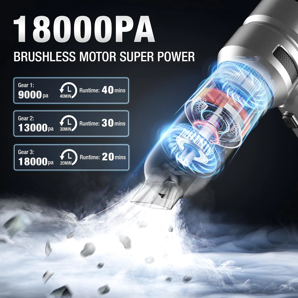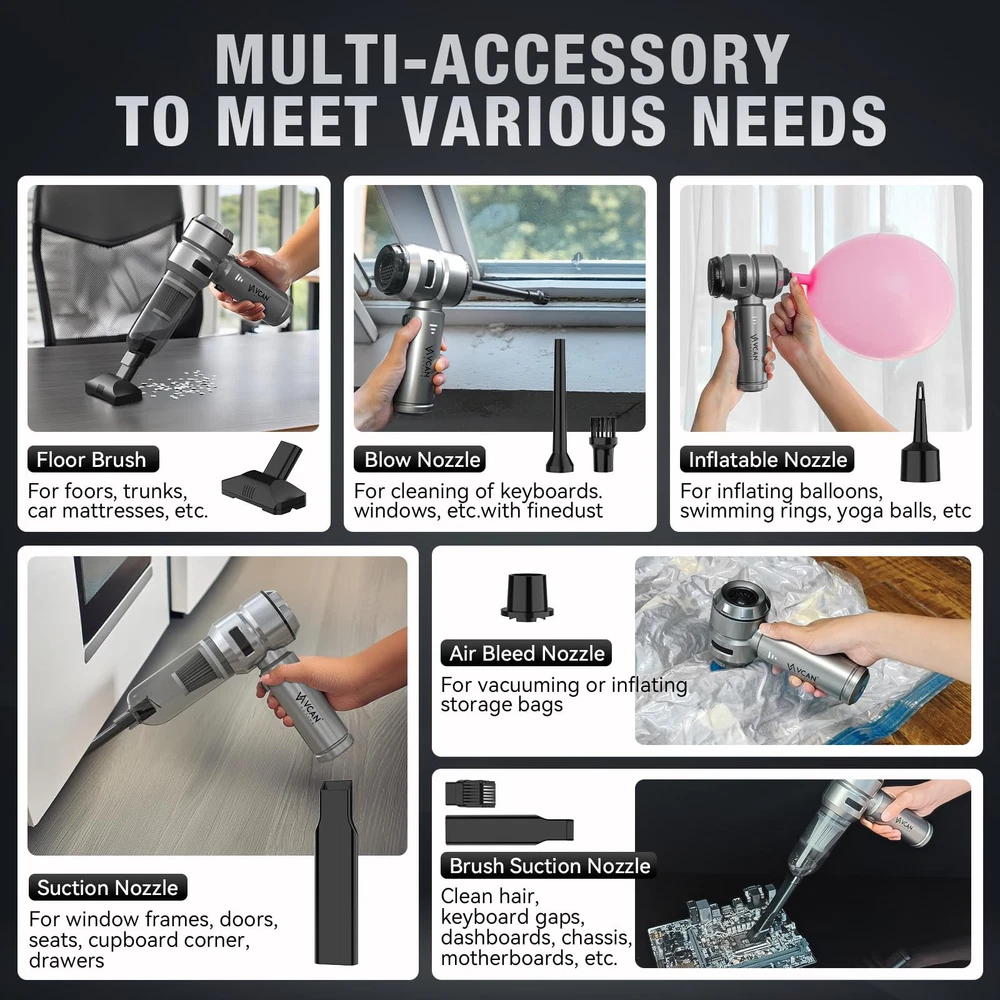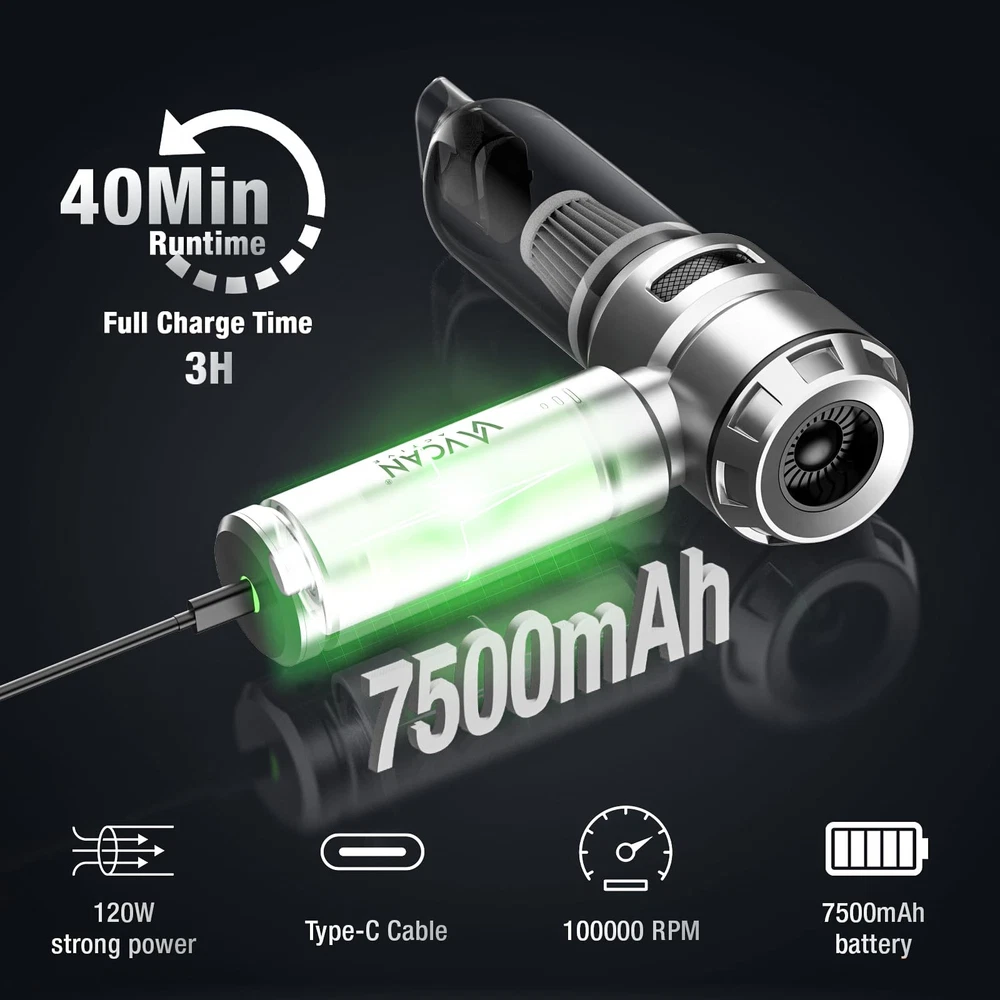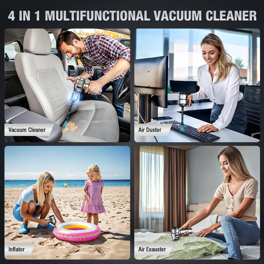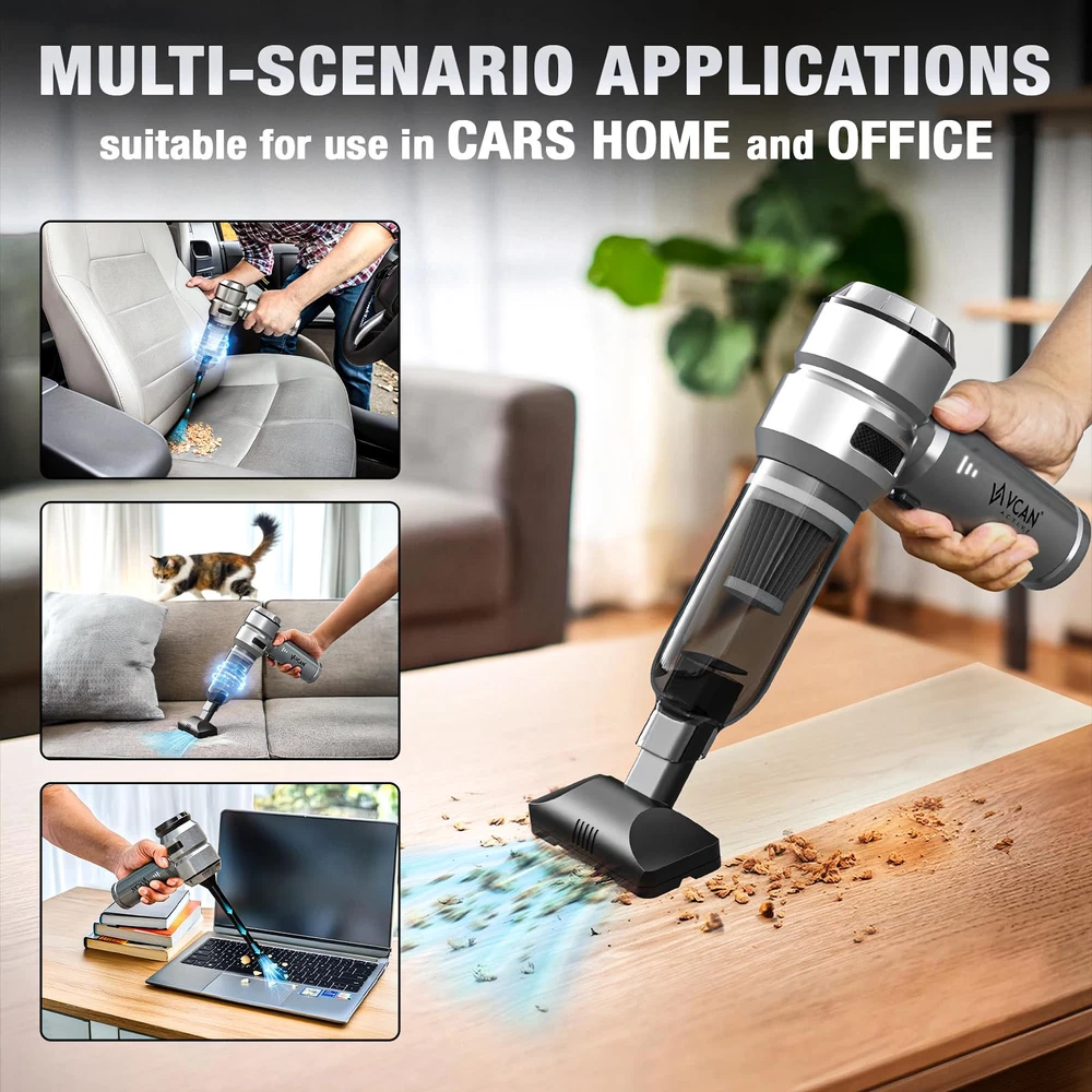 Powerful Suction: Our Car Vacuum Cleaner High Power features a high-performance motor that delivers strong suction, efficiently picking up dirt, crumbs, and debris from every corner of your vehicle. Keep your car spotless with minimal effort Compact & Portable: This portable car vacuum lightweight, only 0.88lb, compact vacuum is designed to fit easily in your car’s trunk or glove box. Makes it ideal for quick clean-ups at home or on the go, ensuring your car remains neat wherever you are Versatile Attachments: 4 IN 1 car vacuum cleaner equipped with multiple attachments, including a crevice tool and brush nozzle, this vacuum easily tackles all surfaces,from upholstery to hard-to-reach areas. Customize your cleaning for maximum efficiency Easy to Use: This wireless handheld car vacuum cordless can be quickly fully charge in 3 h, offering 40 min runtime. Charge in your car or anywhere with a Type-C port. The ergonomic handle provides comfort during use, making car cleaning a breeze Washable Filter: Designed for durability,our small vacuum cleaner cordless features a reusable,washable filter (1pc steel filter and 2 pcs HEPA filter).Easily detach and clean the filter for long-lasting performance, ensuring a fresh environment for you