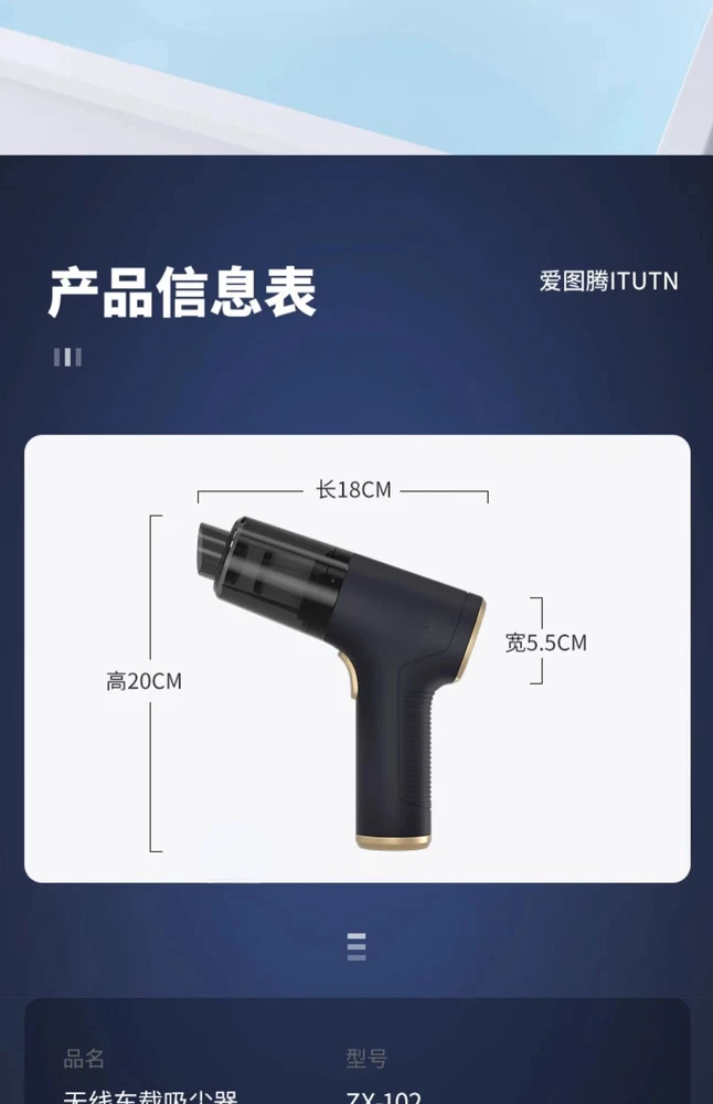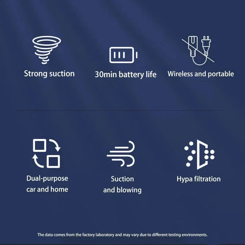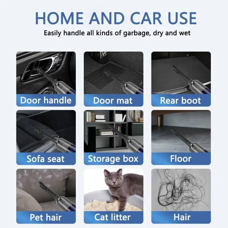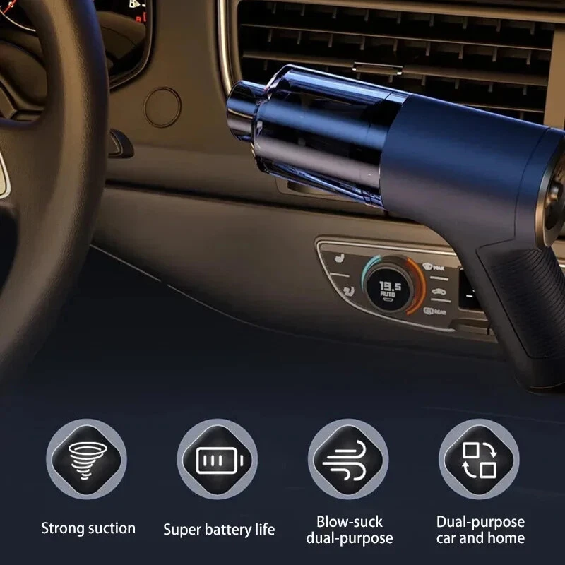 Car Vacuum Cleaner Powerful Cleaning Machine Strong Suction Handheld For Car Home Portable Wireless Cleaner New Features 1.Powerful Suction: Equipped with a high-powered motor to provide strong suction, effectively cleaning dust, debris, and pet hair. 2.Handheld and Portable: Compact and lightweight design for easy handling and portability, suitable for use both in cars and at home. 3.Wireless Operation: Operates cordlessly for hassle-free cleaning, powered by rechargeable batteries for convenience. 4.Versatile Attachments: Includes various attachments such as crevice tools and brushes to tackle different cleaning tasks in cars and around the home. 5.Easy Maintenance: Features a detachable and washable filter for simple maintenance, ensuring continued powerful suction and longevity.