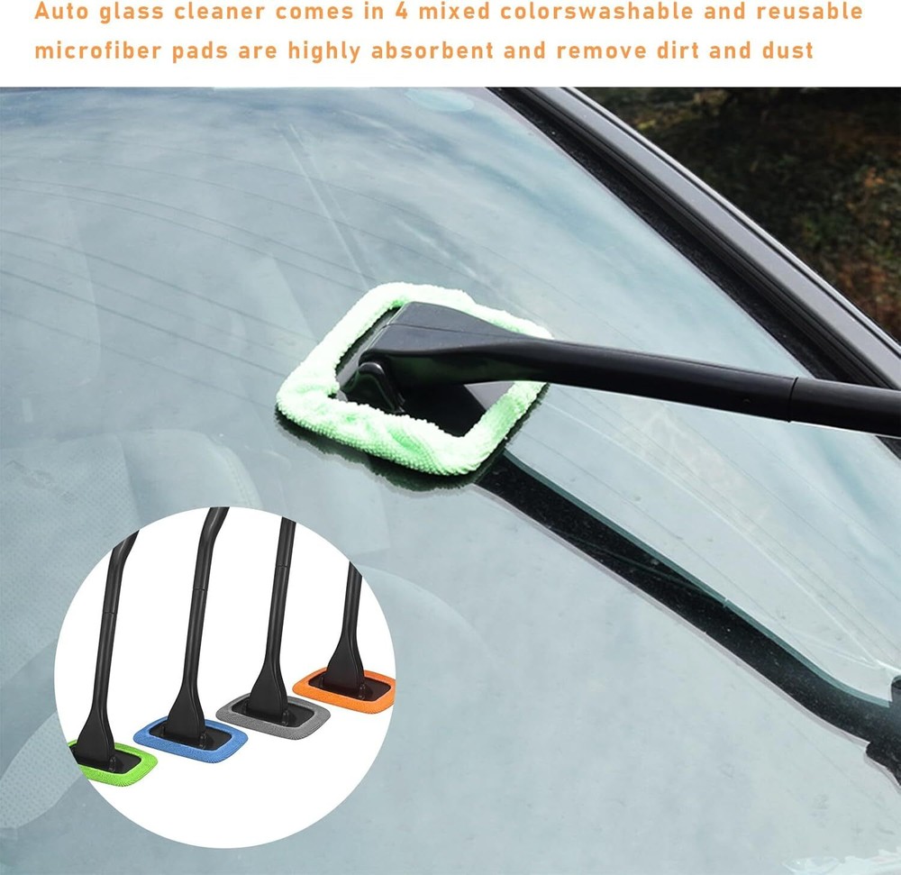 Car Windshield Cleaning Tool, Microfiber Window Cleaner with 4 Washable and Reusable Cloth Pad & Long Handle, Auto Glass Wiper Cleaning Kit with Spray Bottle, Car Accessories 【Package Includes】: This cleaning kit contains 1 handle, 1 spray bottle and 4 microfiber cloth covers. It is convenient to spray water with the spray bottle while cleaning. The 4 cloth covers come in different colors, green, gray, blue and orange, they are not only plentiful, but the bright and beautiful colors also make your cleaning work a little less boring. 【Microfiber Cloth Cover】: The soft microfiber cloth cover is absorbent and has strong cleaning ability. You can clean your car glass quickly and efficiently without even needing detergents or soapy water, and that too, without using too much force. In addition, it can be cleaned and used repeatedly without deformation. 【Long handle】: The handle of this cleaning tool is 18 inches long, and the elongated design allows you to clean farther and higher places, such as the car roof. In addition, the handle is ergonomically designed for a comfortable grip and is also non-slip, so you won't get your hands tired after a long period of use. 【Clever Design】: This cleaning brush has a removable handle that can be split in half when you're not using it, just by the snap and switch, making the storage more space-saving. In addition, its brush head rotates 180 degrees, so you can clean hard-to-reach corners easily and at multiple angles. 【Extensive Use】: The cleaning kit is suitable for defogging and dusting work on the interior and exterior of various vehicle glass, suitable for cars, suvs, vans and so on. In addition, it can also be used in home and office, you can clean windows, monitors, kitchen walls, bathroom mirrors and so on with it. Product Description Ohleats Car Windshield Cleaning Tool