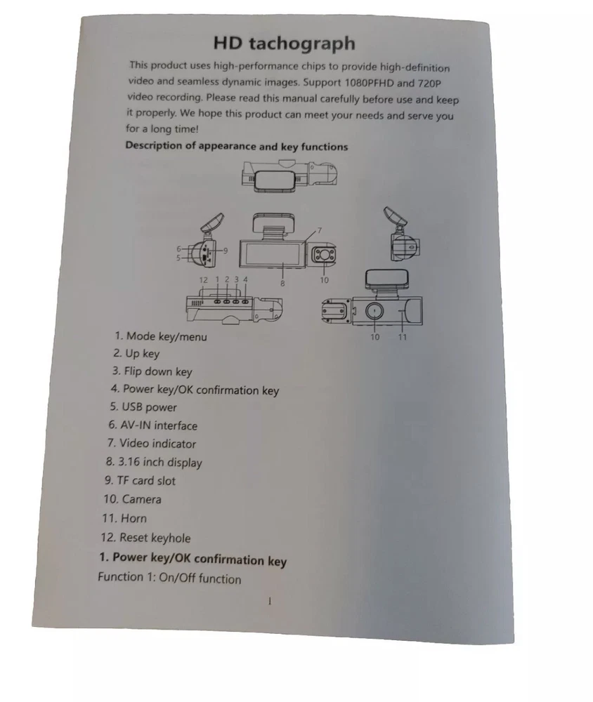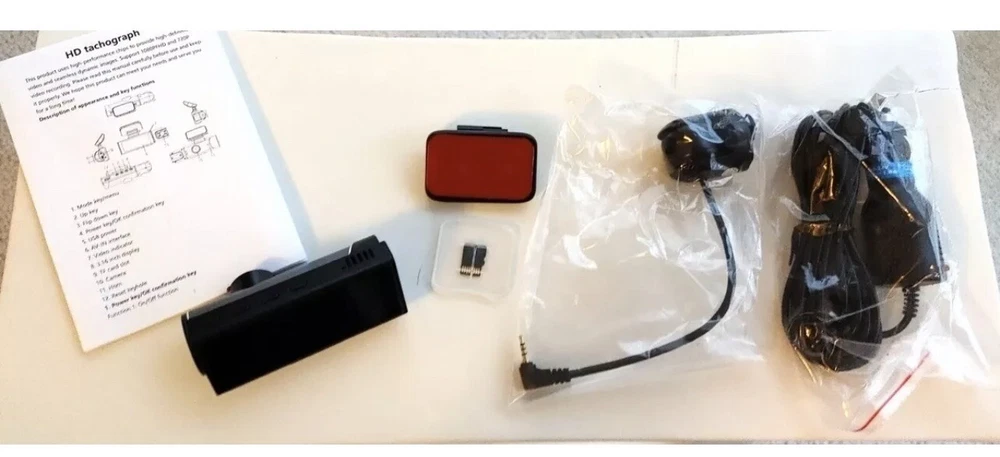 The CarDVR Video Camera M8 is a new open box product that comes with a 3.16 inch display and an SD card. It is a tachograph that records in Full HD and has one camera. The product is black in color. Brand NEW