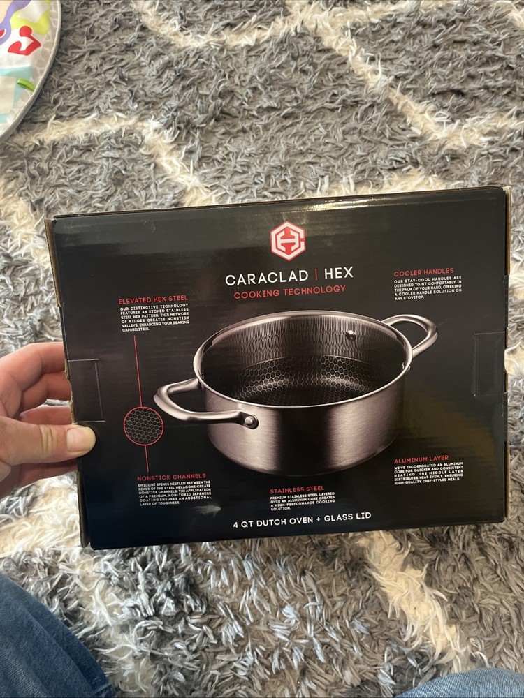 The Caraclad Hex 4Qt Dutch Oven with Glass Lid is a premium stainless steel stockpot featuring an aluminum core for even heating. It has a 4-quart capacity and a non-stick surface coating, making it perfect for various cooking surfaces including induction, electric, and gas. The Dutch oven comes with a lid and conveniently stays cool with insulated handles, making it easy to use and clean. Its round shape and silver color add a touch of elegance to any kitchen. Made with high-quality materials and a flat-bottomed design, this Dutch oven is a versatile and durable addition to any cookware collection.