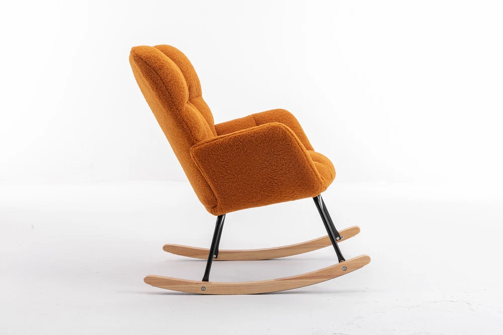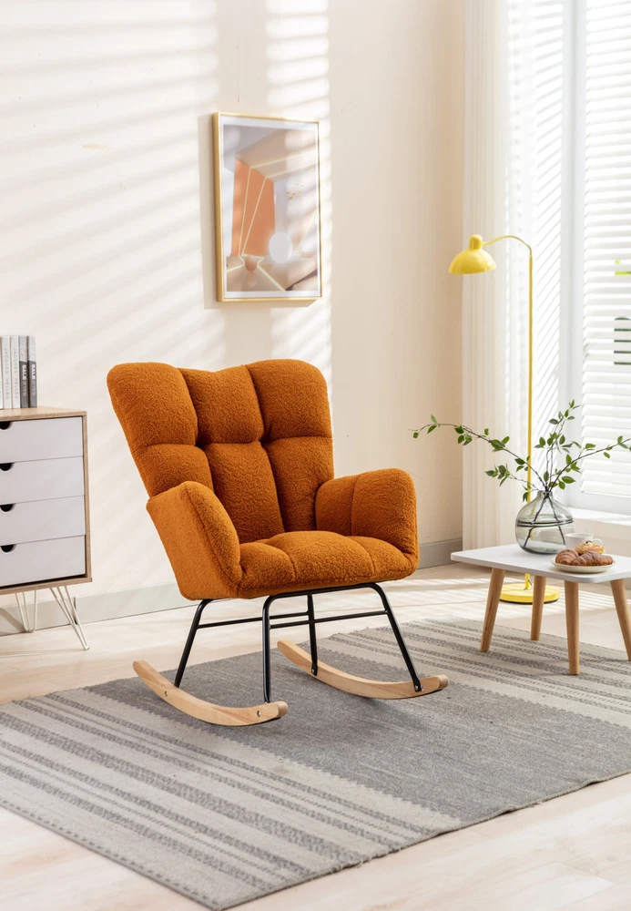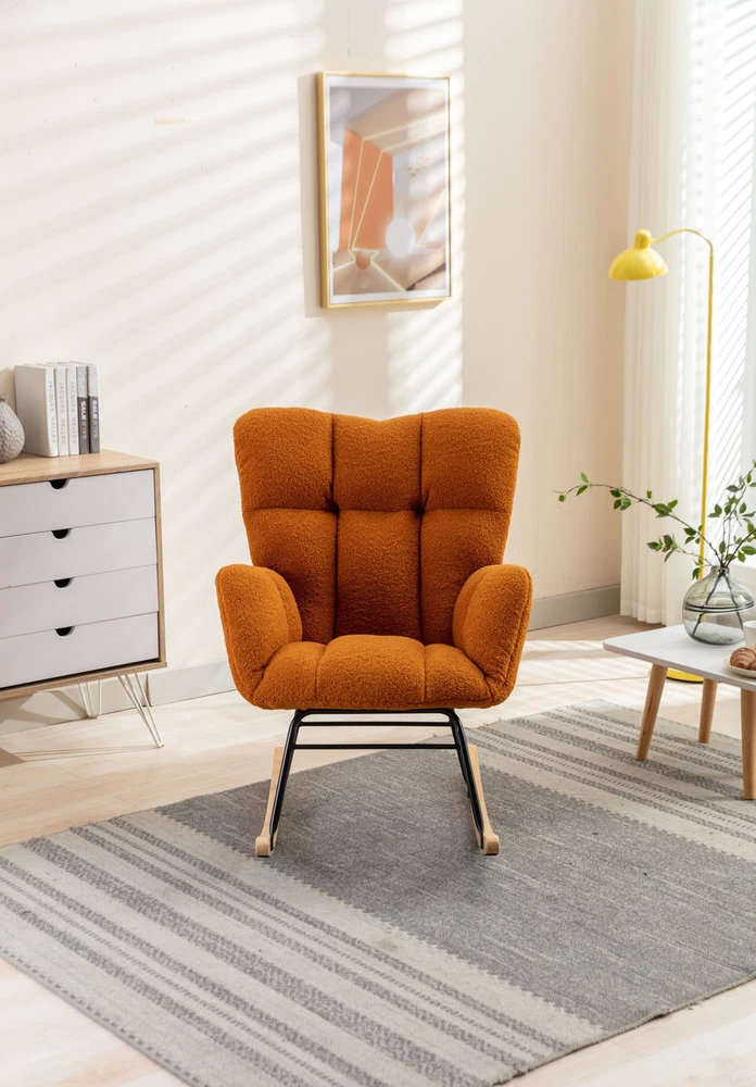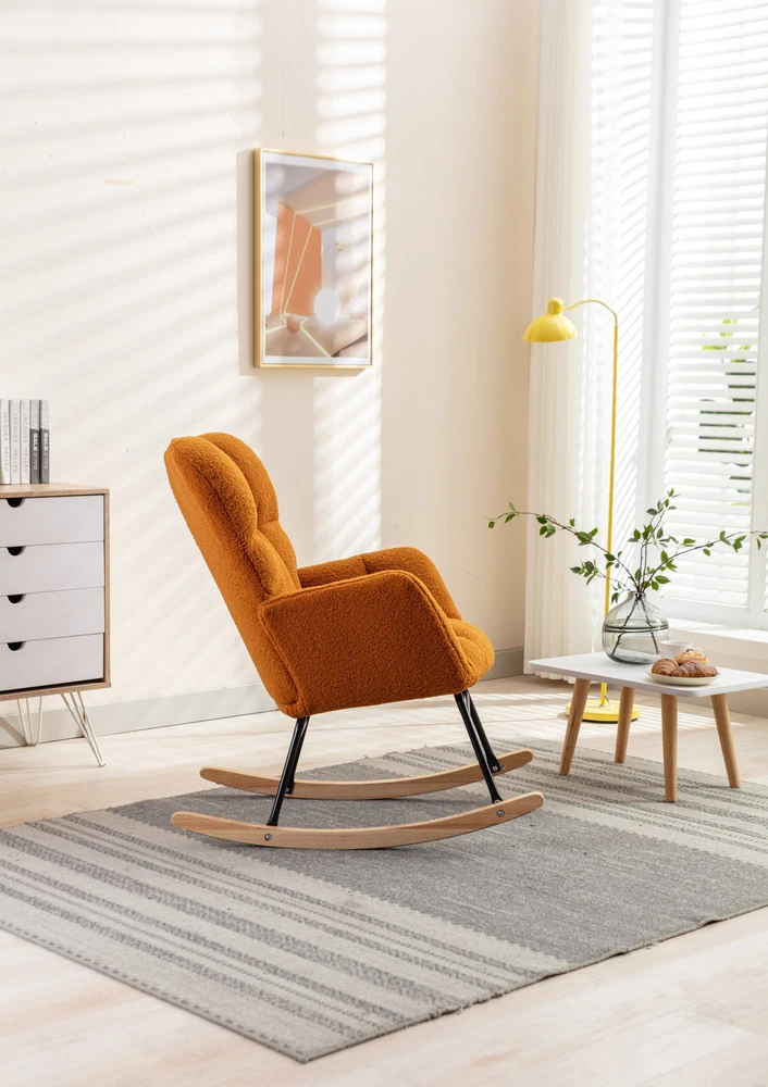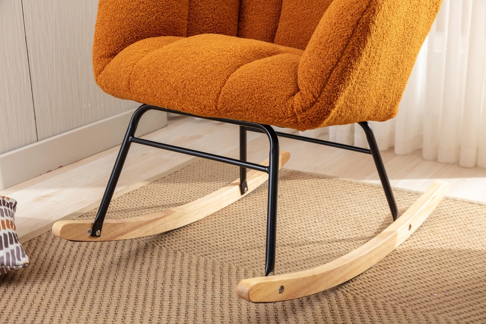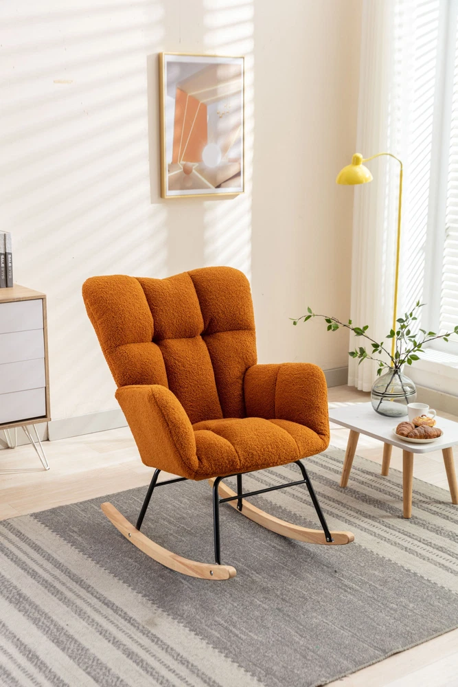 Specifications Place of Origin China Main Color Caramel Main Material Teddy Filler Foam Product Style Modern Use Case Bedroom Wood Type Eucalyptus Chair Type Rocking Chairs Pattern Solid Chair Back Style Tufted Back Chair Fill Material Cotton Chair Care Instructions Wipe Clean Dangerous Goods #dangerFlag# Dimensions & Weights Assembled Length (in.) 31.50 Assembled Width (in.) 27.60 Assembled Height (in.) 37.40 Weight (lbs) 26.46 Product Features Product Dimensions:31.5'D×27.6'W×37.4'H,Weight:26.46 LBS; Package Size&Package Weight:28.74'×27.17'×10.24',Weight:29 LBS; Product BOM:Soft Teddy Material+Foam Filling+Wooden Frame+Black Paint Metal Base+Wooden Rocking Legs+Upholstered+Floor Protection And Isolation Layer; Product Feature:Rocking; Use Case:Indoor,Accent Chair,Nursery Chair,Rocking Chair,Glider Chair,For Living Room,Bedroom and Other indoor space; Product Capacity:250 LBS Product Assembly:The assembly is so simple that two person can assemble it in 25 minutes; Product Care:Wipe with a damp rag. Description