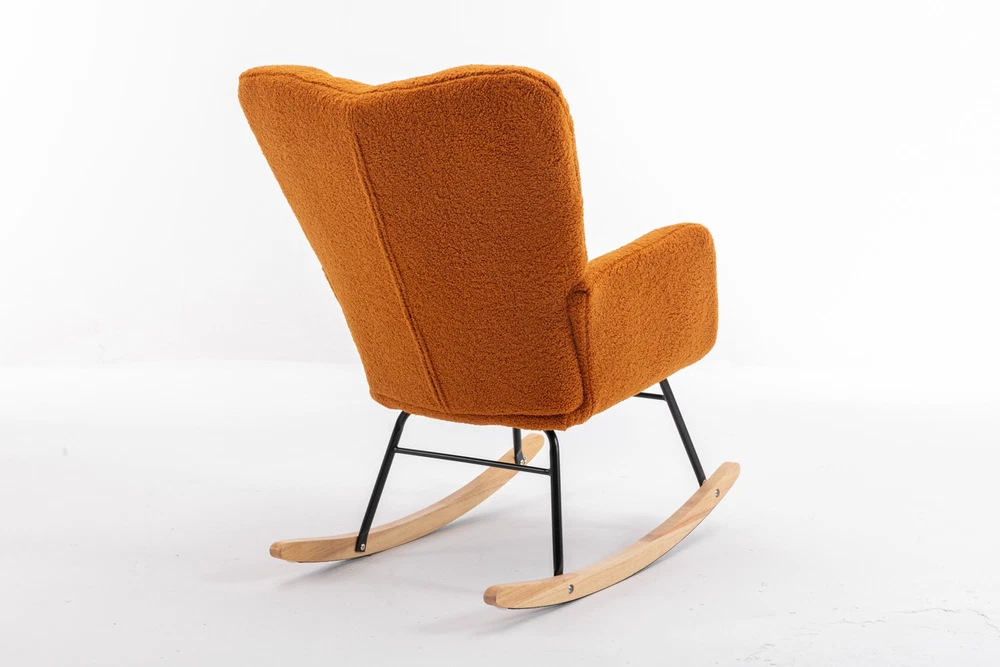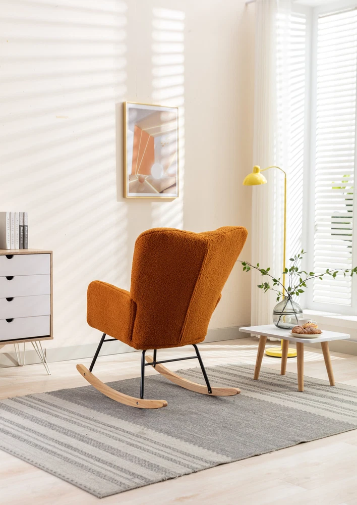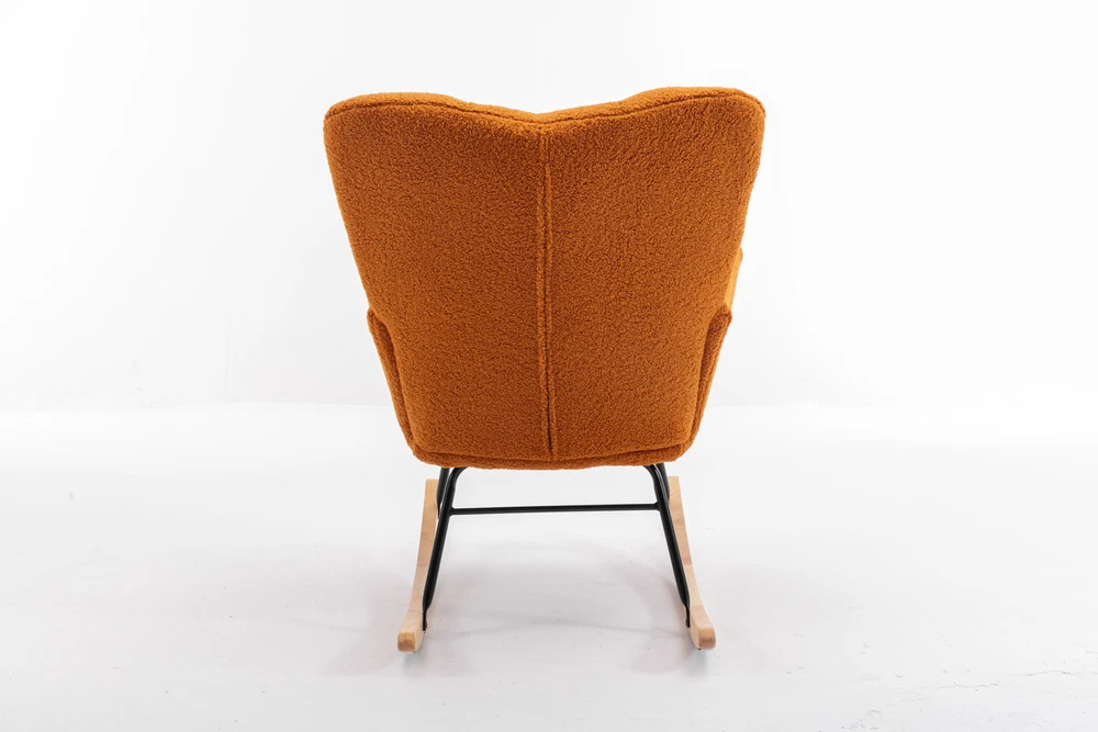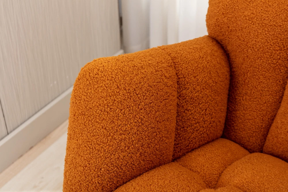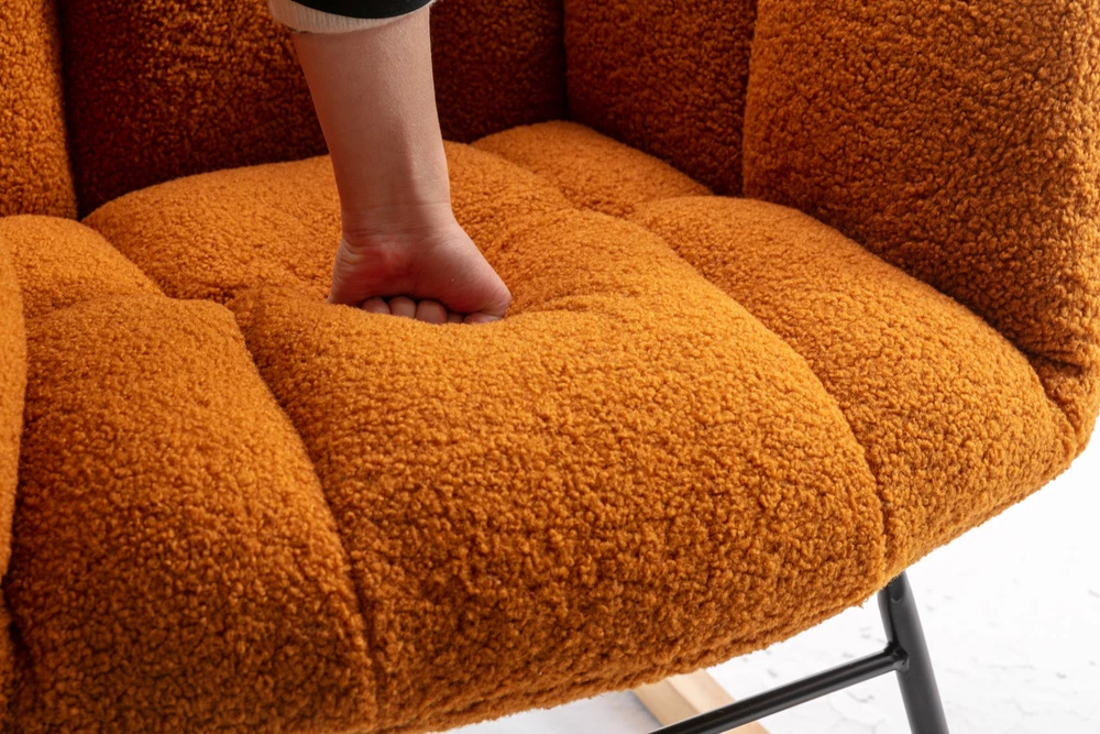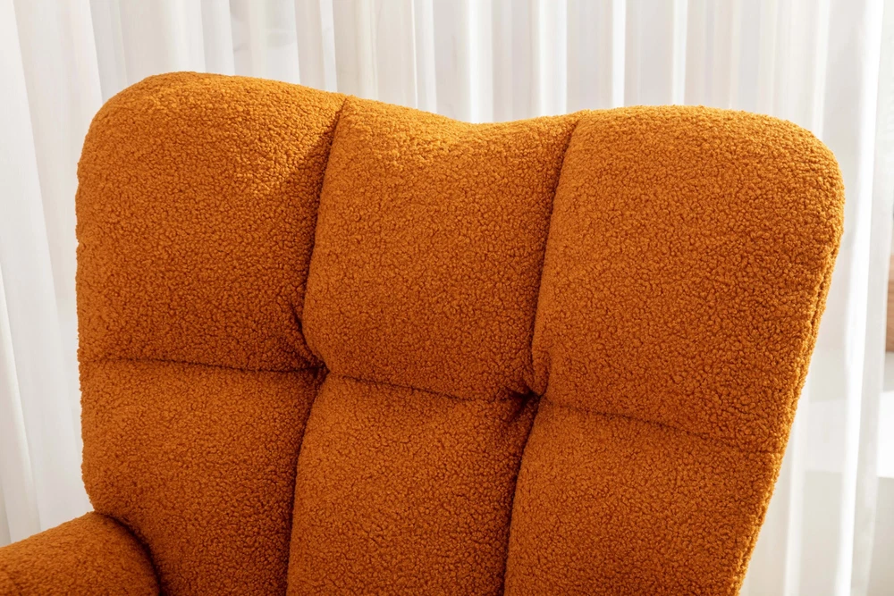 Specifications Place of Origin China Main Color Caramel Main Material Teddy Filler Foam Product Style Modern Use Case Bedroom Wood Type Eucalyptus Chair Type Rocking Chairs Pattern Solid Chair Back Style Tufted Back Chair Fill Material Cotton Chair Care Instructions Wipe Clean Dangerous Goods #dangerFlag# Dimensions & Weights Assembled Length (in.) 31.50 Assembled Width (in.) 27.60 Assembled Height (in.) 37.40 Weight (lbs) 26.46 Product Features Product Dimensions:31.5'D×27.6'W×37.4'H,Weight:26.46 LBS; Package Size&Package Weight:28.74'×27.17'×10.24',Weight:29 LBS; Product BOM:Soft Teddy Material+Foam Filling+Wooden Frame+Black Paint Metal Base+Wooden Rocking Legs+Upholstered+Floor Protection And Isolation Layer; Product Feature:Rocking; Use Case:Indoor,Accent Chair,Nursery Chair,Rocking Chair,Glider Chair,For Living Room,Bedroom and Other indoor space; Product Capacity:250 LBS Product Assembly:The assembly is so simple that two person can assemble it in 25 minutes; Product Care:Wipe with a damp rag. Description