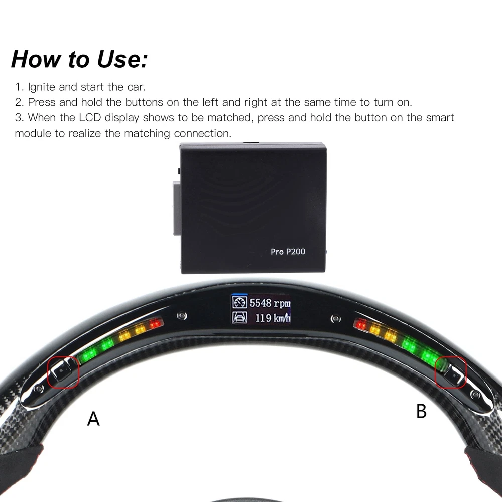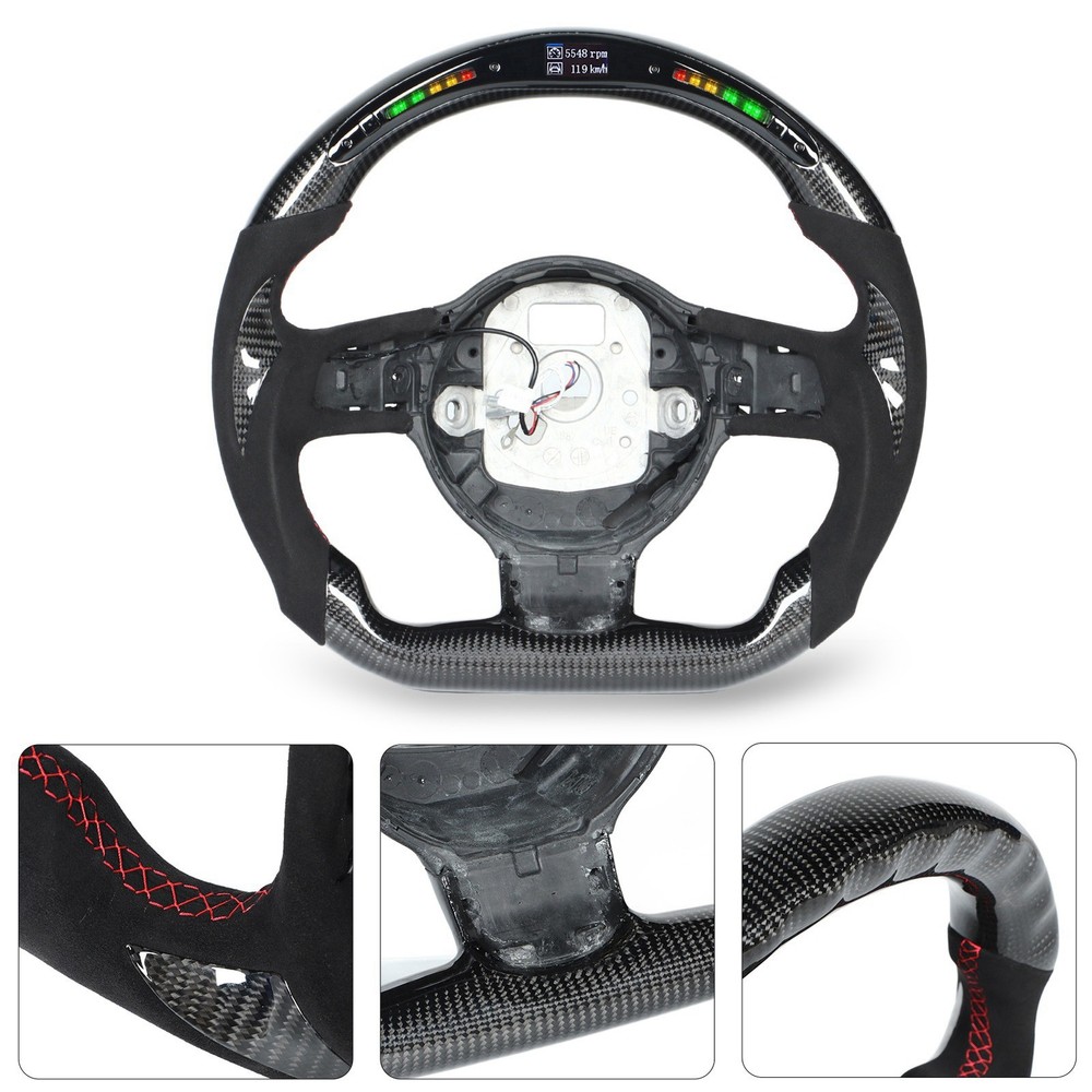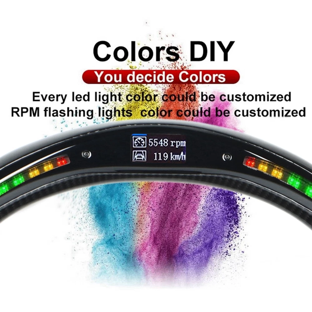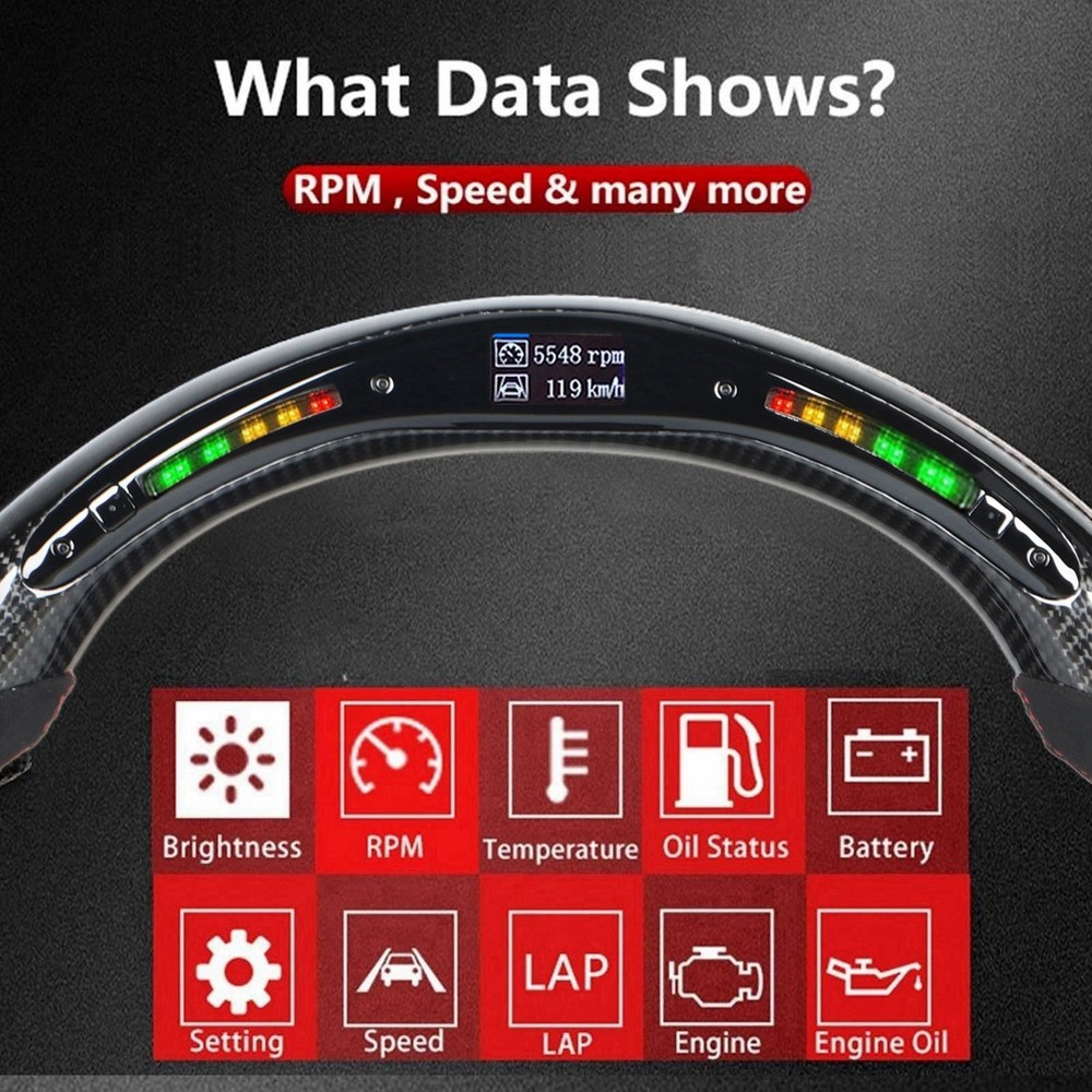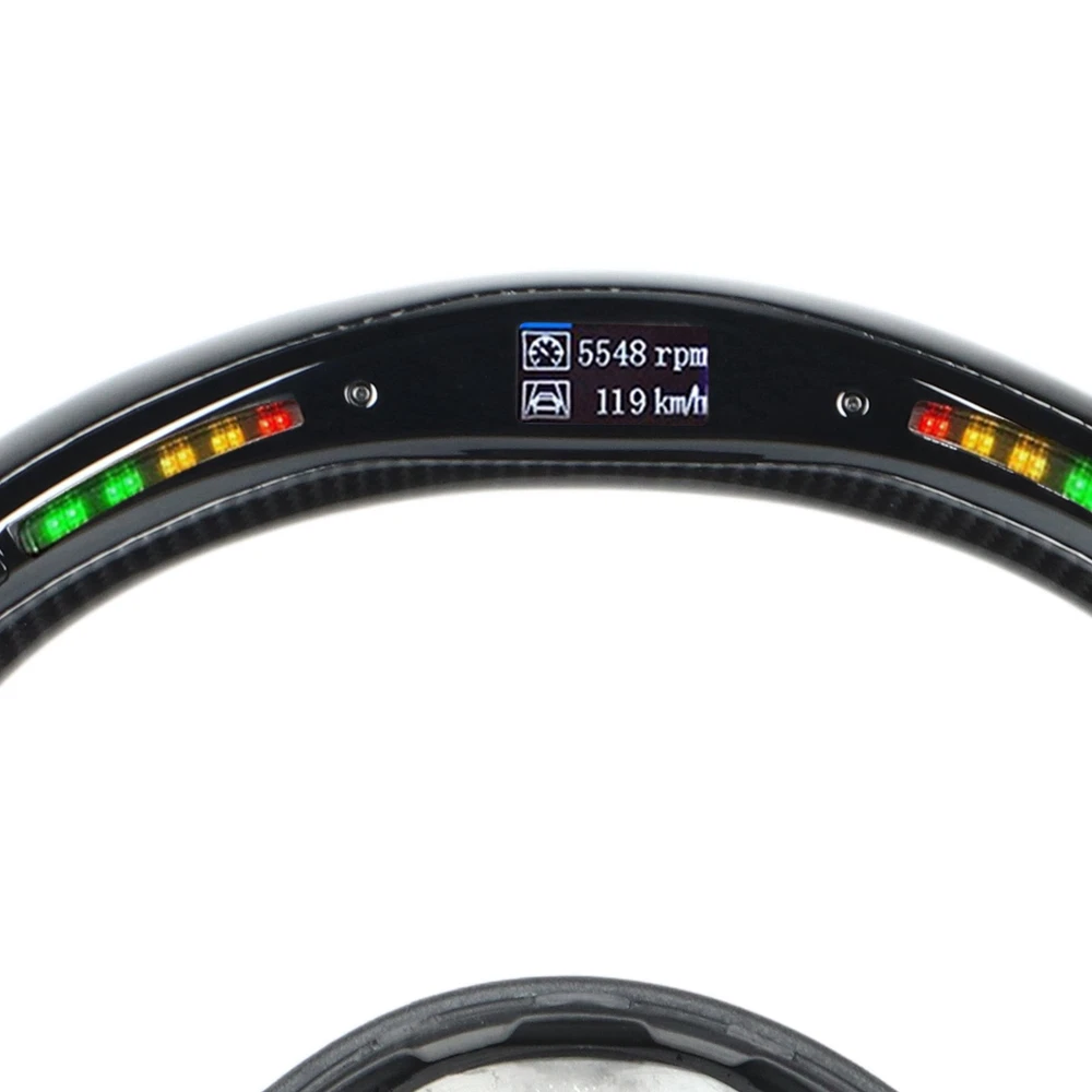 Feature: 1. LED Shift Light: LED shift indicator gradually turns green with the increase of engine speed. Once the user configured RPM is reached, the indicator will flash red as an upshift reminder. 2. Adjustable RPM and Color: LED shift indicator, adjustable from 500 RPM to 9900 RPM, supports RGB color adjustment. It also has shift indicator 0‑60 mph quarter mile and lap time lateral and longitudinal acceleration values, and displays efficient dynamics data. 3. Multi Fnction: LED performance steering wheel, you can read real time data from the display embedded in the steering wheel, such as Speed, RMP, LAP, engine load, water temperature, voltage and etc. 4. Real Carbon Fiber: 3K glossy carbon fiber, coated with 1mm thick epoxy resin coating, has strong anti oxidation protection, high heat resistance, symmetrical and uniform carbon fiber structure, and no twisted structure. 5. Excellent Grip: The flat bottom design also increases leg space for drivers, providing excellent grip at any temperature, even in extreme driving situations. Specification: Item Type: Car Steering Wheel Material: Glossy Carbon Fiber + Suede LED Shift Indicator Race Display: 20 LEDs Light Steering Wheel Stitching: Red Steering Wheel Hand Grips: Suede With Black Carbon Trims Steering Wheel Shape Bottom: Flat bottom D type Racing Design Finger : YES Paddle Shifter Holes: Yes Technical Parameter: Working Voltage: 12V-16V Working Frequency: 2.4GHz Working Current: Motherboard <40mA, Display <25mA Quiescent Current: 3mA Sensing Distance: Approx. 10m/10.9yd Applicable Temperature: -40℃-+85℃ Main Functions (LCD Display) 1. Fuel consumption breakdown 2. Steering wheel angle perception 3. Dynamic steering transmission 4. Time record 5. Dynamic speed sensing 6. Racing mileage record 7. Engine information presentation 8. Specific information setting 9. Estimated mileage 10. Turbo display Fitment: Replacement for 42 2007-2015 Replacement for TTS 2006-2014 Package List: 1 x LED Steering Wheel 1 x OBD2 Smart Module 1 x OBD2 Wiring Harness 1 x Manual Note: 1. It is strongly recommended to install and upgrade by a professional mechanic. 2. If you have any questions during the installation process, please consult our customer service in time, and we will handle all problems for you. 3. Support to customize the steering wheel of any style, color, material, and any model, please contact customer service.