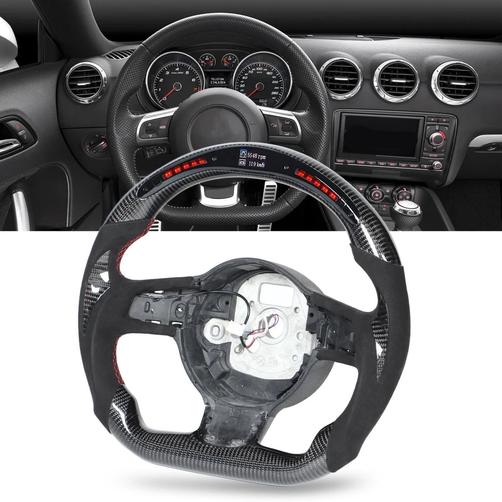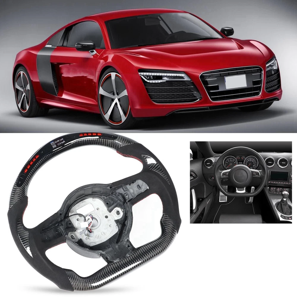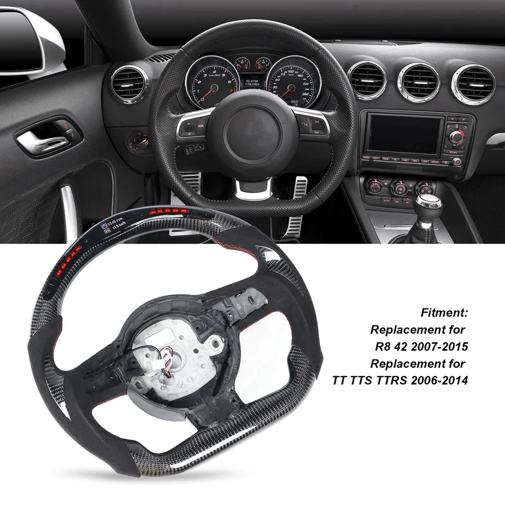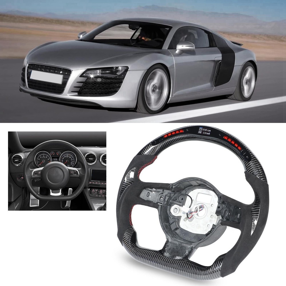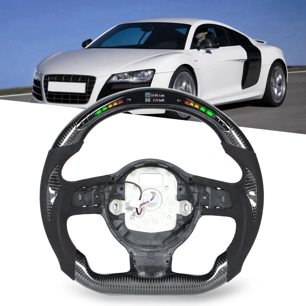 Feature: 1. LED Shift Light: LED shift indicator gradually turns green with the increase of engine speed. Once the user configured RPM is reached, the indicator will flash red as an upshift reminder. 2. Adjustable RPM and Color: LED shift indicator, adjustable from 500 RPM to 9900 RPM, supports RGB color adjustment. It also has shift indicator 0‑60 mph quarter mile and lap time lateral and longitudinal acceleration values, and displays efficient dynamics data. 3. Multi Fnction: LED performance steering wheel, you can read real time data from the display embedded in the steering wheel, such as Speed, RMP, LAP, engine load, water temperature, voltage and etc. 4. Real Carbon Fiber: 3K glossy carbon fiber, coated with 1mm thick epoxy resin coating, has strong anti oxidation protection, high heat resistance, symmetrical and uniform carbon fiber structure, and no twisted structure. 5. Excellent Grip: The flat bottom design also increases leg space for drivers, providing excellent grip at any temperature, even in extreme driving situations. Specification: Item Type: Car Steering Wheel Material: Glossy Carbon Fiber + Suede LED Shift Indicator Race Display: 20 LEDs Light Steering Wheel Stitching: Red Steering Wheel Hand Grips: Suede With Black Carbon Trims Steering Wheel Shape Bottom: Flat bottom D type Racing Design Finger : YES Paddle Shifter Holes: Yes Technical Parameter: Working Voltage: 12V-16V Working Frequency: 2.4GHz Working Current: Motherboard <40mA, Display <25mA Quiescent Current: 3mA Sensing Distance: Approx. 10m/10.9yd Applicable Temperature: -40℃-+85℃ Main Functions (LCD Display) 1. Fuel consumption breakdown 2. Steering wheel angle perception 3. Dynamic steering transmission 4. Time record 5. Dynamic speed sensing 6. Racing mileage record 7. Engine information presentation 8. Specific information setting 9. Estimated mileage 10. Turbo display Fitment: Replacement for 42 2007-2015 Replacement for TTS 2006-2014 Package List: 1 x LED Steering Wheel 1 x OBD2 Smart Module 1 x OBD2 Wiring Harness 1 x Manual Note: 1. It is strongly recommended to install and upgrade by a professional mechanic. 2. If you have any questions during the installation process, please consult our customer service in time, and we will handle all problems for you. 3. Support to customize the steering wheel of any style, color, material, and any model, please contact customer service.