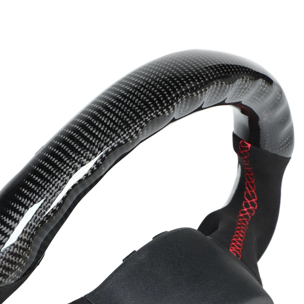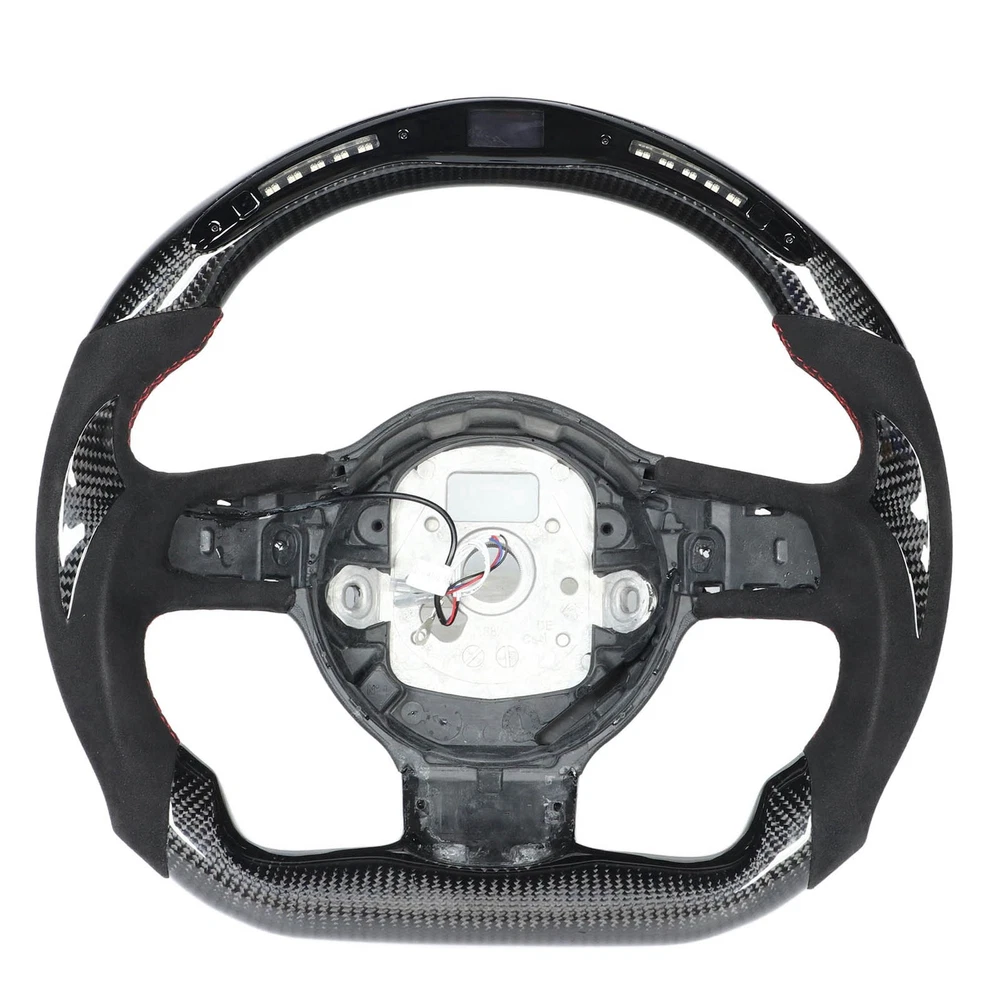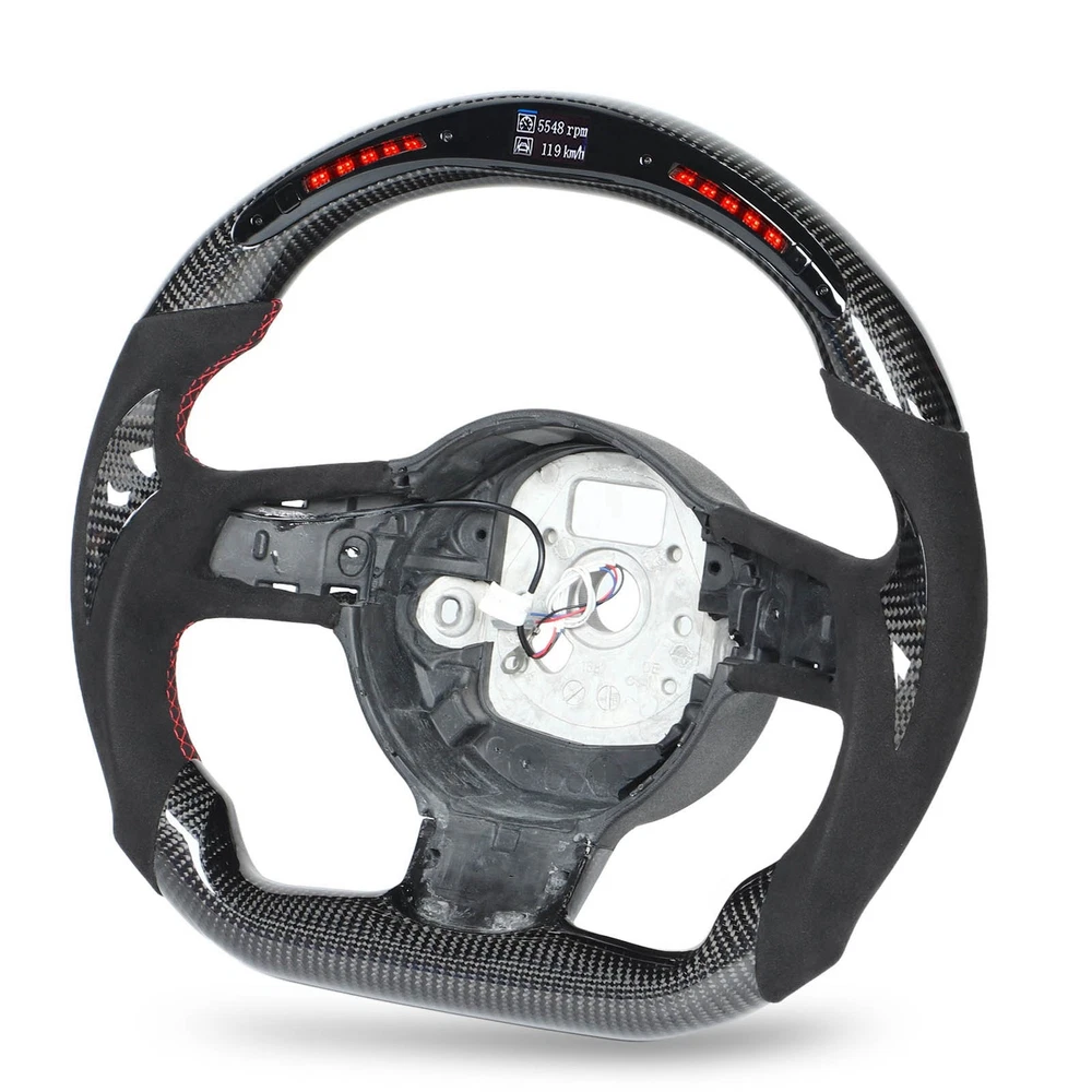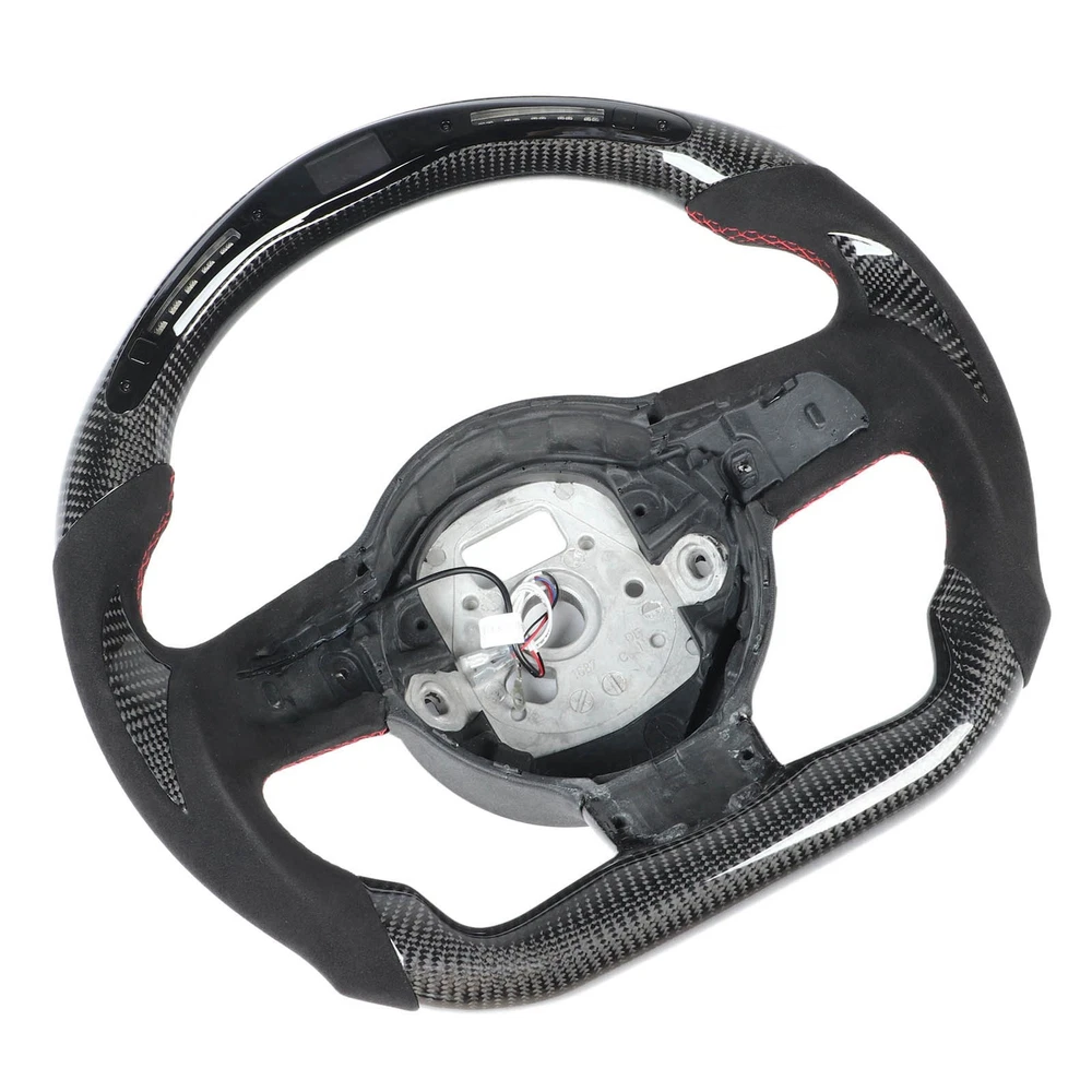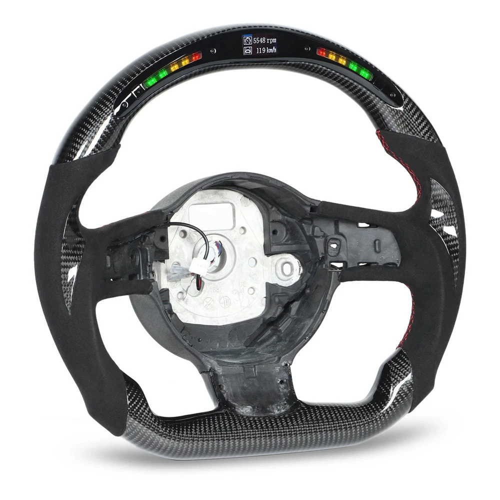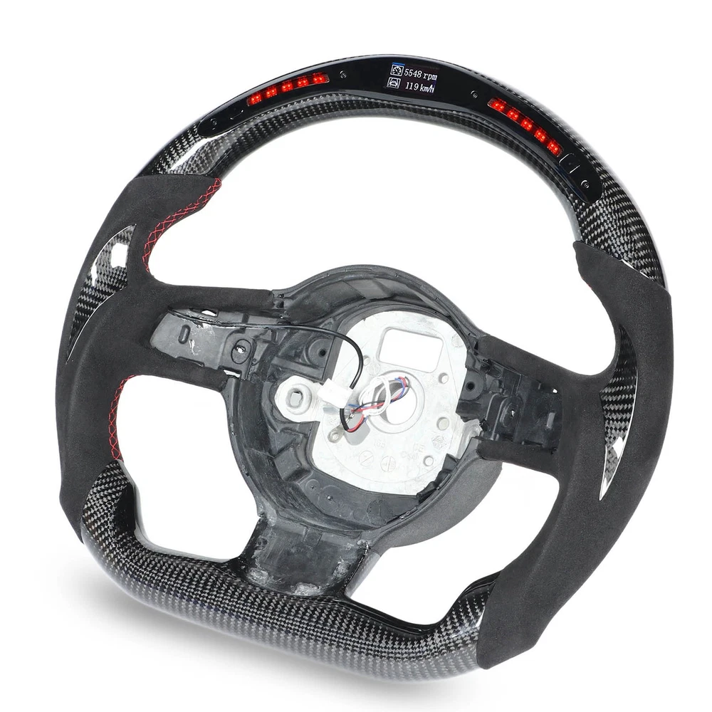 Feature: 1. LED Shift Light: LED shift indicator gradually turns green with the increase of engine speed. Once the user configured RPM is reached, the indicator will flash red as an upshift reminder. 2. Adjustable RPM and Color: LED shift indicator, adjustable from 500 RPM to 9900 RPM, supports RGB color adjustment. It also has shift indicator 0‑60 mph quarter mile and lap time lateral and longitudinal acceleration values, and displays efficient dynamics data. 3. Multi Fnction: LED performance steering wheel, you can read real time data from the display embedded in the steering wheel, such as Speed, RMP, LAP, engine load, water temperature, voltage and etc. 4. Real Carbon Fiber: 3K glossy carbon fiber, coated with 1mm thick epoxy resin coating, has strong anti oxidation protection, high heat resistance, symmetrical and uniform carbon fiber structure, and no twisted structure. 5. Excellent Grip: The flat bottom design also increases leg space for drivers, providing excellent grip at any temperature, even in extreme driving situations. Specification: Item Type: Car Steering Wheel Material: Glossy Carbon Fiber + Suede LED Shift Indicator Race Display: 20 LEDs Light Steering Wheel Stitching: Red Steering Wheel Hand Grips: Suede With Black Carbon Trims Steering Wheel Shape Bottom: Flat bottom D type Racing Design Finger : YES Paddle Shifter Holes: Yes Technical Parameter: Working Voltage: 12V-16V Working Frequency: 2.4GHz Working Current: Motherboard <40mA, Display <25mA Quiescent Current: 3mA Sensing Distance: Approx. 10m/10.9yd Applicable Temperature: -40℃-+85℃ Main Functions (LCD Display) 1. Fuel consumption breakdown 2. Steering wheel angle perception 3. Dynamic steering transmission 4. Time record 5. Dynamic speed sensing 6. Racing mileage record 7. Engine information presentation 8. Specific information setting 9. Estimated mileage 10. Turbo display Fitment: Replacement for 42 2007-2015 Replacement for TTS 2006-2014 Package List: 1 x LED Steering Wheel 1 x OBD2 Smart Module 1 x OBD2 Wiring Harness 1 x Manual Note: 1. It is strongly recommended to install and upgrade by a professional mechanic. 2. If you have any questions during the installation process, please consult our customer service in time, and we will handle all problems for you. 3. Support to customize the steering wheel of any style, color, material, and any model, please contact customer service.