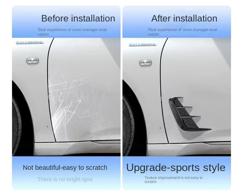 Product Description Carbon Fiber Look Car Leaf Panel Decoration Stickers Sport Style Side Wing Fender Sticker Cover Car Exterior Accessories Add our listing to Watchlist Or Add to Cart , you will get more discount Item Description • This listing is for one pair of Car Side Fender Vent Trim Cover Sticker. • Made with high quality TPU. • Come with self-adhesive tape for easy installation, no drilling required. • Universal fit for 99% of market models Technical Parameter • Conditions: New • Quantity: 1 Set(left & right) • Color: Carbon Fiber Look • Material: TPU • Size: as picture show Feature: Beautiful and enhances sporty style Payment Returns Contact Us Shipping We accept payment by PayPal only ! Payment should be completed within 5 days after buyer places the order,or else an unpaid case will be opened in order to cancel the transaction. If you can not pay in time, please contact us. e-check from PayPal will only be processed once the payment clears. All of the items will be shipped to buyer's EBAY address,please confirm your address on Ebay before you buy.Your order will be usually shipped out the same or next business days once the payment is made and cleared. 30-day Warranty with Exchange for defective, malfunctioned, incorrect or parts-missing items. Please notify us and return the item with all parts and accessories packed and marked "FOR EXCHANGE" within 14 days of receipt. If defective, malfunctioned or parts-missing items are no longer available, a refund may be issued. All returning postage costs will be the responsibility of the buyers under all circumstances. If you encounter any problems about anything, please feel free to contact us and we will do our best to assist you solve the issue. If you are not satisfied in anyway, please feel free to let us know and give us a second chance to correct it before you decide to leave any neutral or negative feedback. Please contact us through eBay link if you have any questions. We will reply you within 24- 48 hours. Please check you spam mail if no response for 48 hours. All items will be checked before packing. All items are new and of high quality. Item will be shipped within 1 business days upon receipt of payment, excluding weekends and public holidays. If to USA,we will ship your order by USPS,it will take about 8-12 working days to you,and you can track it on line. If to other country,we will ship your order by China Post or Singapore Registered Air Mail,it will take about 14-21 working days to you,you aslo can track it on line. Delivery time is about 14-28 business days and it may take up to 8 weeks . Payment We accept payment by PayPal only ! Payment should be completed within 7 days after buyer places the order,or else an unpaid case will be opened in order to cancel the transaction. If you can not pay in time, please contact us. eCHECK from PayPal will only be processed once the payment clears. All of the items will be shipped to buyer's EBAY address,please confirm your address on Ebay before you buy.Your order will be usually shipped out the same or next business days once the payment is made and cleared. Returns 30-day Warranty with Exchange for defective, malfunctioned, incorrect or parts-missing items. Please notify us and return the item with all parts and accessories packed and marked "FOR EXCHANGE" within 14 days of receipt. If defective, malfunctioned or parts-missing items are no longer available, a refund may be issued. All returning postage costs will be the responsibility of the buyers under all circumstances. Contact Us If you encounter any problems about anything, please feel free to contact us and we will do our best to assist you solve the issue. If you are not satisfied in anyway, please feel free to let us know and give us a second chance to correct it before you decide to leave any neutral or negative feedback. Please contact us through eBay link if you have any questions. We will reply you within 24- 48 hours. Please check you spam mail if no response for 48 hours. Shipping All items will be checked before packing. All items are new and of high quality. Item will be shipped within 1 business days upon receipt of payment, excluding weekends and public holidays. If to USA,we will ship your order by USPS,it will take about 7-10 working days to you,and you can track it on line. If to other country,we will ship your order by China Post or Singapore Registered Air Mail,it will take about 14-21 working days to you,you aslo can track it on line. Delivery time is about 14-28 business days and it may take up to 8 weeks . Welcome to our Store ~