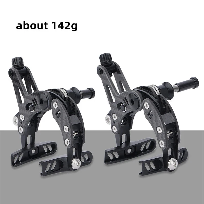Weight: about 142g/pair Colour: Black Material: carbon fiber + aluminum alloy Carbon fiber + aluminum alloy material, high tensile strength, CNC hollow splint, 1 pair of ultra-light 142g. High tension spring, sensitive rebound, strong braking force and quick braking. Micro-engraved screws ,to adjust the tension of the brake cable.