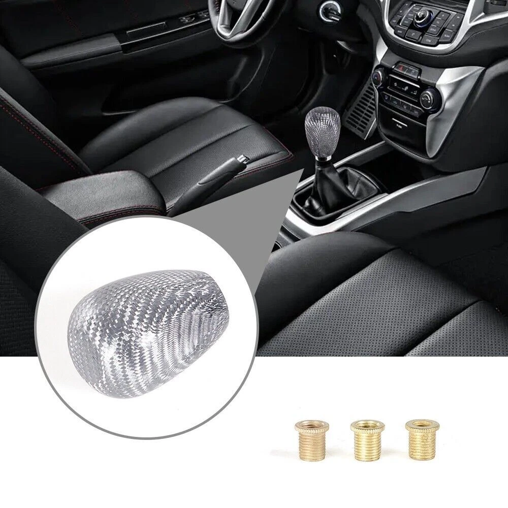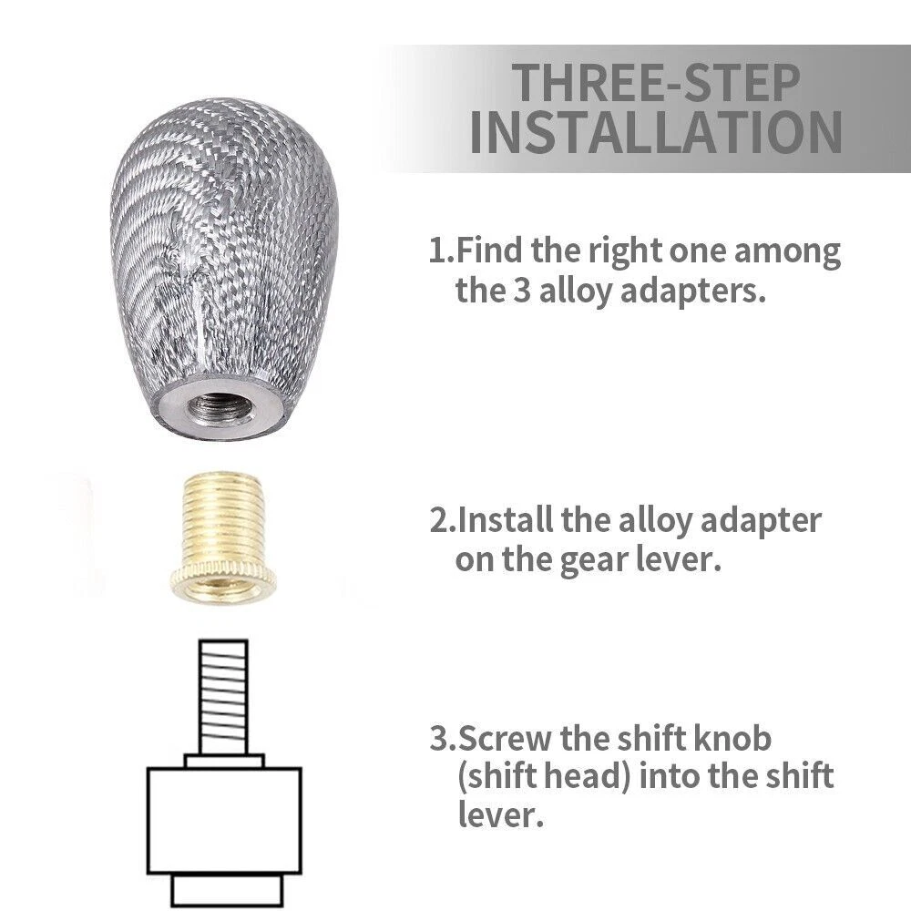 Product description: Carbon Universal Car Shift Knob Features: Material: carbon Color:Silver ( We also have Red/Black ) Fitment: fit for most of M8, M10, M12 Installation: 1. Take out the gear knob 2. Select the proper size of the adapter, and insert into gear shift rod 3. Make shift knob insert into the a dapter, the installation is complete Package including: 1* shift knob 3* adapter Please Note: 1. Universal shift knob, but some cars can not fit. These 2 kinds of gear knobs can not fit: - 1.1 Manual: need to lift up to get into reverse gear (namely, reverse gear R in the upper left corner) - 1.2 Automatic: reverse gear has a button 2. Please make sure the item is a suitable replacement for your car. 3.Please allow 1-3mm differs due to manual measurement Shipping Information We will only ship this item to buyers by Normal Mail, please confirm your address is correct, and if you want to change the delivery address, just feel free to contact us when you purchase. Usually, we will ship the orders out and upload the tracking number within 1-2 business days(Monday to Saturday from 8:30am-5:30pm) after you complete the payment. NOTE: If there is any custom duties, local Taxes or any other important fees, buyer will bear these costs. Each country has different customs tax threshold, so you need know your country's tax policy. Payment Information We only accept eBay Payment and other payments through eBay Credit Cards processed by eBay. Return Policy 100% Satisfaction Guarantee, Please contact us with any concerns. We offer not less than 30 days for return and refund policies. If you receive the items that have any quality problems or damaged, please feel free to let us know and provide the photos, we will resend it or refund you. But we will not accept the return if the item damaged by the buyer’s operational errors.Return shipping cost is to be paid by the Buyer. Contact Us For any reason you want to contact us,We aim at satisfying every visitor, no matter what kind of situation you meet with, we will be right here to serve you. Please contact our team. If you are happy with the transaction with us, leaving us an ALL-5-STAR positive feedback would be greatly appreciated. Have a good shopping. SHIPPING INFORMATION PAYMENT WARRANTY ABOUT US CONTACT US SHIPPING INFORMATION We will only ship this item to buyers by Normal Mail, please confirm your address is correct, and if you want to change the delivery address, just feel free to contact us when you purchase. Usually, we will ship the orders out and upload the tracking number within 1-2 business days(Monday to Saturday from 8:30am-5:30pm) after you complete the payment. PAYMENT We will only accept eBay payment. Please pay using eBay payment ONLY within 7 days from the date of transaction be made. WARRANTY Please inspect your order upon receipt.No damage claims will be honored after 14 days of delivery. All item we sold come with 90 days defective warranty from the date. ABOUT US We are a powerful factory producing auto parts,and we have a professional sales and after-sales team that can provide you with excellent products and services. CONTACT US For any reason you want to contact us,We aim at satisfying every visitor, no matter what kind of situation you meet with, we will be right here to serve you. Please contact our team. If you are happy with the transaction with us, leaving us an ALL-5-STAR positive feedback would be greatly appreciated. Have a good shopping.