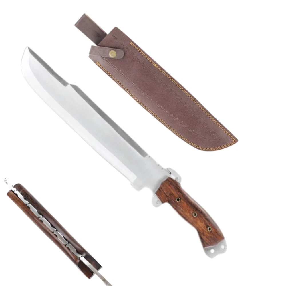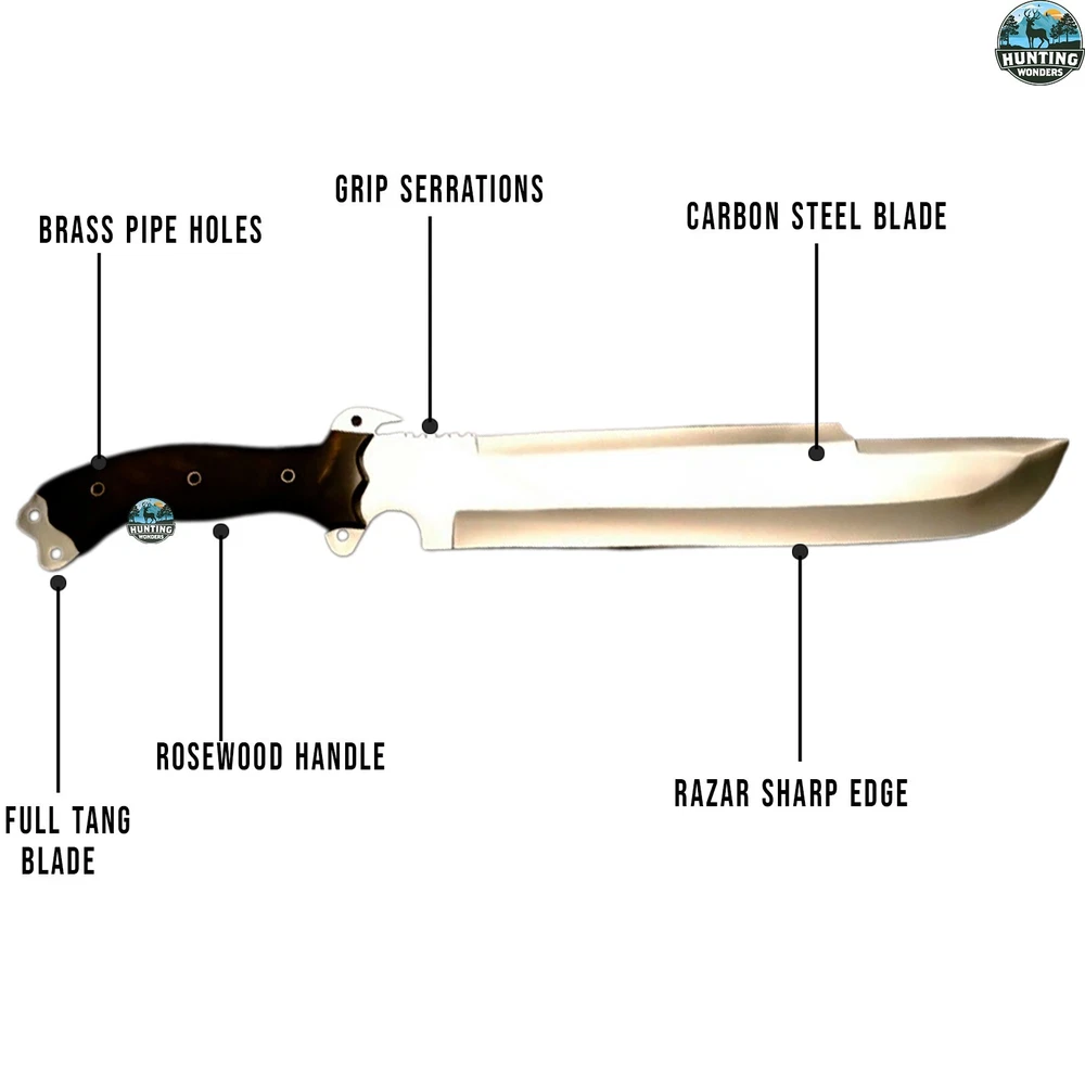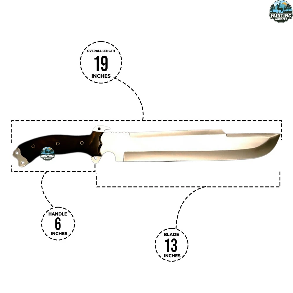 ✔️Meet the Predator Machete Knife – a true powerhouse that can tackle even the toughest cutting tasks with ease. With its full tang knife construction and razor-sharp blade, this machete will make quick work of anything in its path, whether it’s thick branches, dense foliage, or tough meat. No matter what challenges you face in the great outdoors, the Predator Machete Full Tang Knife is the ultimate tool to have by your side. ✔️HANDLE: The Stunning Rose Wood handle of this Predator knife aka Monster not only adds a flare in its look but also makes its grip comfortable even in wet conditions. ✔️AN IDEAL CHOICE: This tactical machete with sheath is the ideal choice for anyone looking for a reliable and versatile cutting tool, fixed blade knife with sheath or camping knife with sheath. ✔️A SPECIAL GIFT: This Carbon steel Predator full tang knife with sheath is a kind of special gift for husband from wife, nice as dad gifts, anniversary or birthday, whether or not they are into knives. ✔️Dimensions of this bush craft knife: overall length of predator knife: 19 Inches, Blade length fixed blade knife with sheath full tang knife handmade knife full tang knife with sheath: 13 Inches, Handle size fixed blade knife full tang: 6 inches. Dimensions: Overall Length: 19 Inches Blade Length: 13 Inches Handle Length: 6 Inches