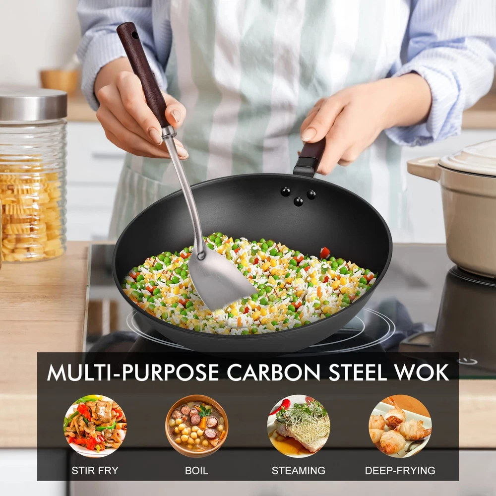 [All-In-Wok Set] The carbon steel wok set has a wok pan with lid, wok spatula & brush. Perfect size - 12.9" wide & 3.7 inches deep, can serve at least 3-5 people of food portions, simply the perfect choice for family gatherings. Stir frying wok can meet your various cooking needs, like pan-frying, stir-frying, deep-frying, braising, and steaming etc [Pre-seasoned Wok Pan] Our wok pan is pre-seasoned at 600F Celsius using modern unique nitriding technology, which develops enduring and natural non-stick coating properties. This wok pan is non-rusting, corrosion resistant, easy to clean and can helps you cook original food with less oil [Premium & Enduring Carbon Steel] The wok pan with lid is made of heavy-duty black carbon steel material, upgraded production process, so it superior performance and durability for using. The wok lightweight and responds to heat changes quickly evenly, saves cooking time which makes your cooking more efficient [Thoughtful Detail Design] The flat bottom wok are selected with high-lids that fit perfectly match the pan, detachable solid handle, not hot and easy to ,also easy to use in the oven. Flat bottom design wok pan, suitable for any stoves, such as induction, gas stoves, stoves, and other heat sources. This multifunctional Chinese wok will be the best gift you can give to your family and friends [Excellent Service & ] We are committed to providing the best wok pan for every cooking enthusiast, making every customer satisfied is our ultimate mission. If you have any problems, we are here for you 24 hours a day. Welcoming to the next generation of cookware.