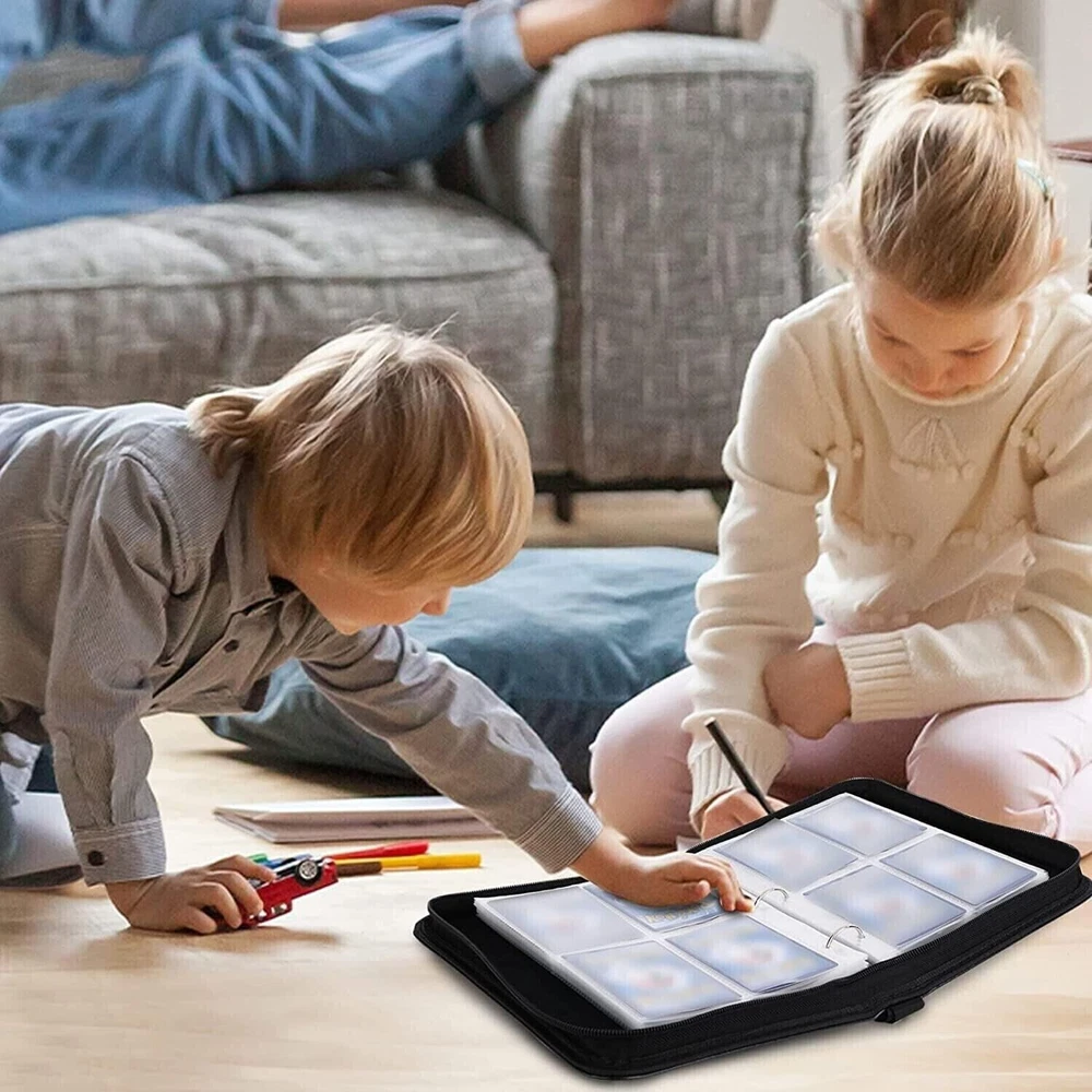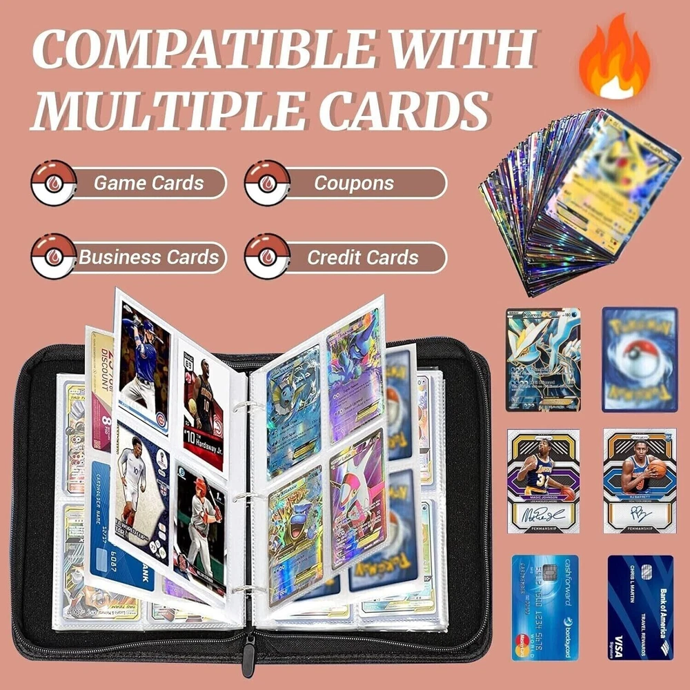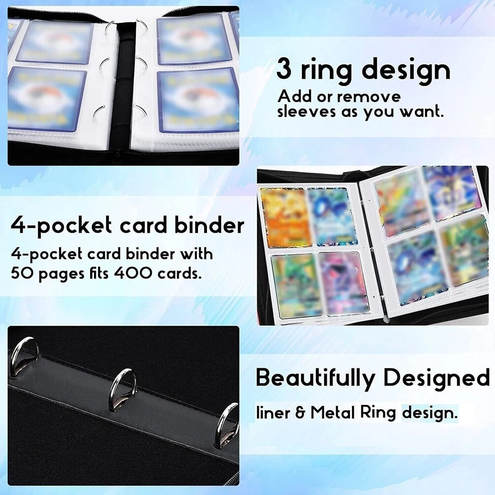 【Premium Material】The card binder album is waterproof EVA foam and PU leather, with good shock, dust-proof, and moisture resistance. The quality zipper seals the binder to keep the cards intact; an extra wristband design makes it easy to carry around. 【Huge Capacity】4 Pocket Binder Holder Trading Card, Fits 400 Cards with 50 Removable Sleeves; the 3-ring design is convenient for you to add or remove sleeves and meets all your collection needs. 【Wide Application】The trading card case is compatible with various standard-sized cards, MTG Card Game, Yu-Gi-Oh, Star Wars X-Wing, Football cards, Baseball cards, Playing cards, etc. 【Special Gift】Our card holder book has a unique design. It's a perfect gift for card lovers, card collectors, and your kid's friends. 【Customer Service】 Our promise you will get an excellent binder for the card collection album. If there are any problems with the card binder, please contact us without hesitation; we do our best to provide you with the best solution!