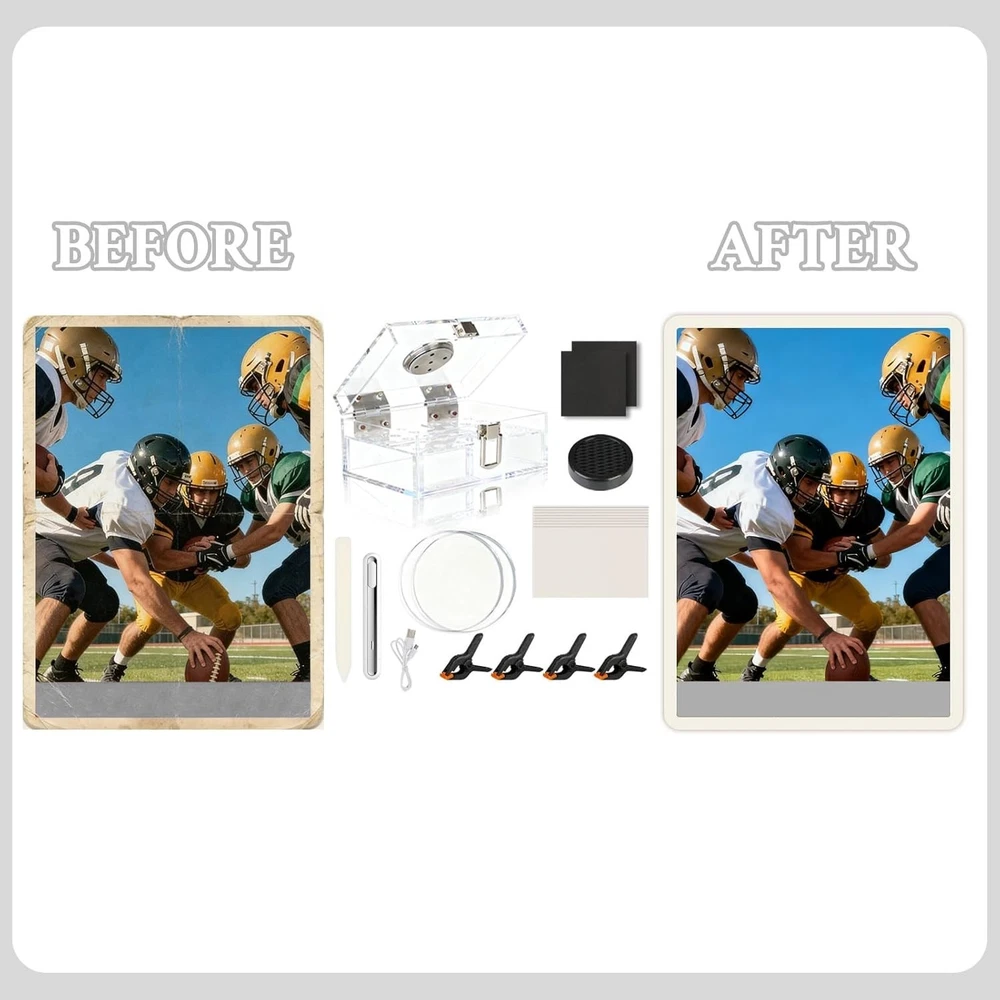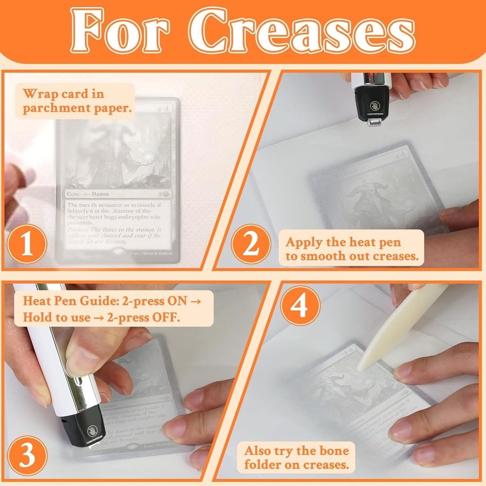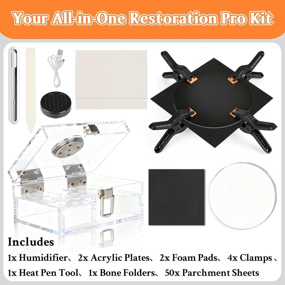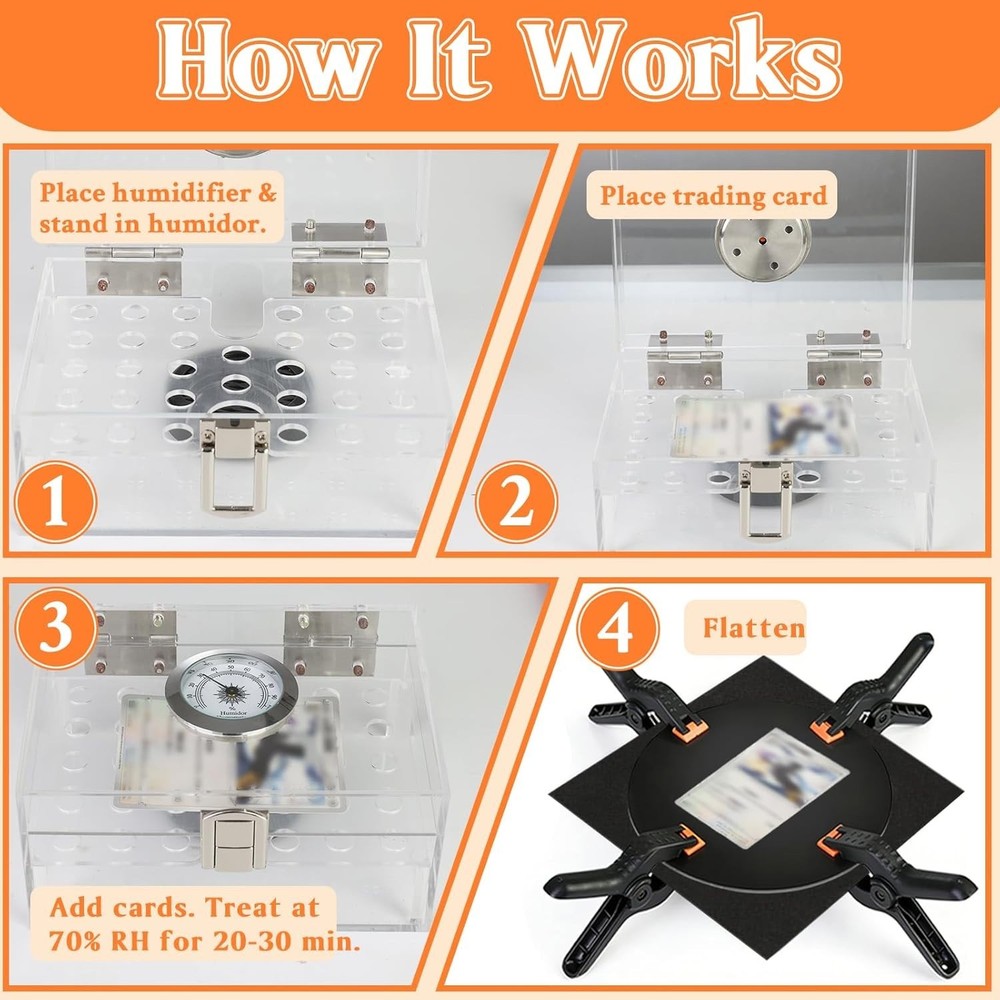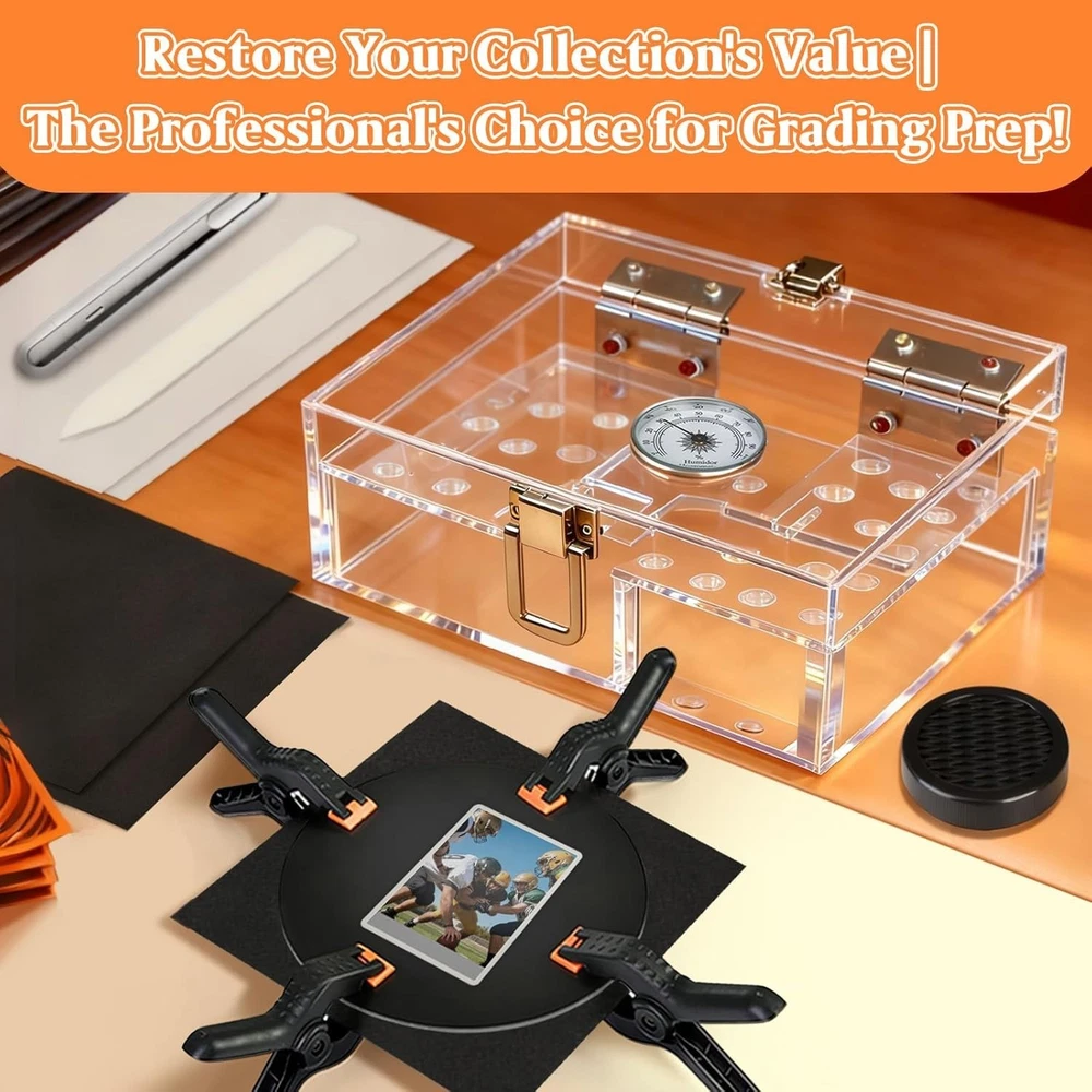 DEDC Card Cleaning Kit Flattening Restoration Repair Care Sport Card with Heat Pen, Acrylic Humidor and Accessories – Complete Solution for TCG Collectors and Enthusiasts. About this item: All-in-One Restoration Solution: This card restoration kit combines cleaning, moisturizing, and flattening functions, providing a comprehensive approach to card repair for avid collectors. Complete Cleaning Kit: 1x Humidifier、2x Acrylic Plates、2x Foam Pads、4x Clamps 、1x Heat Pen Tool、1x Bone Folders、50x Parchment Sheets Advanced Humidification: Our sports card accessories features built-in acrylic stands to elevate your cards, preventing direct contact with the base. This ensures even moisture distribution for effective softening while preparing them for flattening in this kit. Professional Flattening Tools: With our card flattening kit, you get acrylic plates and clamps to fix bends and lifted edges, offering a reliable solution for card restoration. Heat Pen Precision Repair: The included heat pen and thermal pen for cards allow for targeted thermal treatment to smooth creases, with appropriate temperature settings for safe use on various card types. Non-Guaranteed Outcome: This kit is designed for cleaning and surface enhancement only. It cannot repair structural damage, creases, or paper loss. Use of the repair kit may be considered "altered" by third-party grading services (e.g., PSA, BGS, SGC). Always test on a low-value card before applying to high-value assets. We are not responsible for any damage caused by improper application. Versatile Repair Options: As a versatile card repair kit, it handles multiple damage types, from dents to creases, making it ideal for sports cards, trading cards, and more. Precision Crease Restoration Workflow: Achieve the best repair results in 3 steps. First, Humidify the card to relax stiff fibers. Next, Flatten the card to correct warping and create a level surface. Finally, use the Thermal Pen to smooth out specific stubborn creases. Note: Always place a heat-resistant paper between the pen and the card during thermal repair to avoid damaging the card surface.